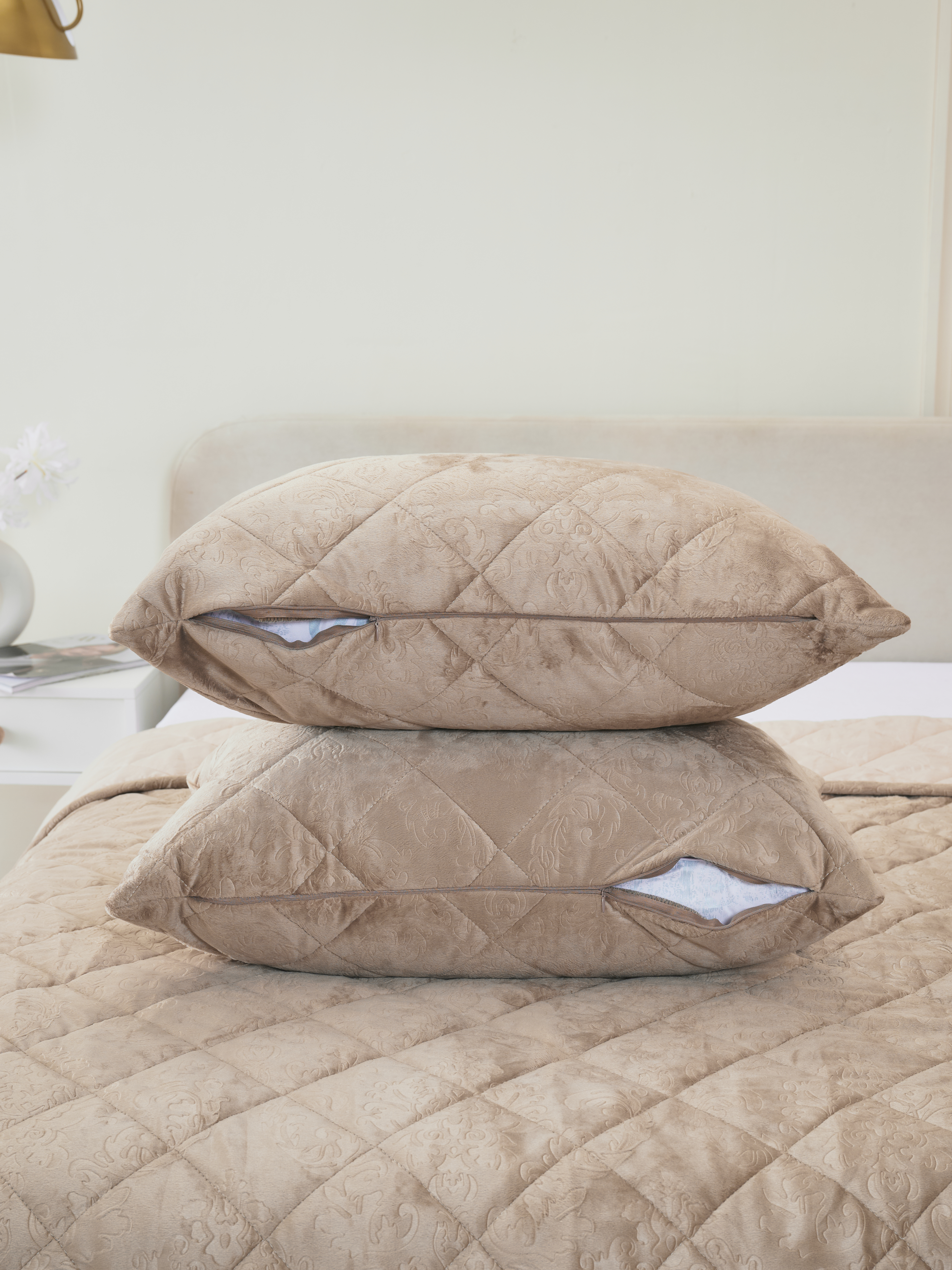 Погрузитесь в мир уюта с нашим набором, включающим в себя покрывало из микрофибры и чехлов на подушку, выполненных из высококачественного велюра. Мягкое и приятное на ощупь покрывало создано для безмятежной атмосферы в вашей спальне или гостиной. Его нежная текстура не только добавляет интерьеру стиля, но и обеспечивает легкость в уходе, благодаря своей устойчивости к загрязнениям и быстрому высыханию, после стирки. Чехлы с молнией надежно защищают ваши подушки и обеспечивают легкость и удобство, при уходе. Этот комплект станет идеальным решением для тех, кто ценит комфорт и элегантность в каждой детали.