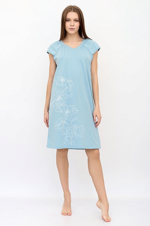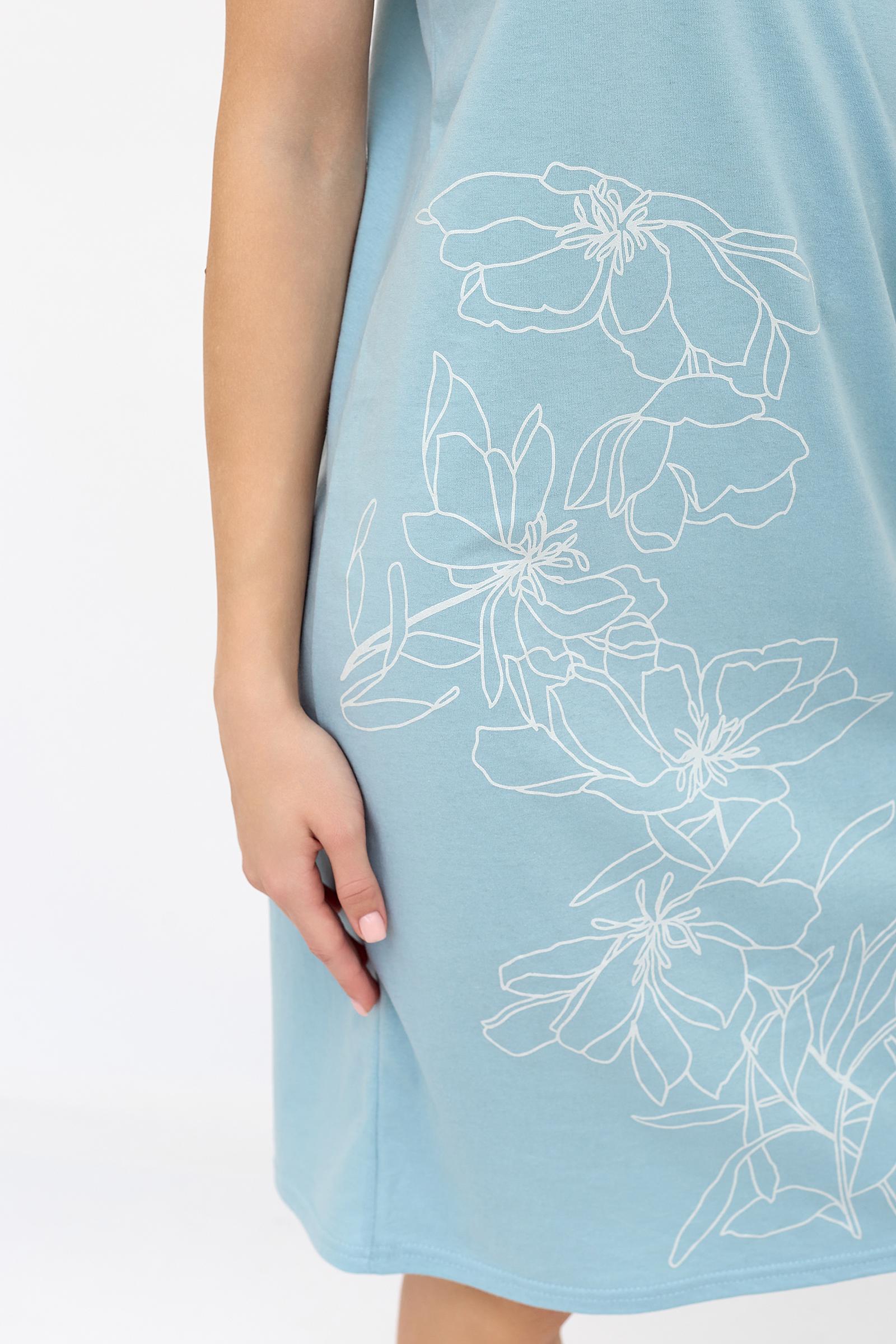 Женская ночная сорочка прямого кроя из качественного хлопкового полотна. Состав ткани и крой сорочки окунут вас в комфортный и сладкий сон. Сорочка с коротким рукавом – реглан. Красивый V-образный вырез горловины с декоративными пуговицами. Длина сорочки до коленей. Полочку украшает крупный принт в виде цветов.