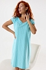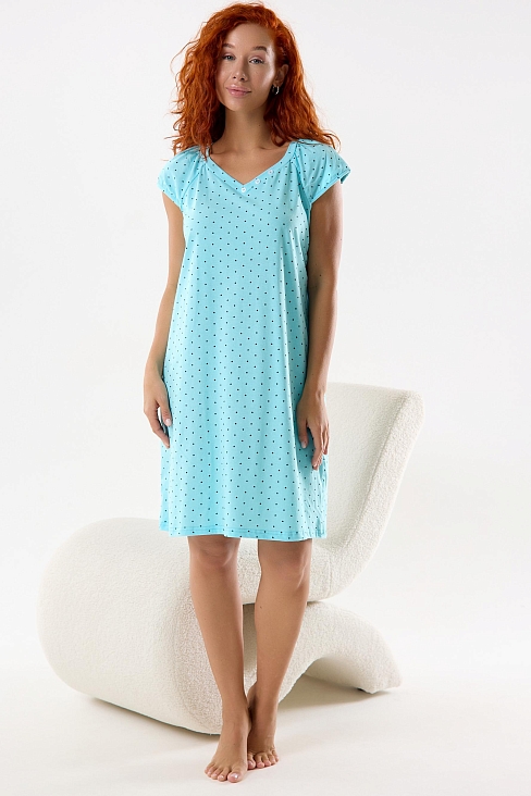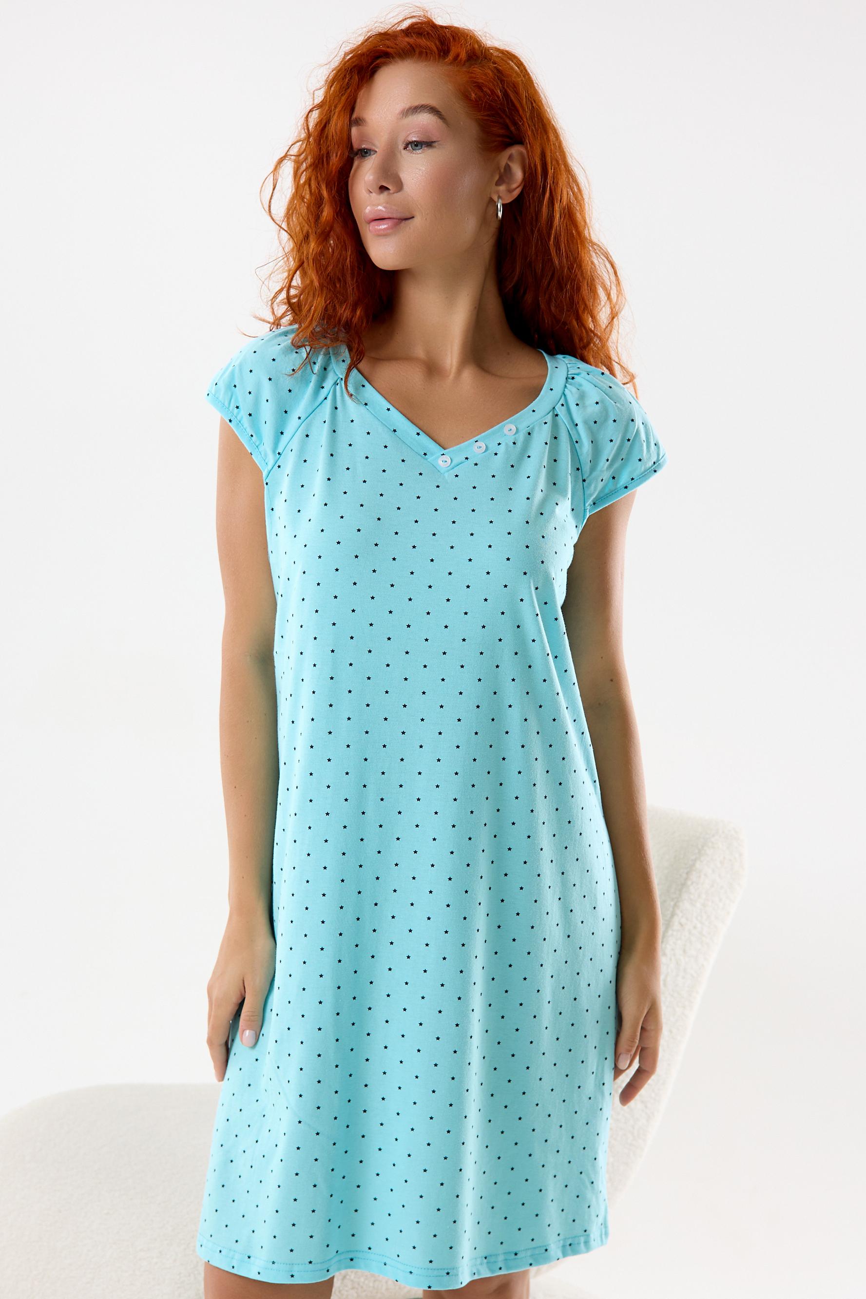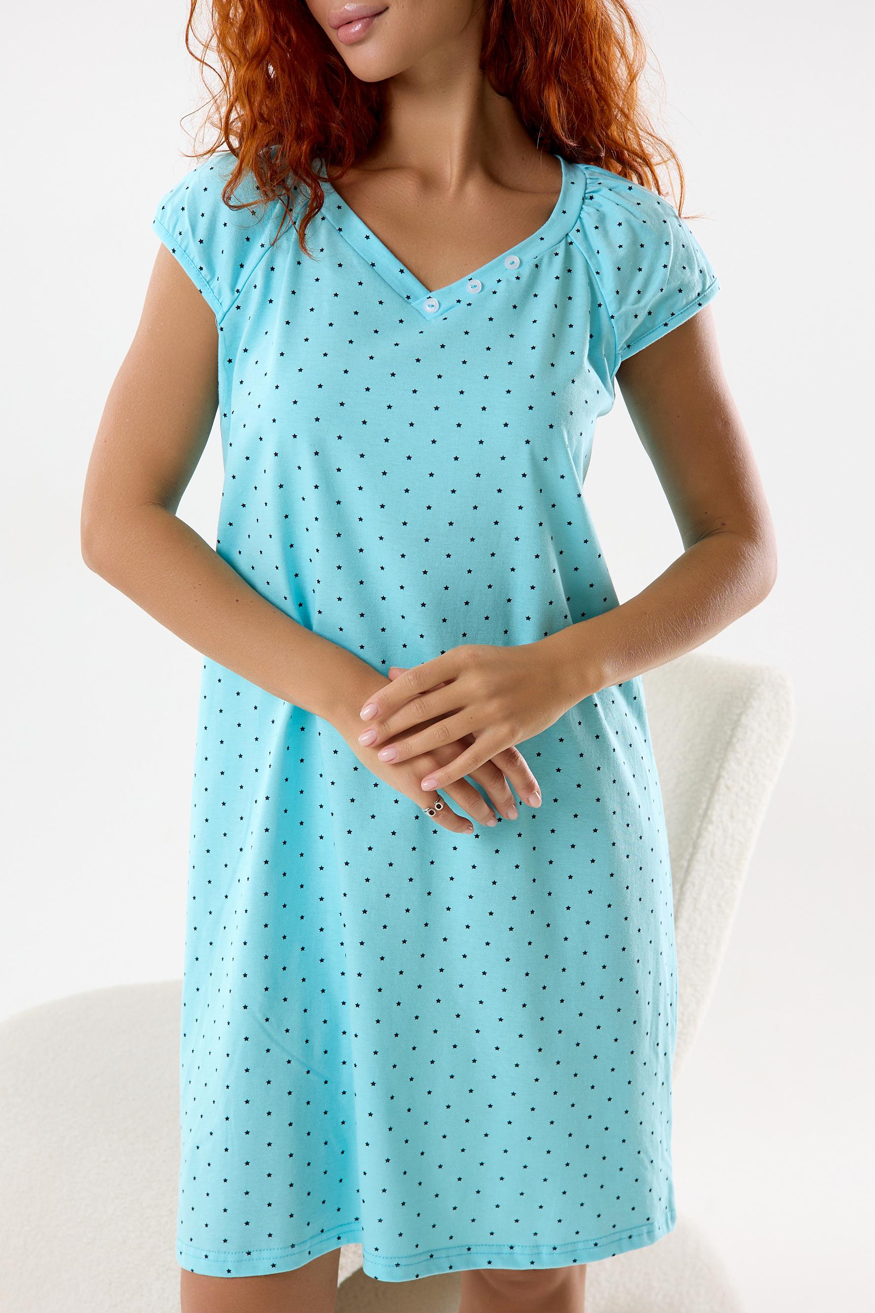 Женская ночная сорочка прямого кроя из качественного хлопкового полотна. Состав ткани и крой сорочки окунут вас в комфортный и сладкий сон. Сорочка с коротким рукавом – реглан. Красивый V-образный вырез горловины с декоративными пуговицами. Длина сорочки до коленей. Полочку украшает крупный принт в виде цветов.