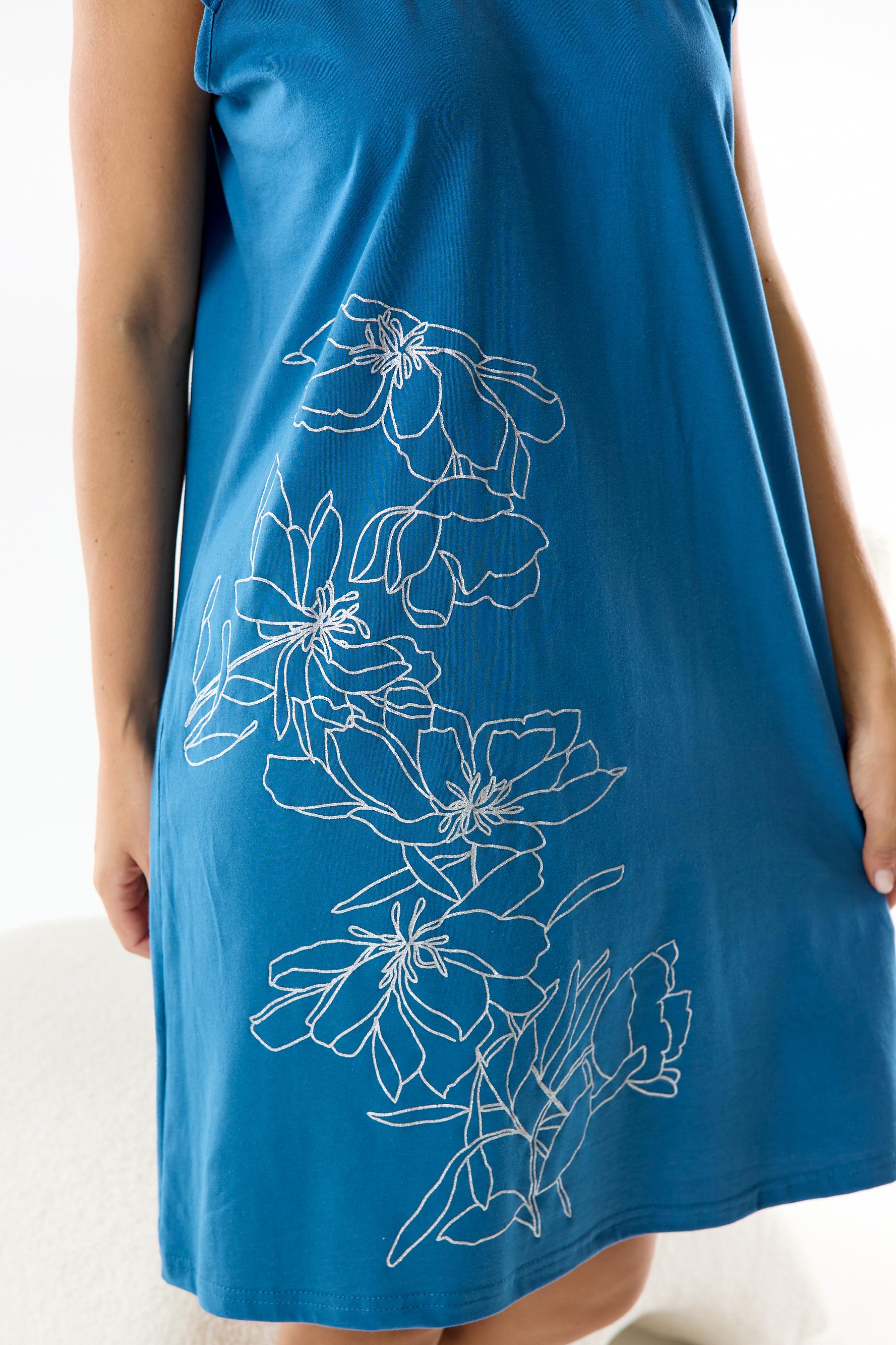 Женская ночная сорочка прямого кроя из качественного хлопкового полотна. Состав ткани и крой сорочки окунут вас в комфортный и сладкий сон. Сорочка с коротким рукавом – реглан. Красивый V-образный вырез горловины с декоративными пуговицами. Длина сорочки до коленей. Полочку украшает крупный принт в виде цветов.