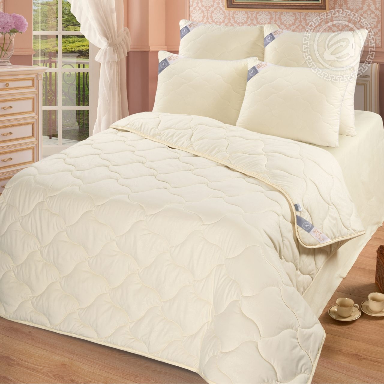 Чехлы одеял выполнены из современного, дышащего и мягкого на ощупь материала - микрофибра. Состав: высокомолекулярное полиэфирное волокно, плотность ткани - 115 гр/м2. Ткань имеет сатиновое переплетение, рисунок нанесен способом термического тиснения. Стежка производится на многоигольной стегальной машине с использованием 19 игл, что делает ее более плотной и равномерной.
