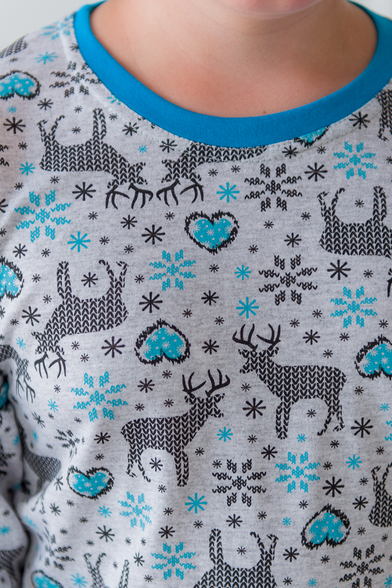 Пижама подростковая из джемпера и брюк из кулирки Олененок голубой из трикотажного полотна, 100% хлопка. Уютная домашняя одежда состоит из кофты с длинным рукавом и брюк. Штаны на резинке, толстовка прямого кроя.
