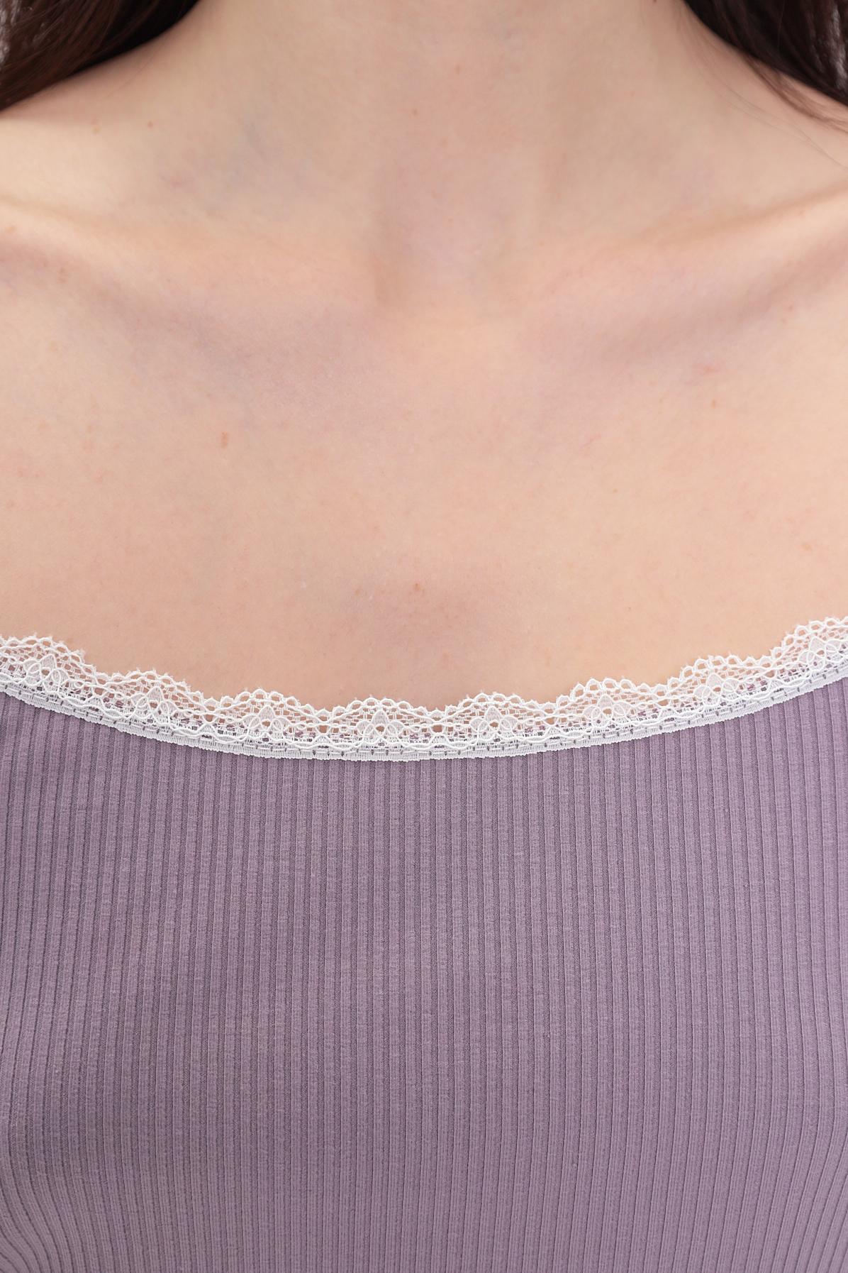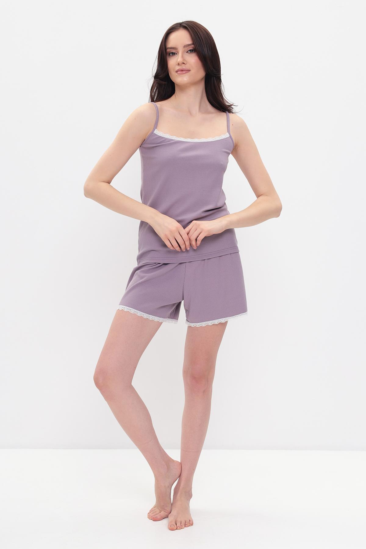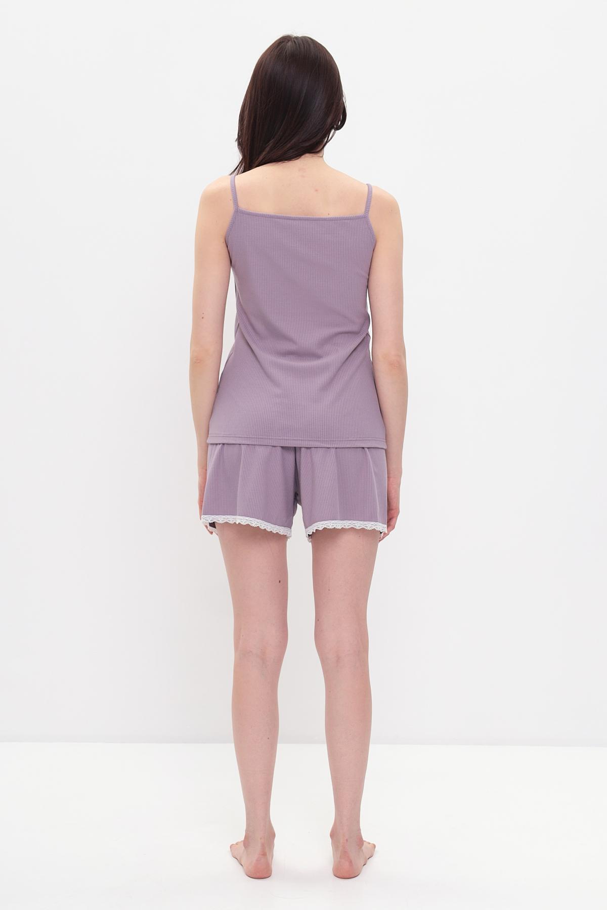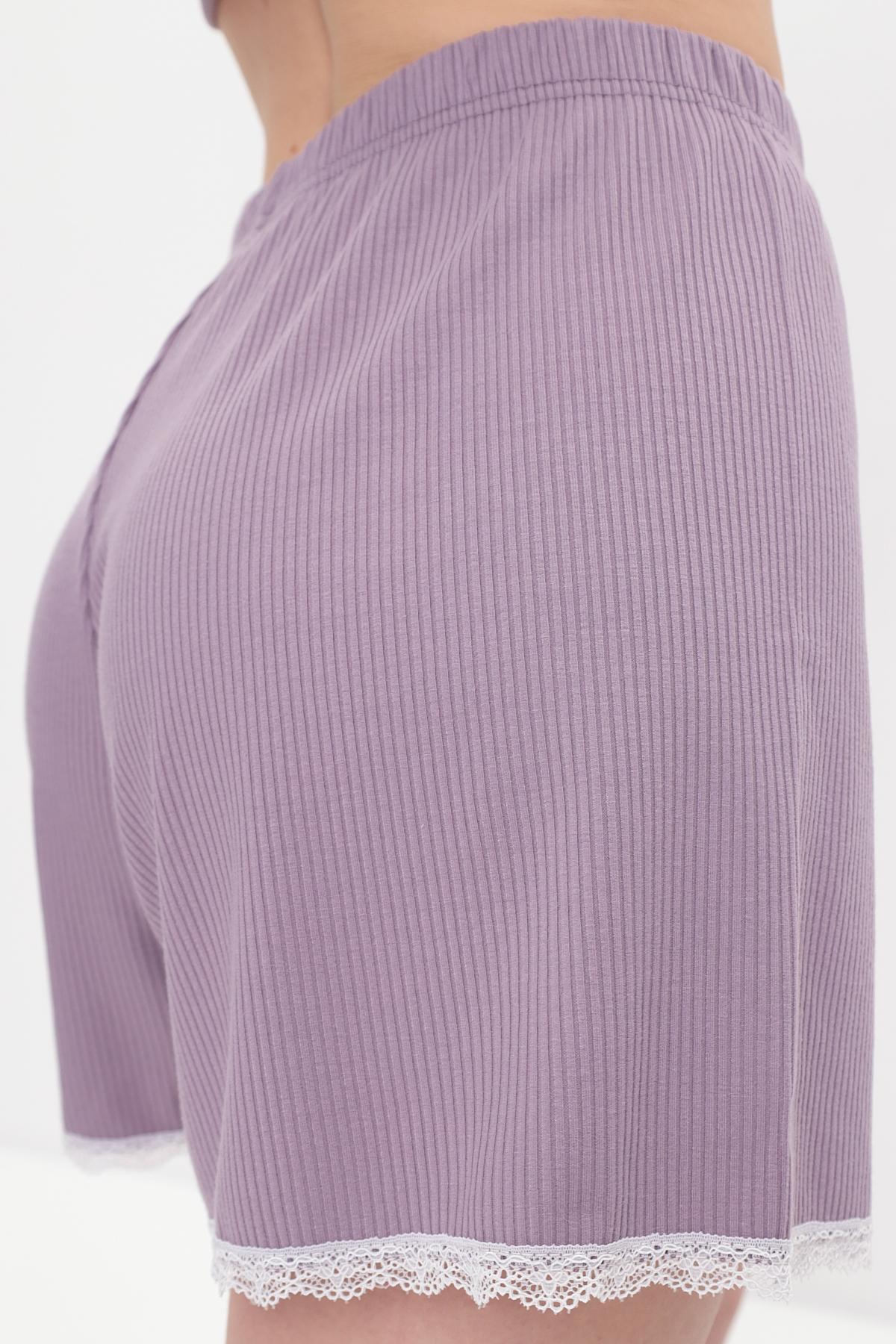 Ткань в рубчик придаст домашнему образу воздушности и нежности. Шорты на резинке, средней посадки - самый удобный вариант для дома и сна. Акцент в виде кружева делает эту пижаму очень женственной и милой.