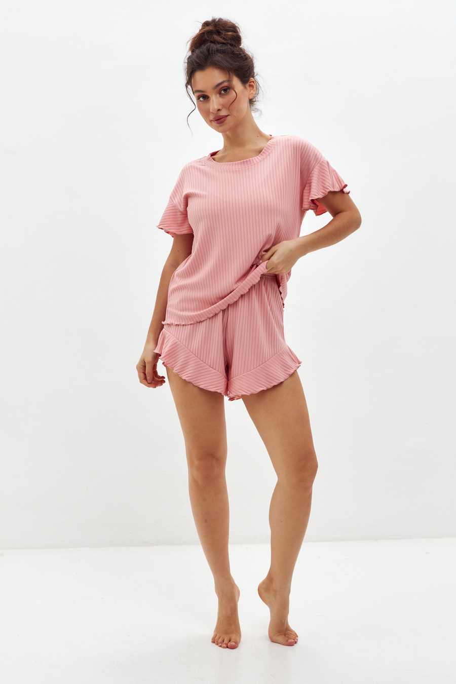 Элегантная пижама из лапши Бабочка станет идеальным выбором для комфортного домашнего отдыха. Модель выполнена в изысканных расцветках, которые прекрасно подходят для создания уютного домашнего образа, и имеет широкий размерный ряд.
