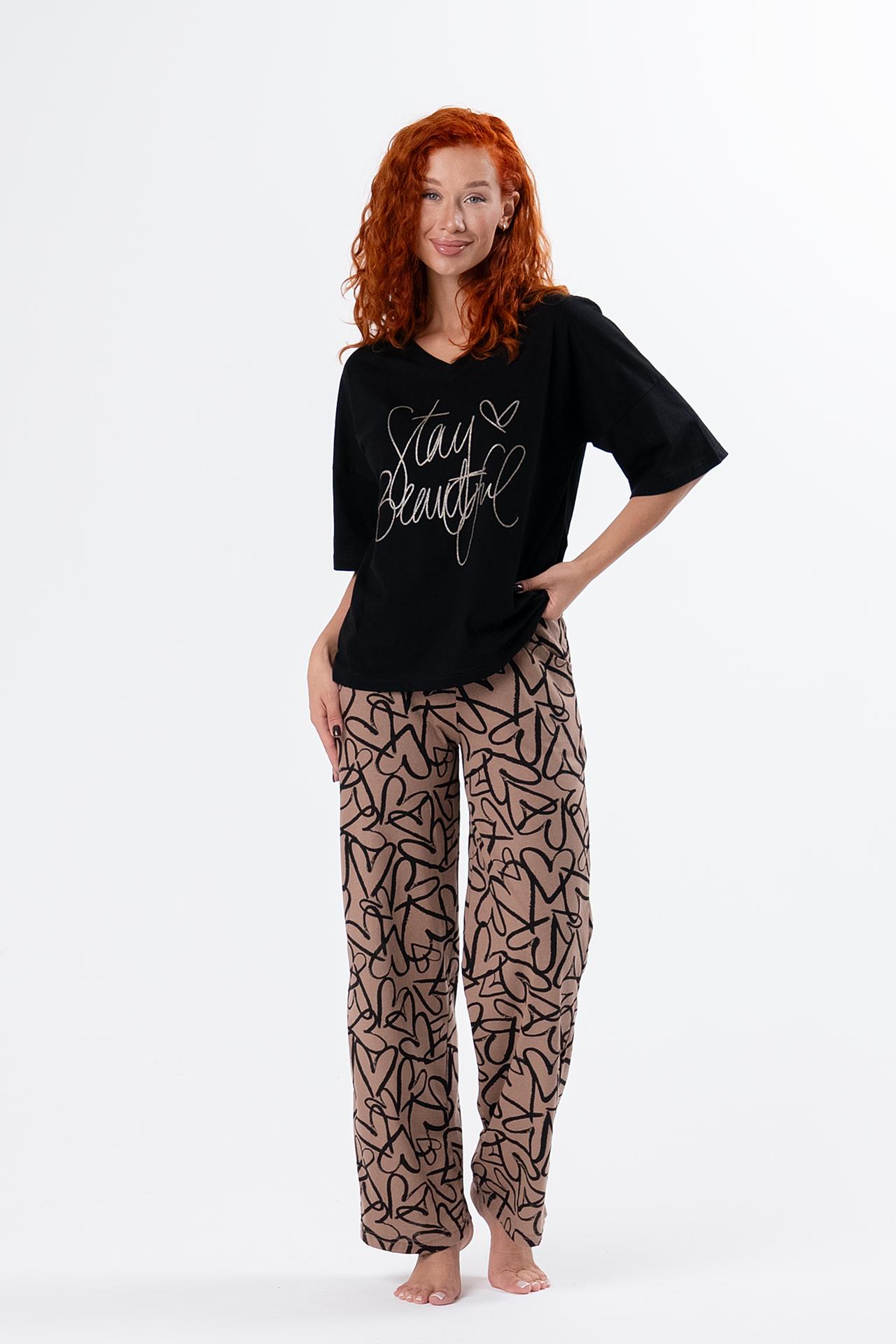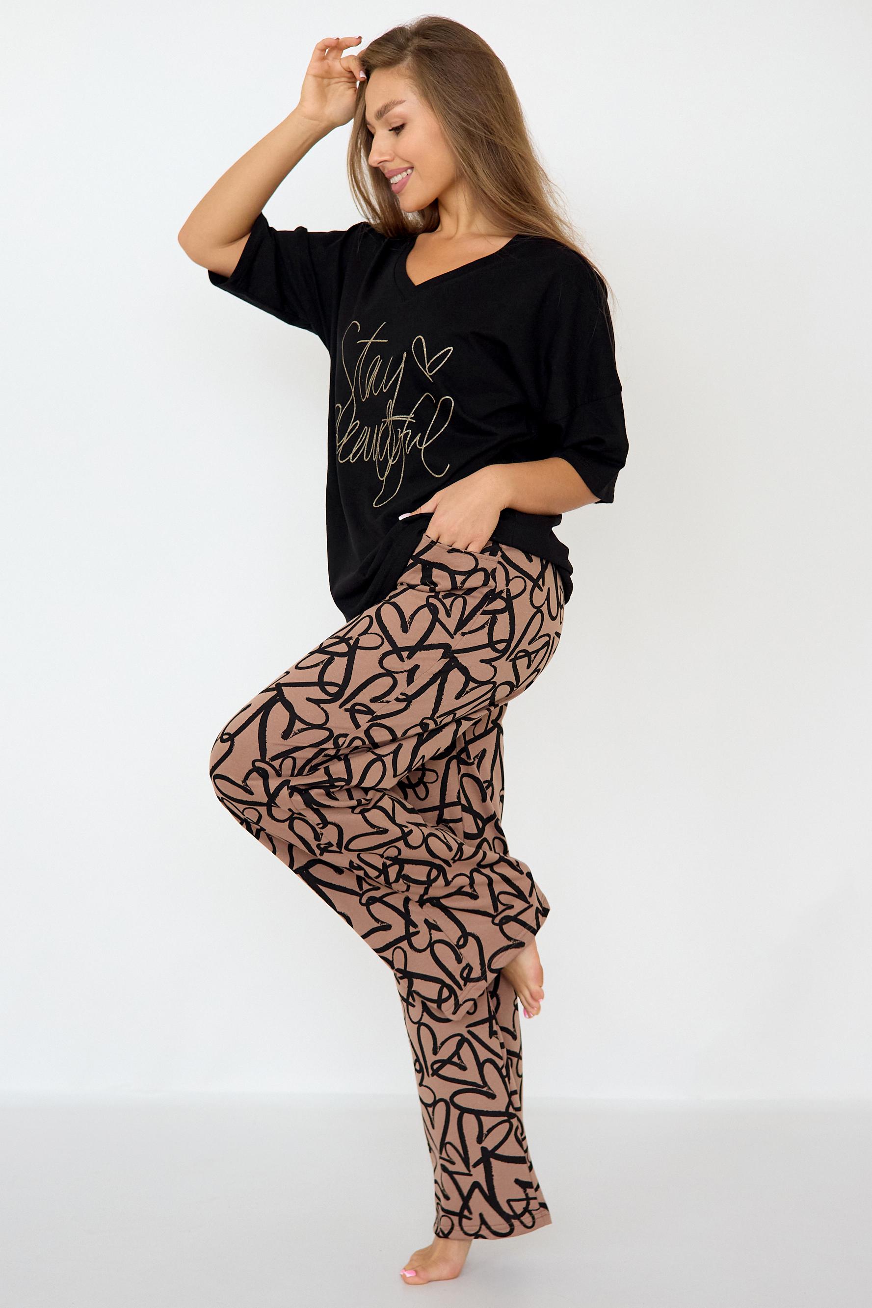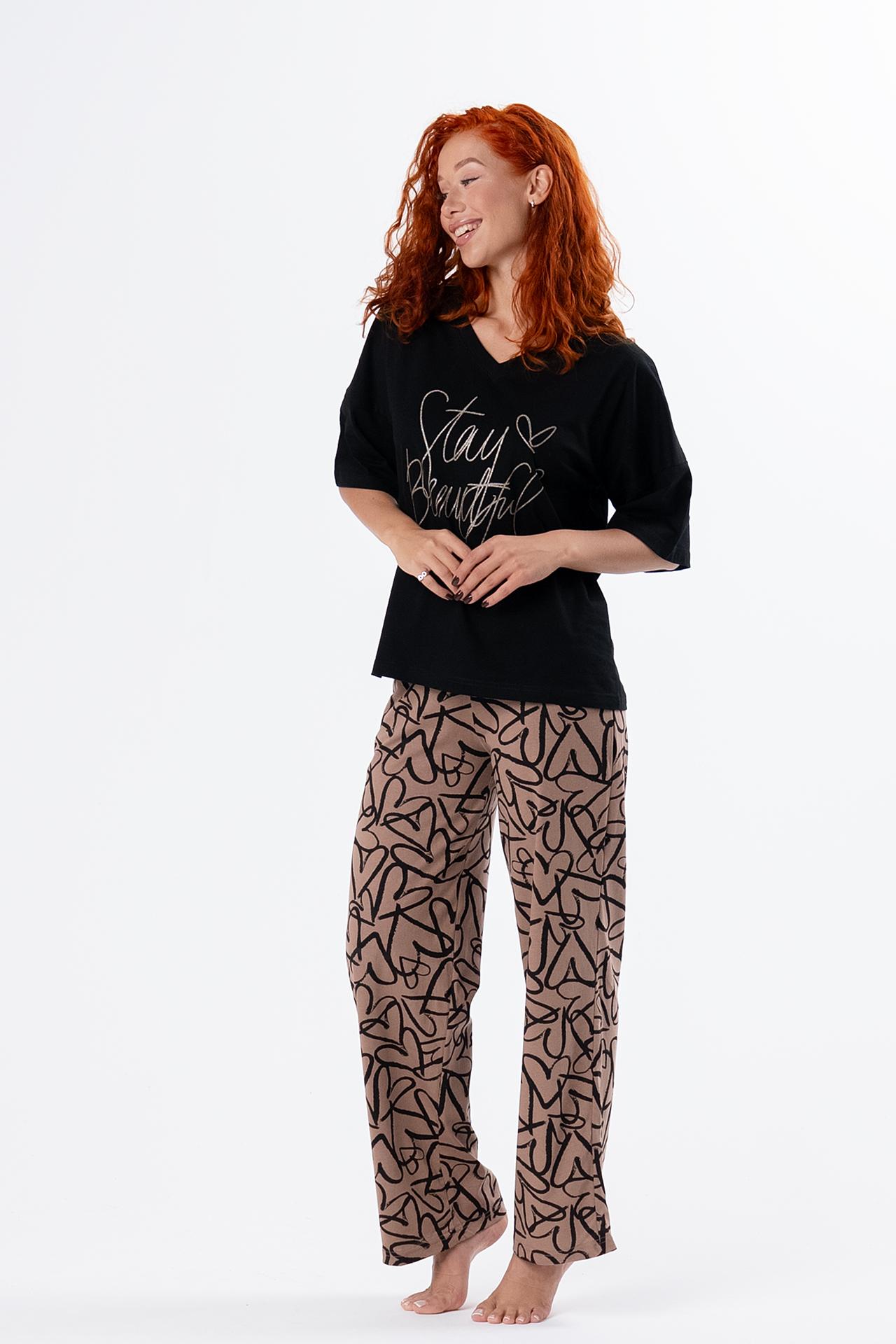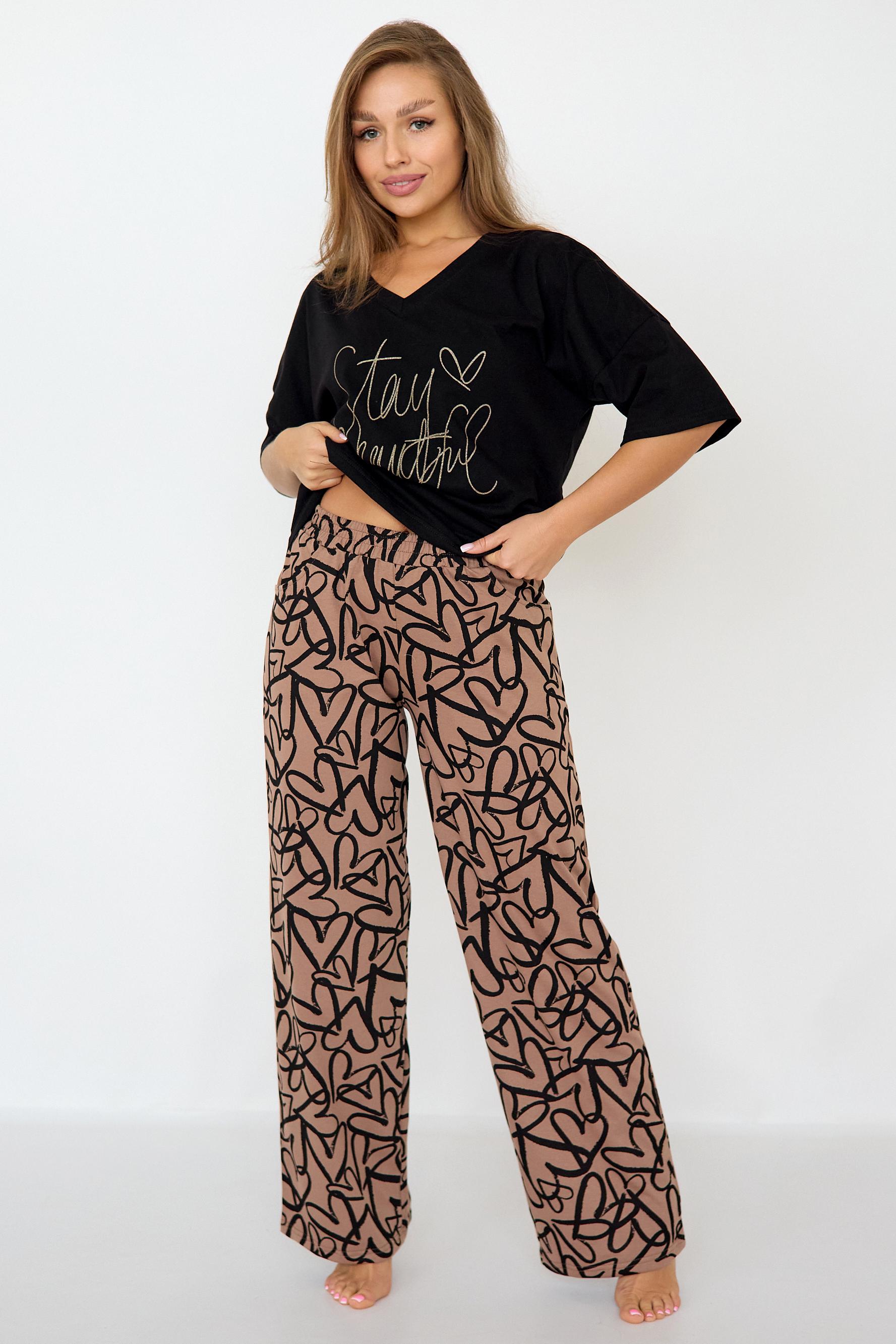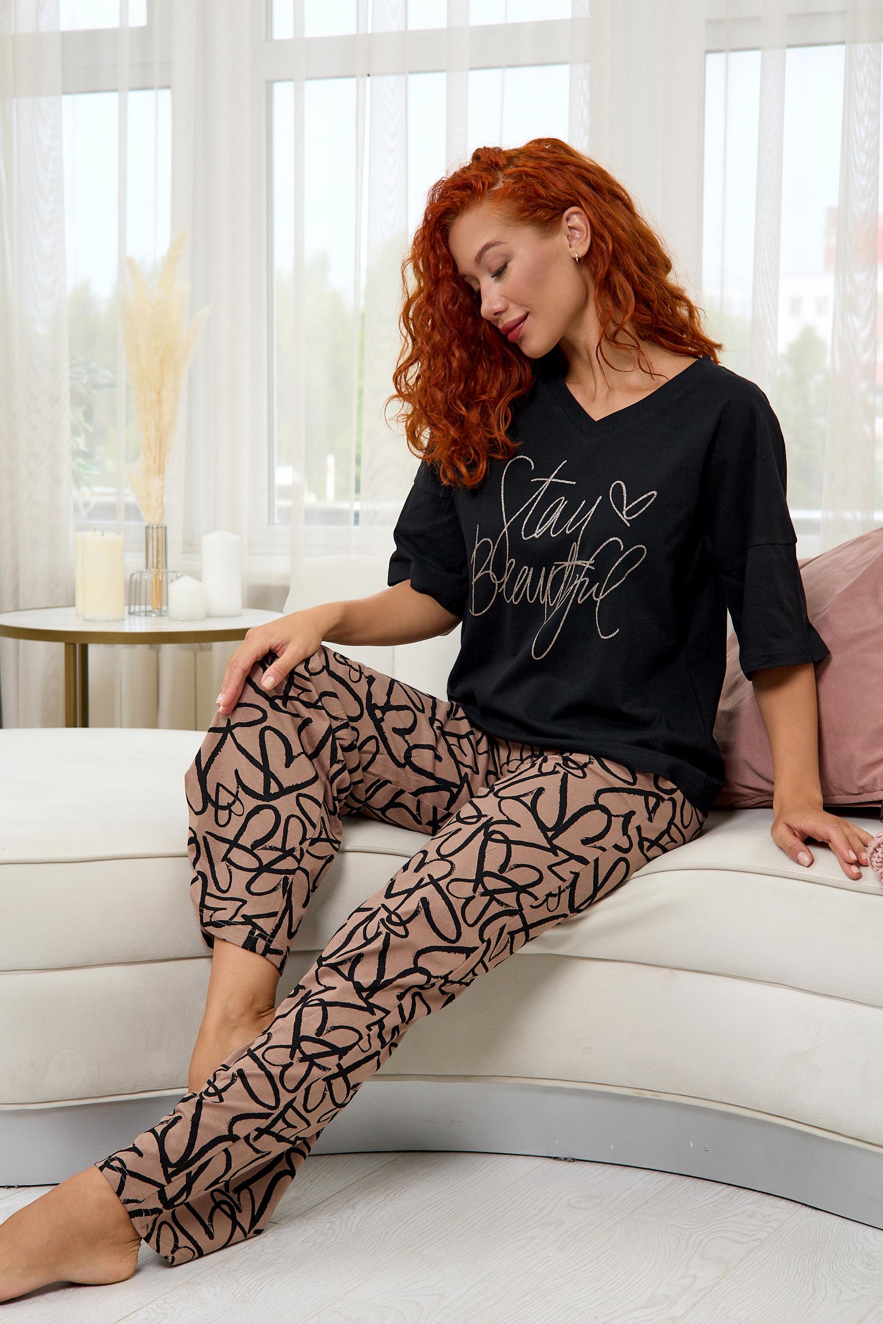 Стильная женская пижама с брюками из легкой хлопковой ткани.