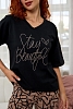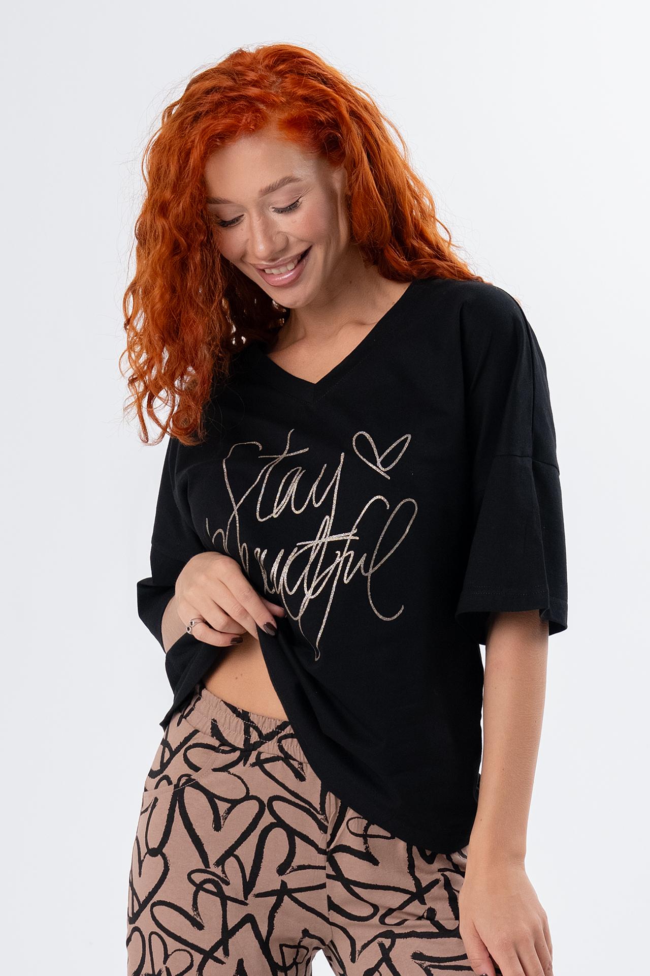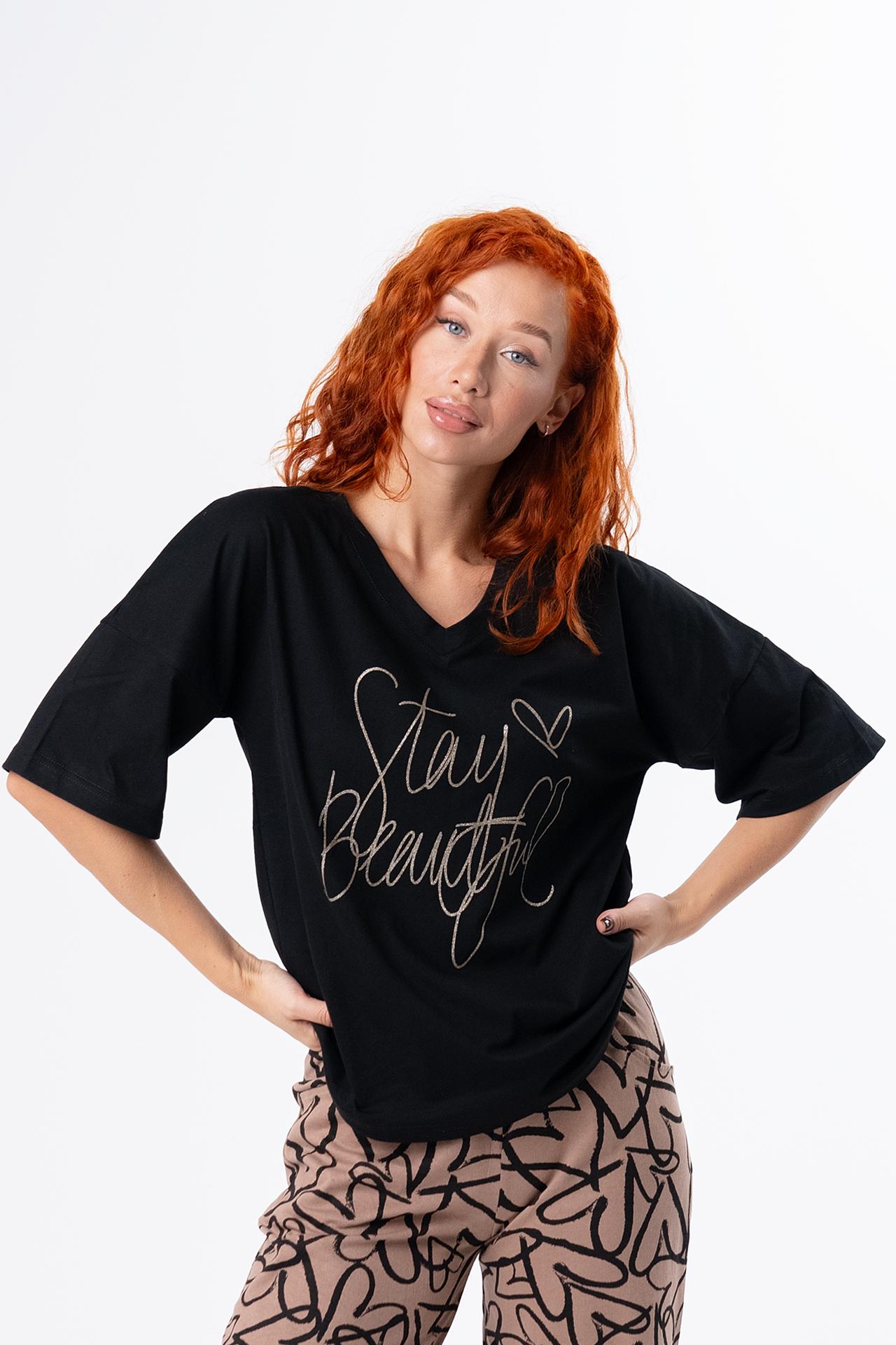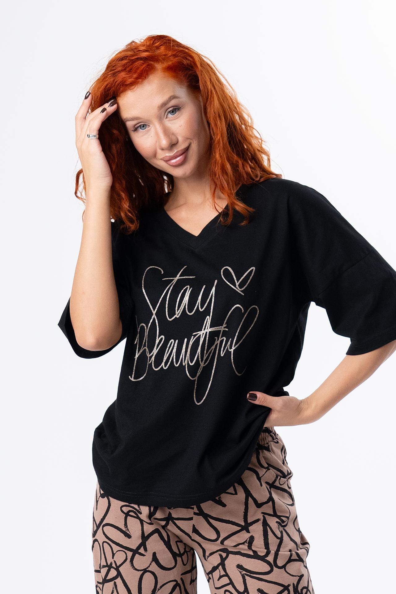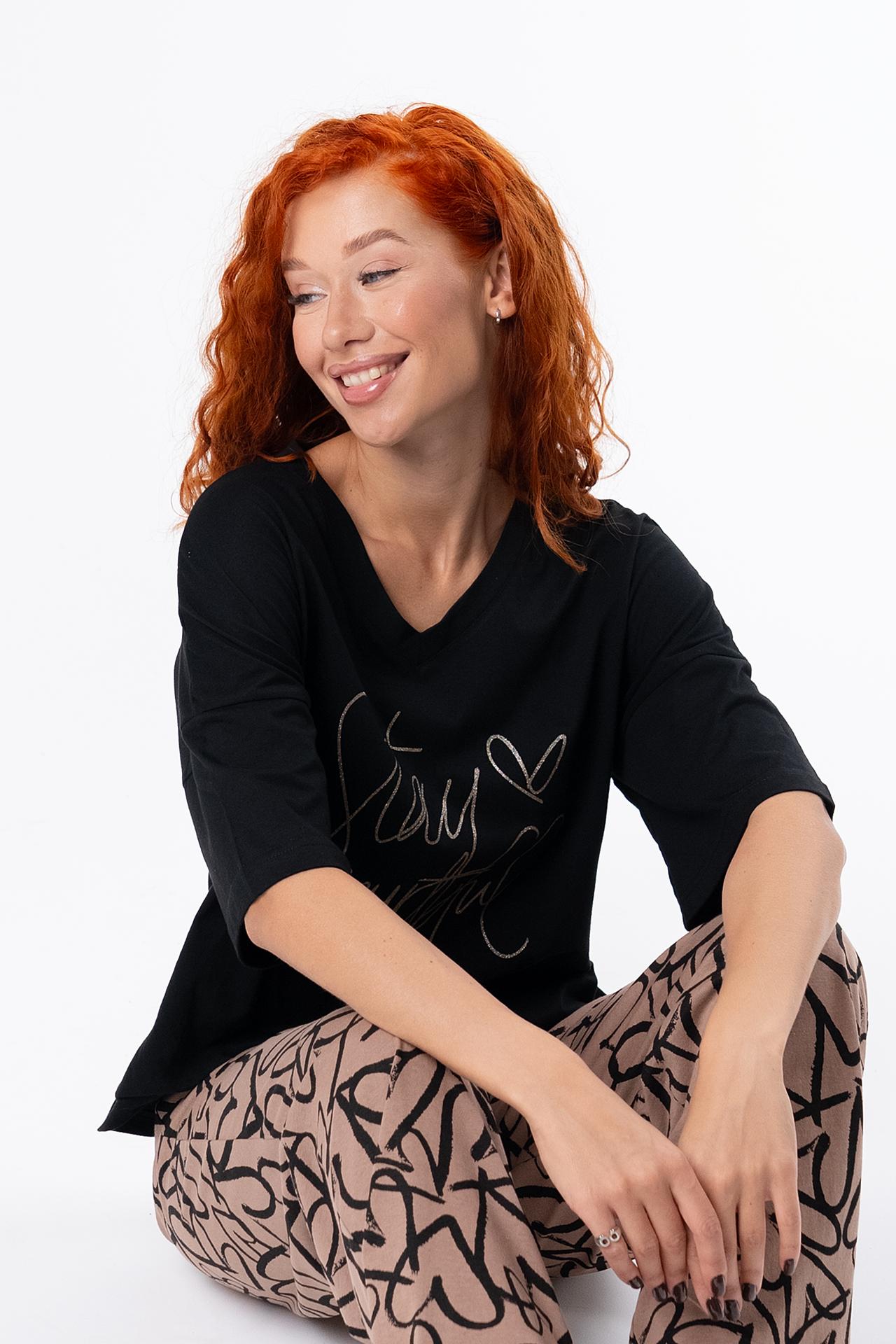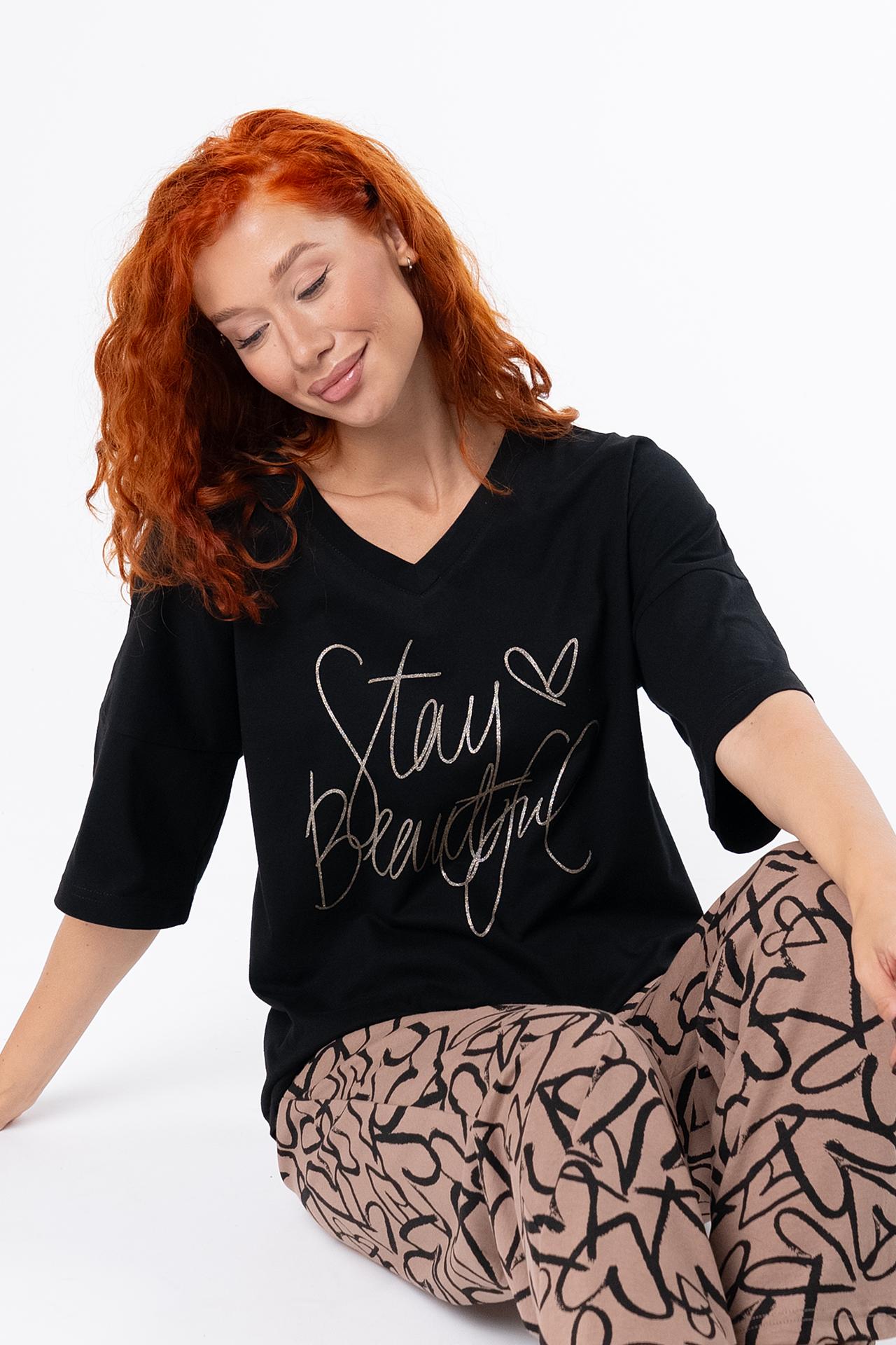 Стильная женская пижама с брюками из легкой хлопковой ткани.