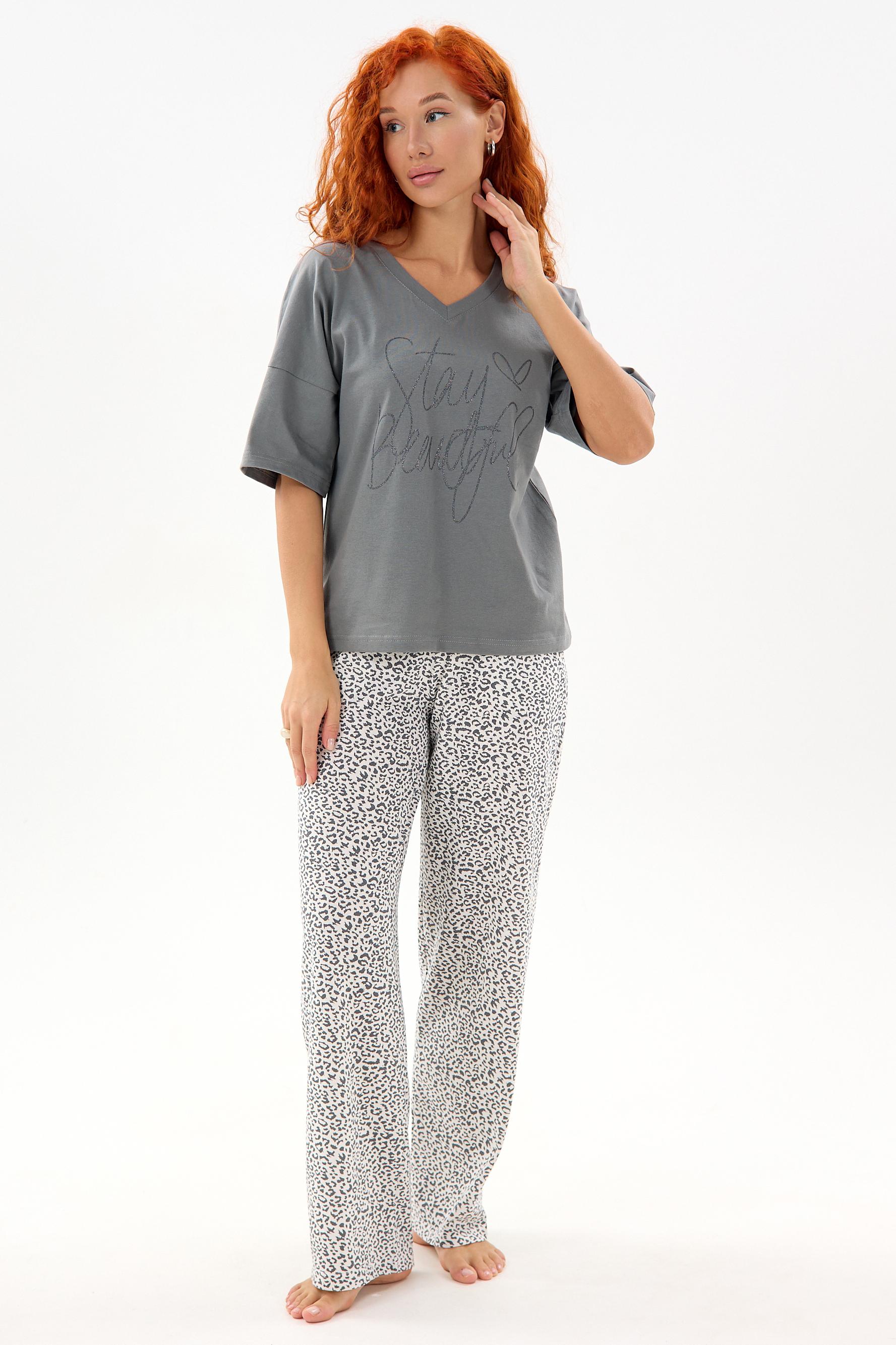 Пижама из 100% хлопка, мягкая, дышащая и комфортная к телу. Комплект состоит из футболки с V-образным вырезом и прямых брюк на резинке с удобными карманами. Благодаря стильному свободному крою её можно использовать не только для сна, но и как полноценную домашнюю одежду. Широкий размерный ряд позволяет подобрать идеальный вариант для любой фигуры.