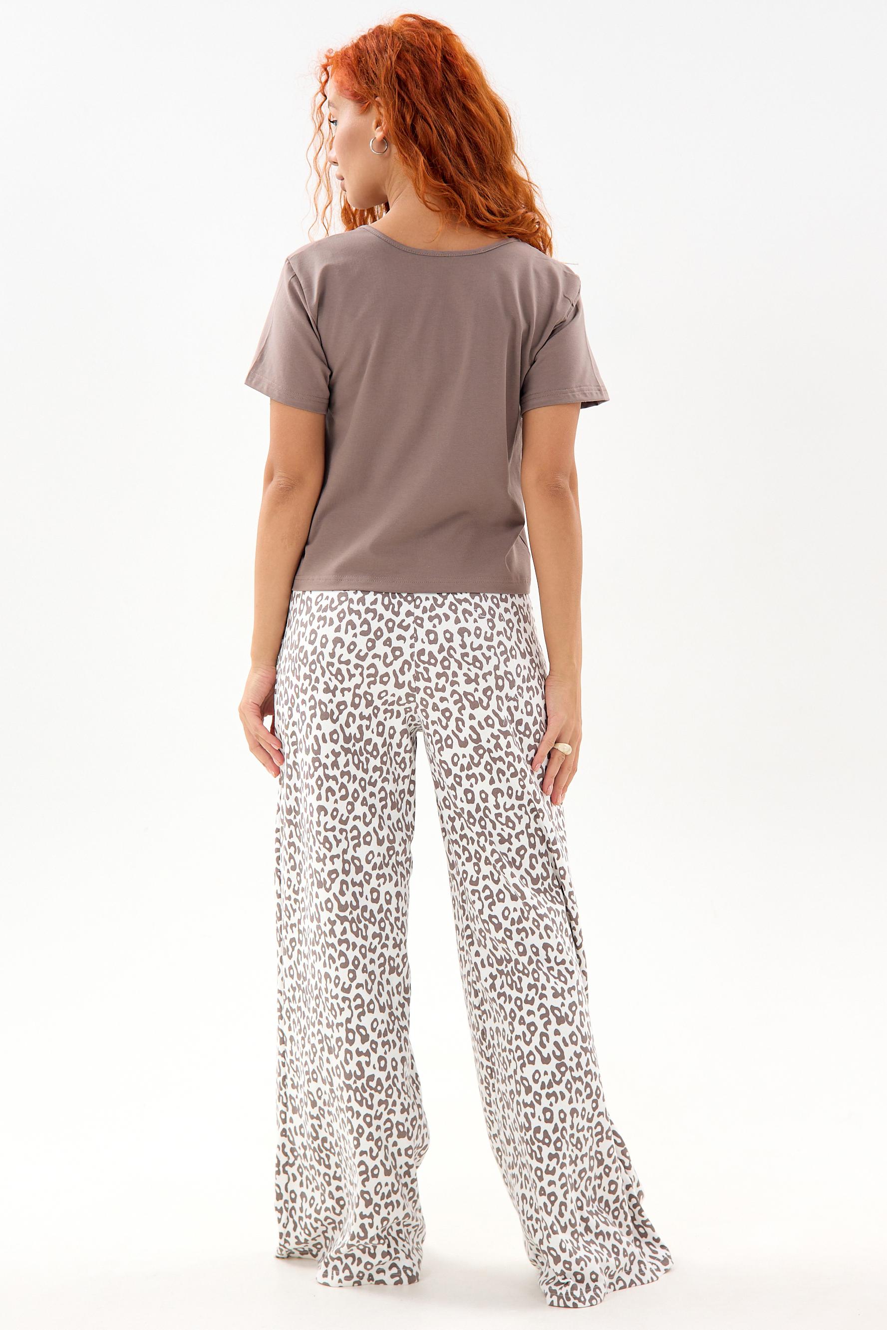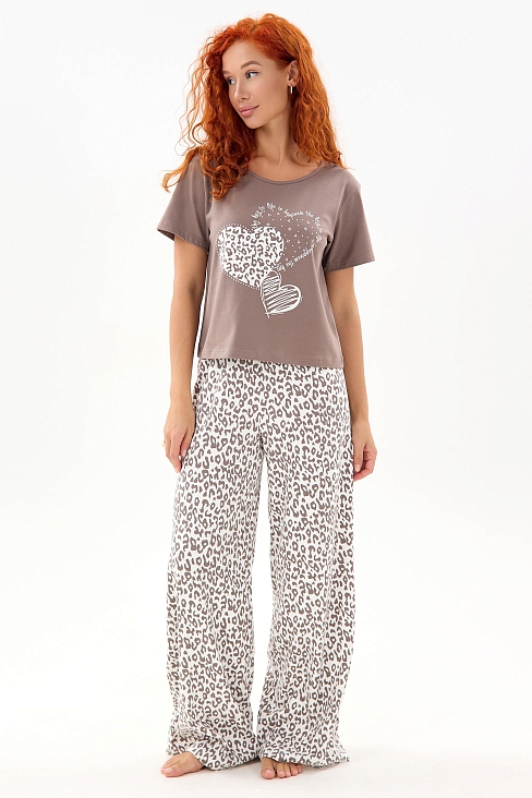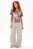 Стильная и комфортная пижама, созданная для уютного отдыха и сна. Модель отличается удобной посадкой и модным силуэтом, который красиво смотрится на разных типах фигуры и не сковывает движений. Футболка выполнена из кулирки — 100% хлопка: мягкой, дышащей и приятной к телу ткани, идеально подходящей для повседневного комфорта. Материал хорошо пропускает воздух и сохраняет форму даже после многократных стирок. Брюки изготовлены из ткани «лапша» с составом 95% хлопок, 5% лайкра. Благодаря добавлению лайкры материал отличается повышенной износостойкостью, не вытягивается и отлично держит форму, обеспечивая свободу движений и комфортную посадку. Пижама представлена в широкой размерной сетке, что позволяет подобрать идеальный вариант для любой фигуры. Отличный выбор для тех, кто ценит качество, комфорт и актуальный дизайн в домашней одежде. Брюки на резинке, без карманов.