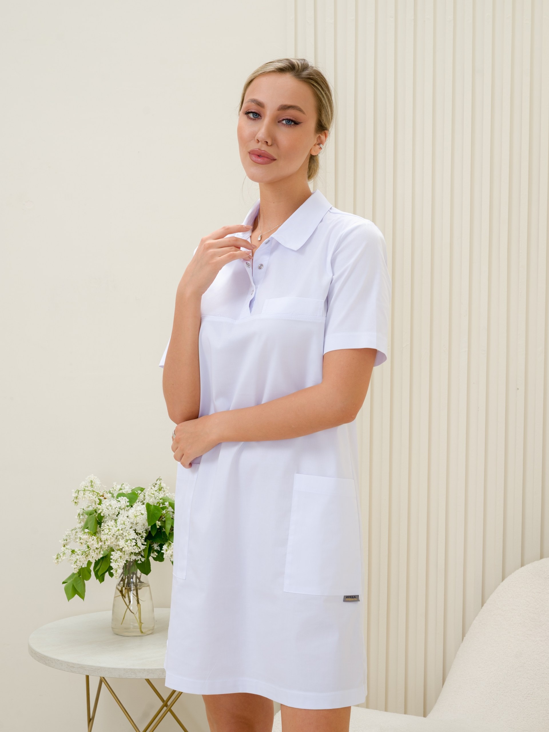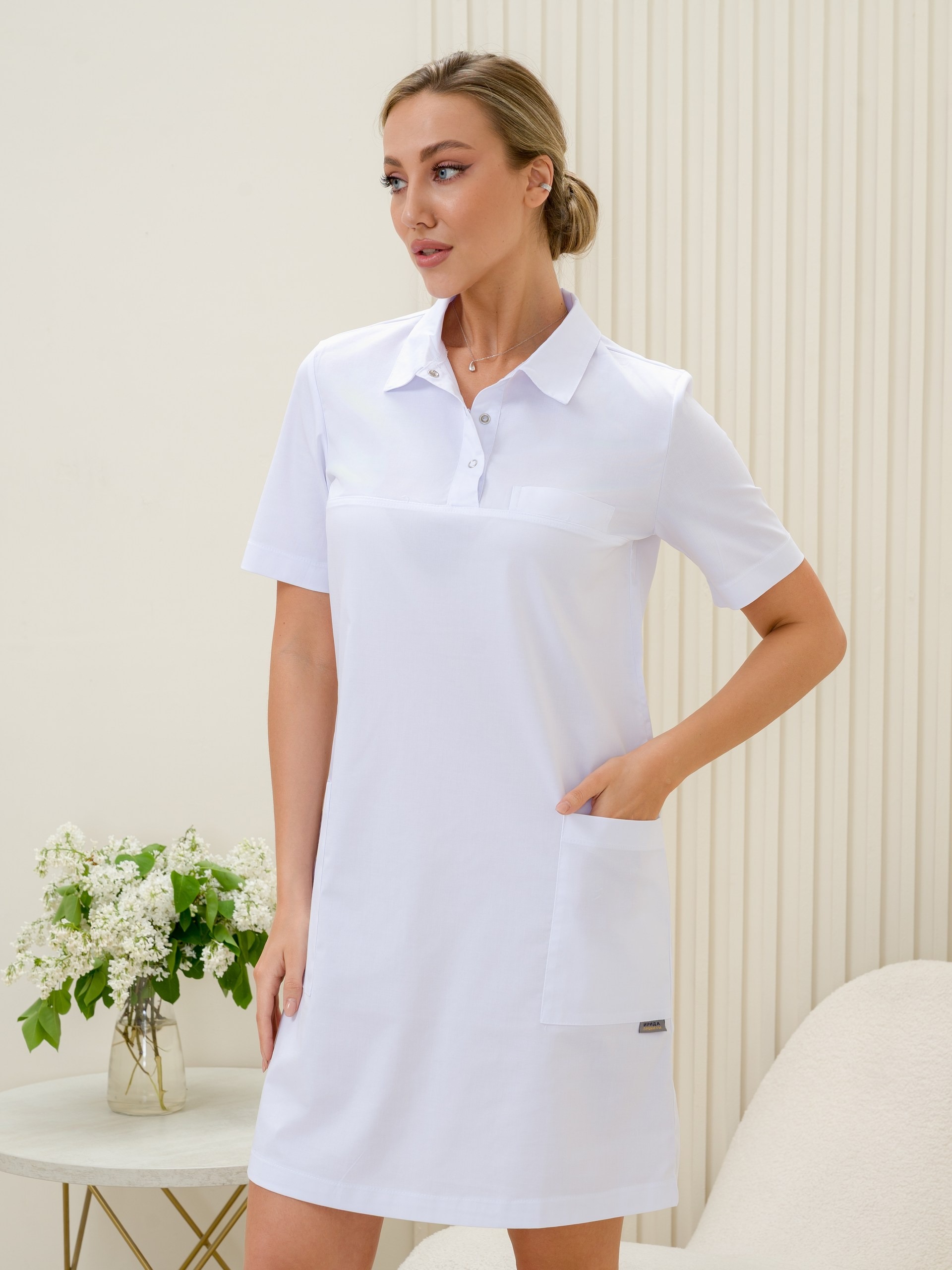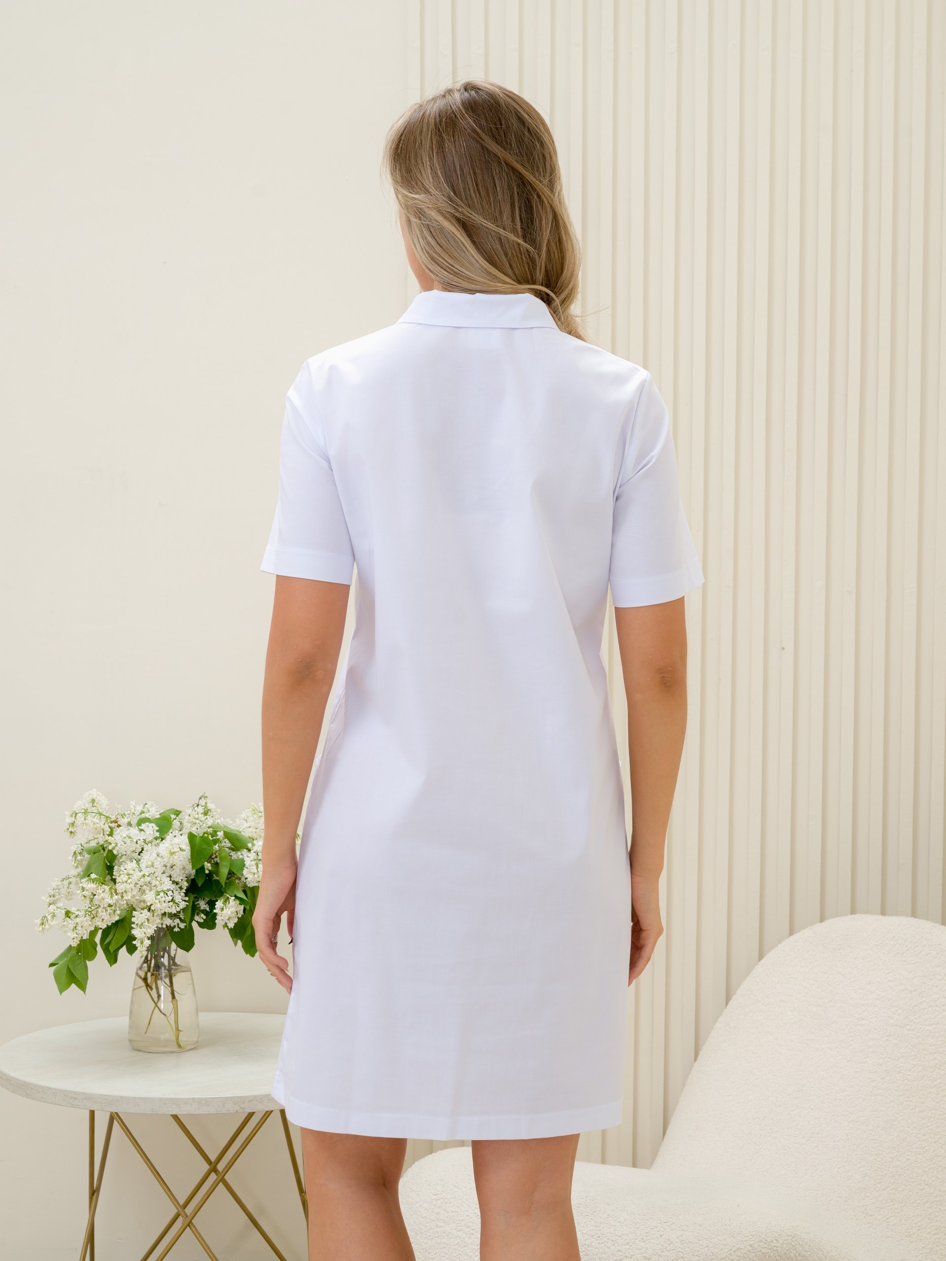Платье - Поло женское, с классическим отложным воротником, в белом цвете и рукавом средней длинны. Широкий размерный ряд (40 - 56). Ткань, Элит-145/Стрейч, с содержанием 35% хл, 62% п/э, 3% спандекс, с плотностью 145 г/м2.