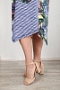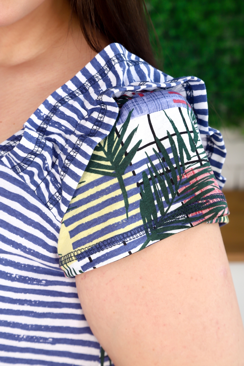 Платье женское, расширенное к низу. Полочка и спинка состоит из двух симметричных частей из тканей компаньонов: полоса и пальмы. На полочках накладные карманы. Рукав втачной, укороченный. На плече рюши, имитирующие бретель. Низ платья с углами, длина по спинке замерена от плечевой точки до верхнего угла низа.