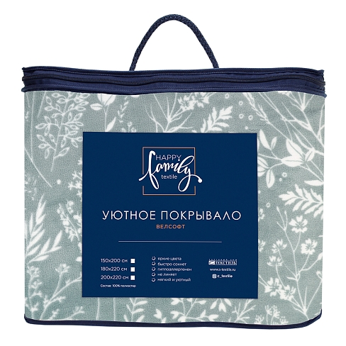 Покрывало Велсофт Happy Family - удобная и практичная вещь. Мягкое, приятное на ощупь, невесомое, его можно использовать в качестве пледа. Оно очень хорошо стирается и мгновенно высыхает, не теряя при этом ни формы, ни яркости расцветки. Достоинства: можно стирать в стиральной машине, не линяет.
