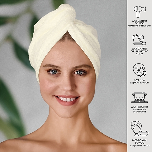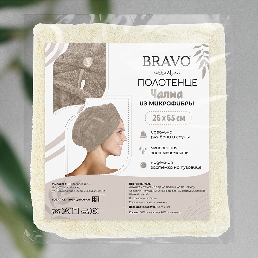 Полотенце-чалма для волос, изготовлено из микрофибры. Произведено в Китае, состав : 80% полиэстер, 20% полиамид, плотность 300г/м2. Каждое полотенце в индивидуальном п/п пакете, есть картонная карточка с описанием товара. Материал микрофибра - достойная альтернатива хлопку, не уступает в потребительских свойствах, при этом значительно дешевле. Такие полотенца нужны и дома, и в бане или сауне.