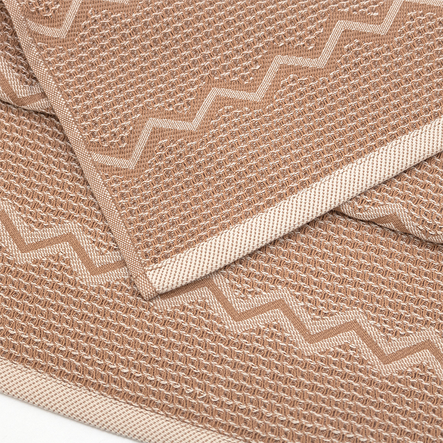 Полотенца Зигзаг произведены в Узбекистане из 100% хлопка. Это пестротканые жаккардовые вафельные полотенца, плотность 350г/м2. Полотенца отлично впитывают влагу, отлично подходят для использования в ванной комнате или в бассейне (размеры 70*140см и 50*90см), или на кухне (размер 40*60см, с петелькой).