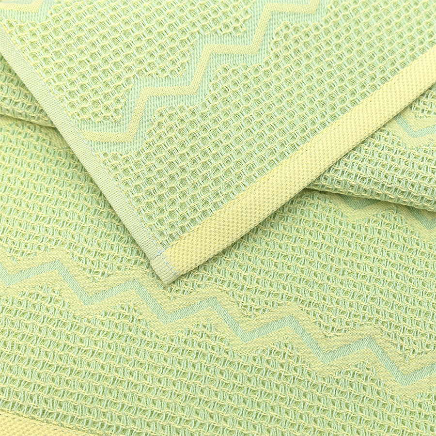 Полотенца Зигзаг произведены в Узбекистане из 100% хлопка. Это пестротканые жаккардовые вафельные полотенца, плотность 350г/м2. Полотенца отлично впитывают влагу, отлично подходят для использования в ванной комнате или в бассейне (размеры 70*140см и 50*90см), или на кухне (размер 40*60см, с петелькой).