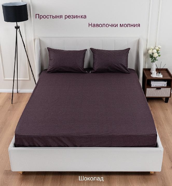 В комплект входит одна простыня на резинке плюс наволочки 50х70 см (на молнии). Изготовлен комплект из мягкого однотонного поплина, состоящего из 100% хлопка. Ткань очень мягкая, гладкая, прочная и хорошо впитывающая благодаря своей плотности 115 гр/кв.м. Натяжная простыня подойдет для детской и взрослой односпальной кровати или кушетки с бортом матраса не больше 25см. Резинка по периметру простыни обеспечит надежную фиксацию на матрасе, позволяя вам наслаждаться спокойным сном и провести ночь с комфортом.