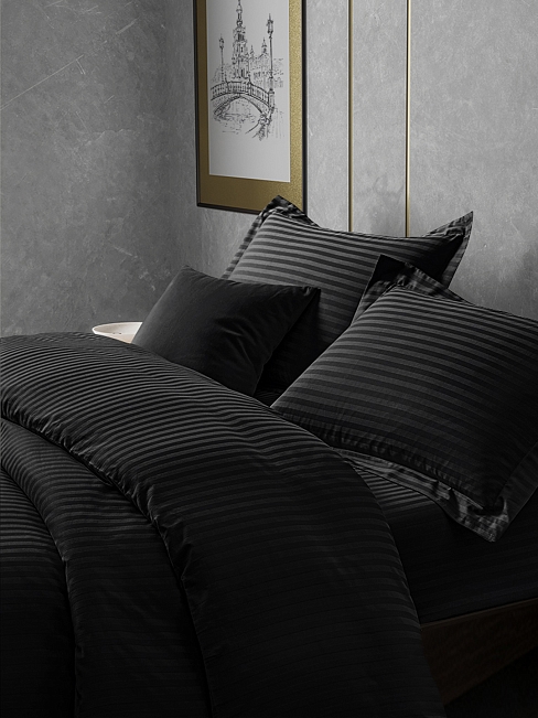 Постельное белье сатин страйп с простыней на резинке (ПУ) / Черный