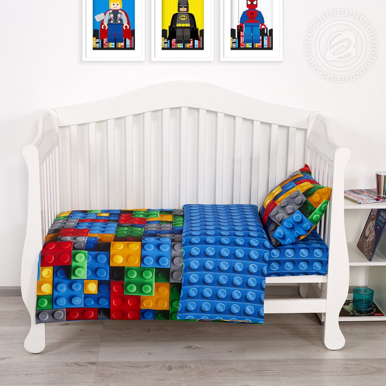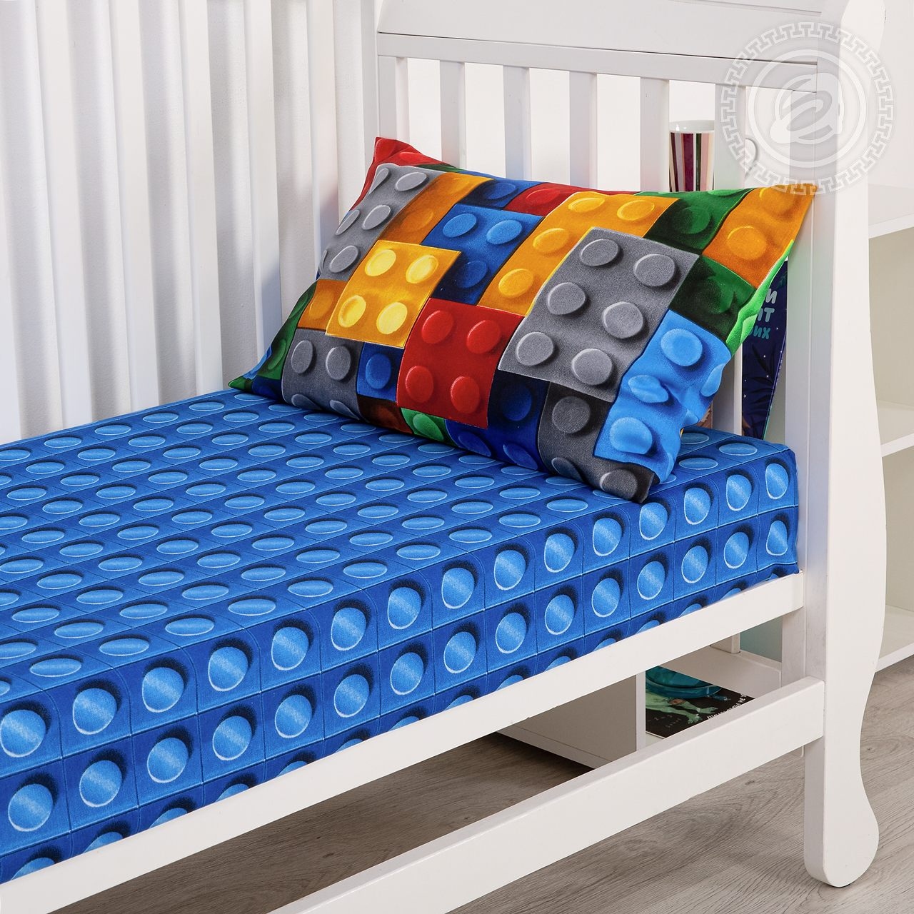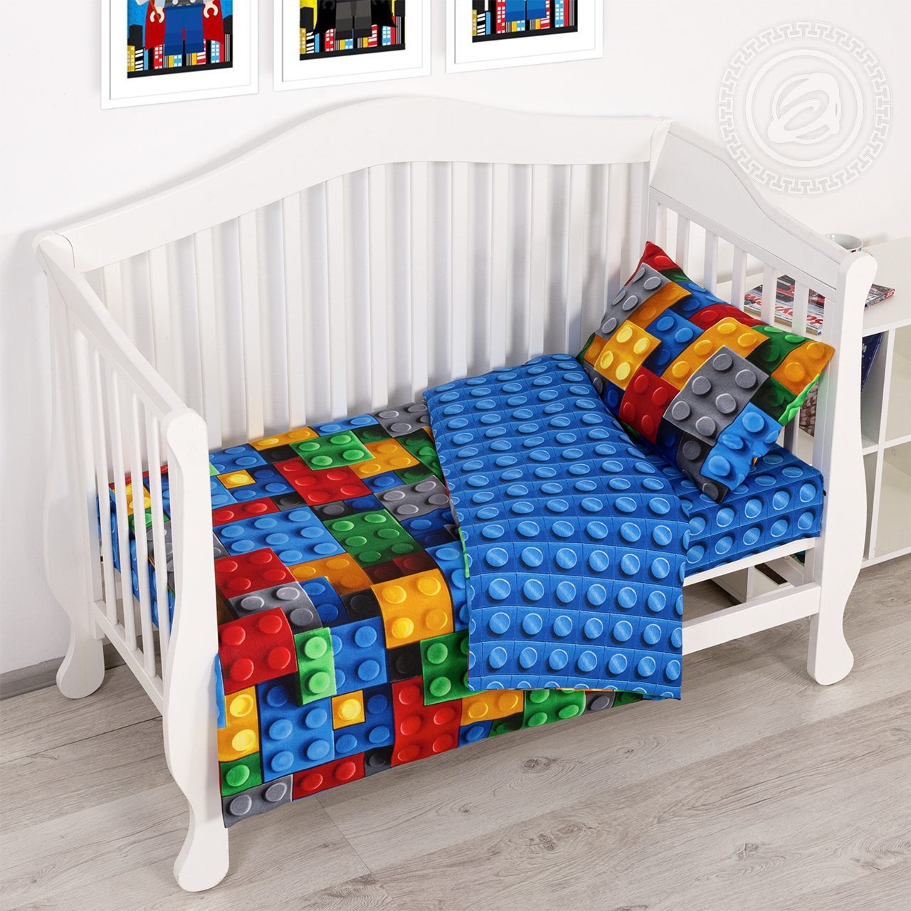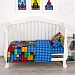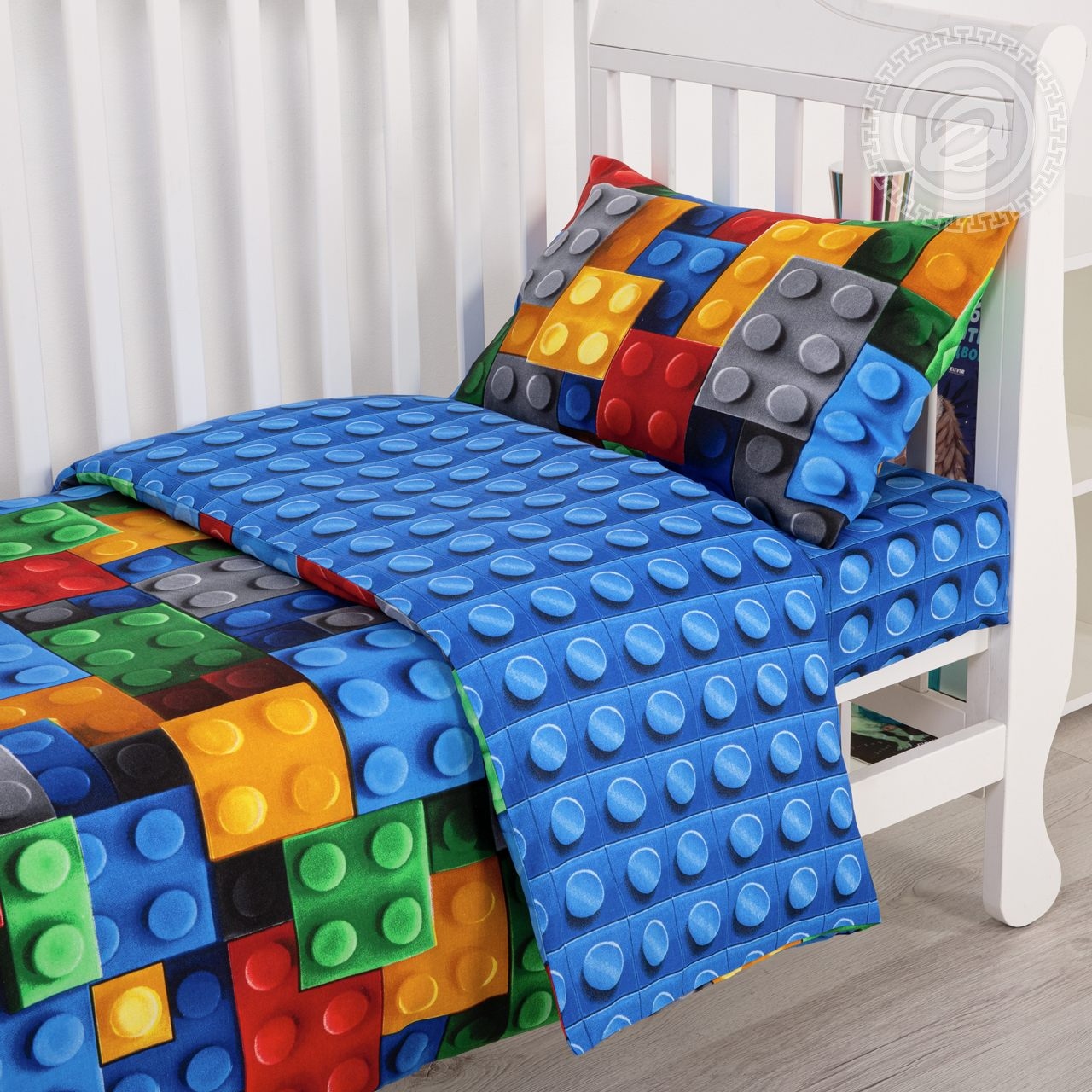 Детское постельное белье в ясельную кроватку украшено современным и технологичным дизайном в виде яркого конструктора. Разноцветные детали расположены таким образом, что создается ощущение, будто комплект собран из настоящих элементов любимой игры. Рисунок выглядит оригинально и объемно, словно с эффектом 3d.
