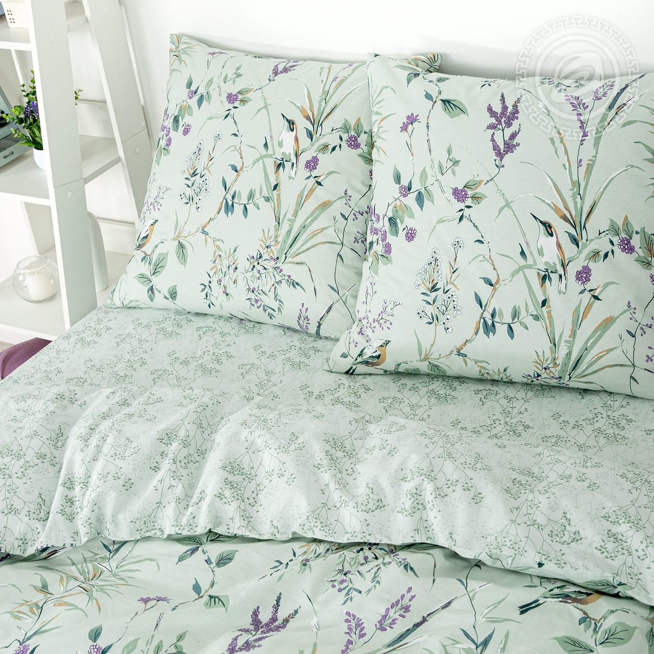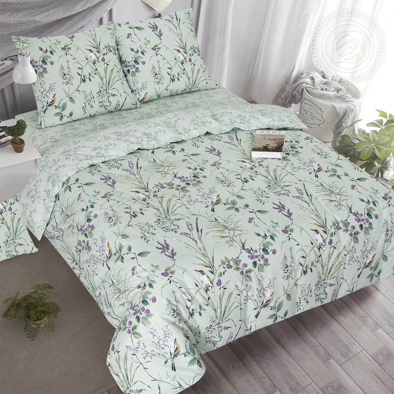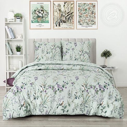 Хлопковое зеленое постельное белье «Муза» подарит атмосферу гармонии и красоты. Оно выполнено из мягкой ткани поплин и украшено элегантной композицией в легкой светло-зеленой гамме. На ней изображены чудесные цветы и щебечущие пташки.