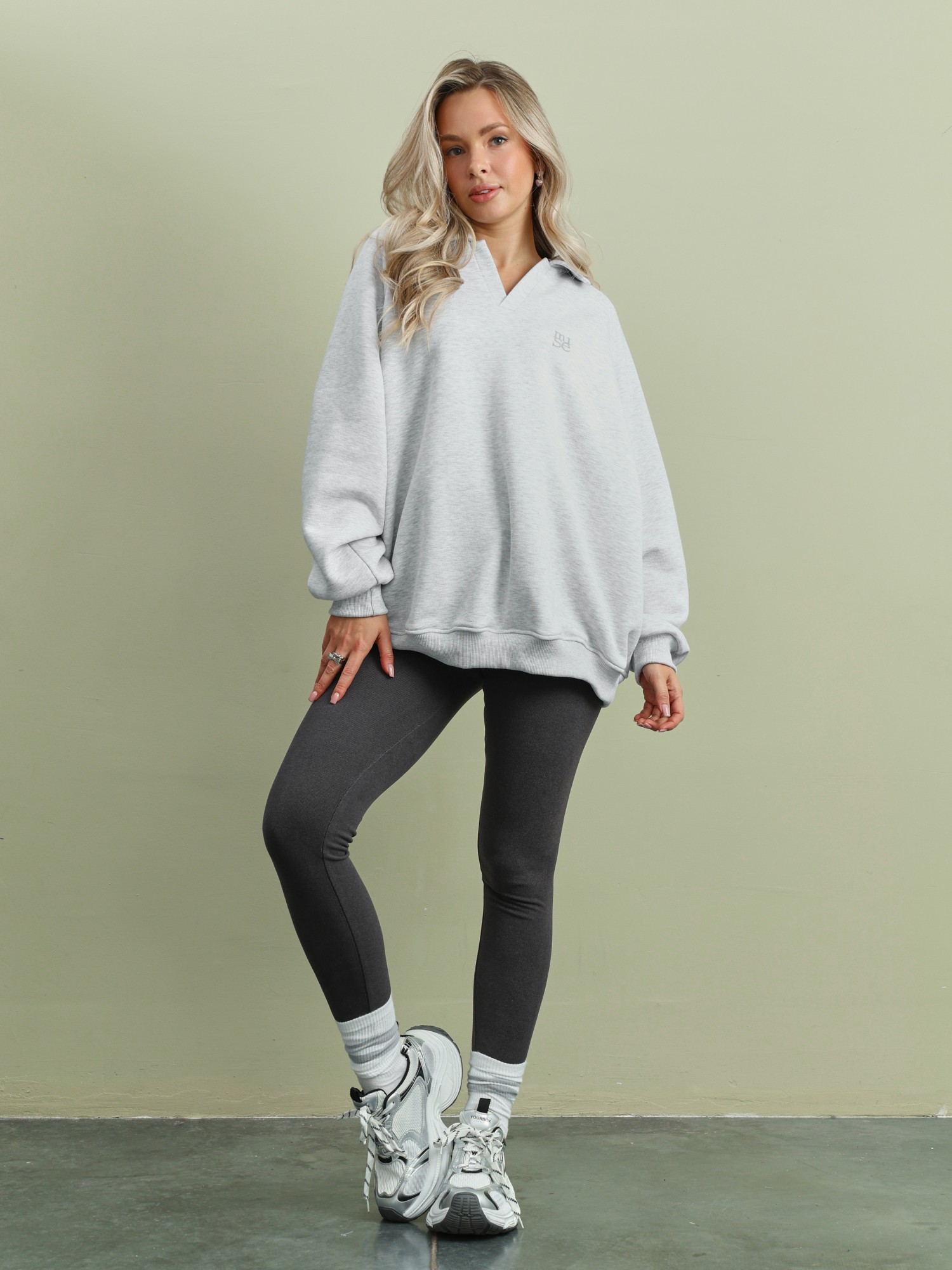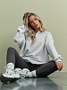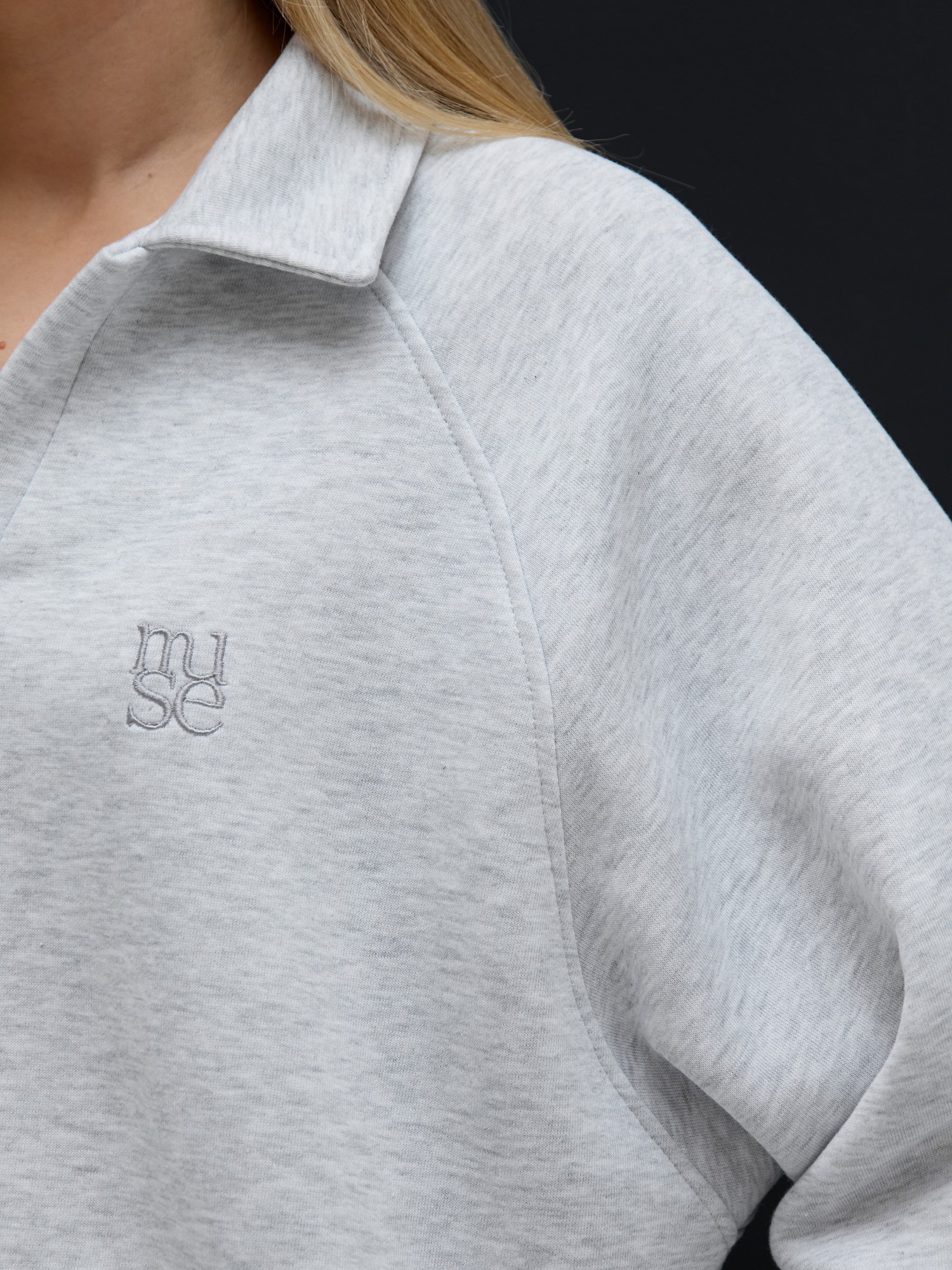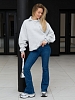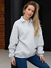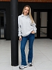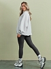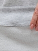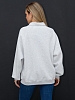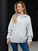 Толстовка женская из трикотажного полотна "кармеланж" с отделкой из полотна "кашкорсе", оверсайз, с рукавами покроя "реглан", стояче-отложным воротником и V-образным вырезом горловины, обработаннм втачными планками и вышивкой на детали переда. Притачной пояс по низу изделия и манжеты рукавов выполнены из полотна "кашкорсе" в цвет основого материала. По воротнику, швам реглана и шву притачивания пояса настрочены отделочные строчки.