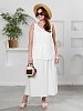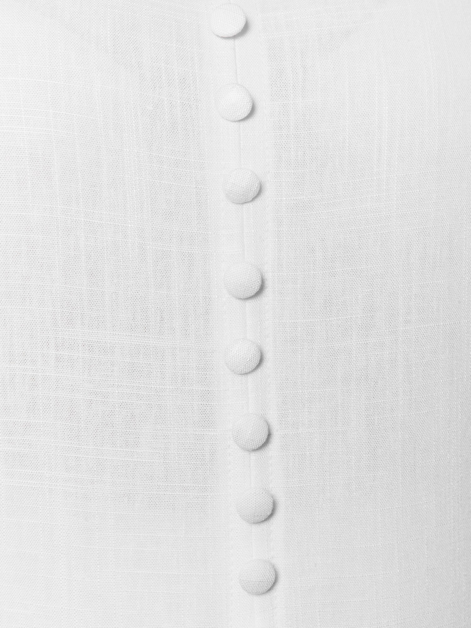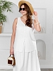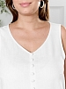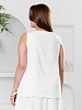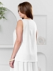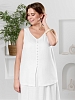Блузка женская из гладкокрашеного тканого полотна, полуприталенного силуэта, без рукавов, с V-образной горловиной и вытачками в области груди. Перед состоит из двух частей, в шве соединения деталей разрез. От горловины до разреза пришиты декоративные пуговицы имитирующие застежку. Горловина и проймы окантованы основным материалом.