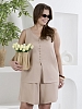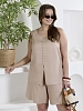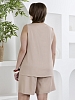 Блузка женская из гладкокрашеного тканого полотна, полуприталенного силуэта, без рукавов, с V-образной горловиной и вытачками в области груди. Перед состоит из двух частей, в шве соединения деталей разрез. От горловины до разреза пришиты декоративные пуговицы имитирующие застежку. Горловина и проймы окантованы основным материалом.