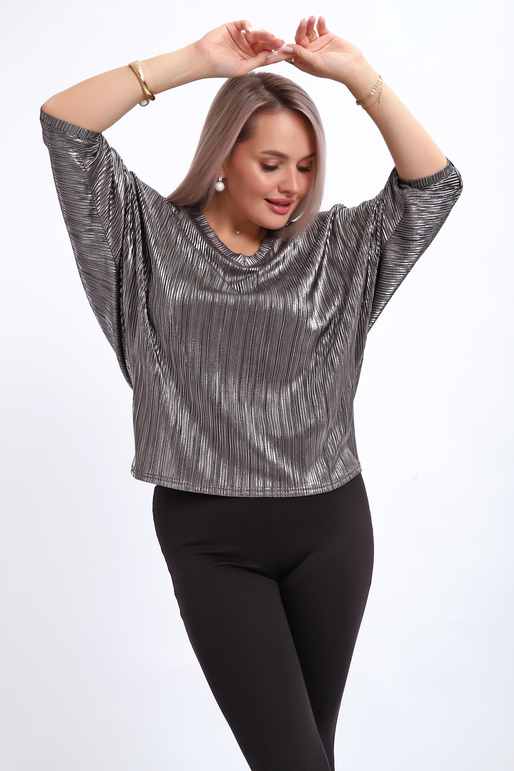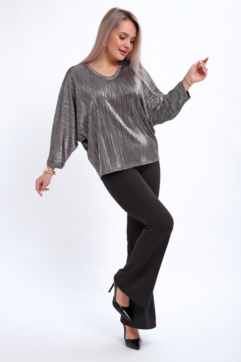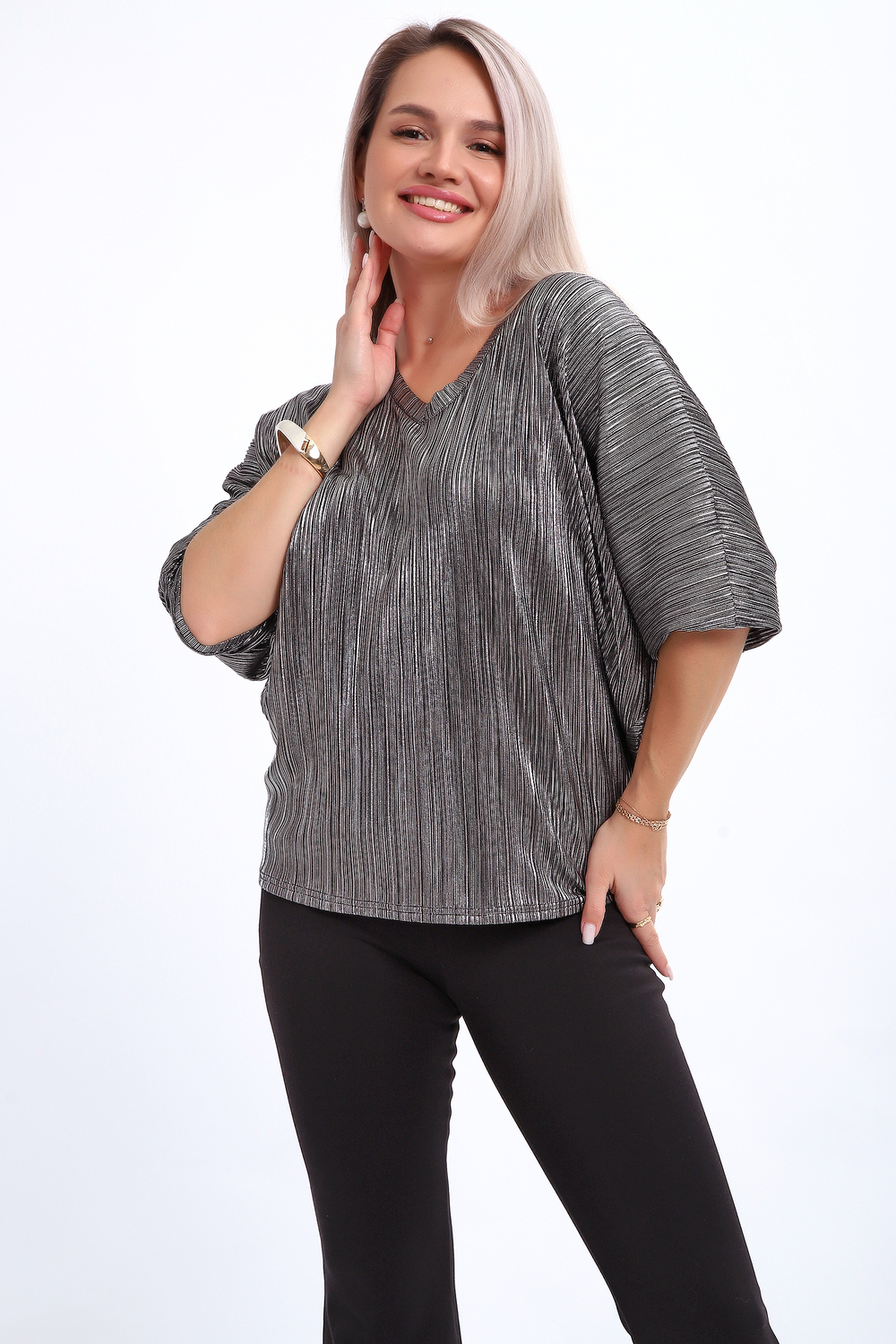Сделайте акцент на вашем стиле с помощью комфортной и изысканной блузки. Нарядная кофта - это необходимый предмет в любом гардеробе. Благодаря свободному крою, она идеально садится на любую фигуру, скрывая то, что хотелось бы спрятать и подчеркивая достоинства. Блузка выигрышно смотрится за счет ткани атлас гофре со стойким напылением фойл, которое не осыпается в процессе носки и после стирки. Ткань атлас гофре хорошо тянется и драпируется, имеет мягкий благородный блеск и совершенно не мнется. Крой блузки лаконичен, без лишних деталей, рукав летучая мышь не сковывает движений, имеет длину 3/4 и оканчивается небольшим манжетом. V-образный воротник зрительно удлиняет шею, обработан обтачкой, длина блузки до линии бедра. Легкая изящная блузка отлично впишется в вечерний наряд, а также будет блестящим дополнением к деловому и повседневному образу.