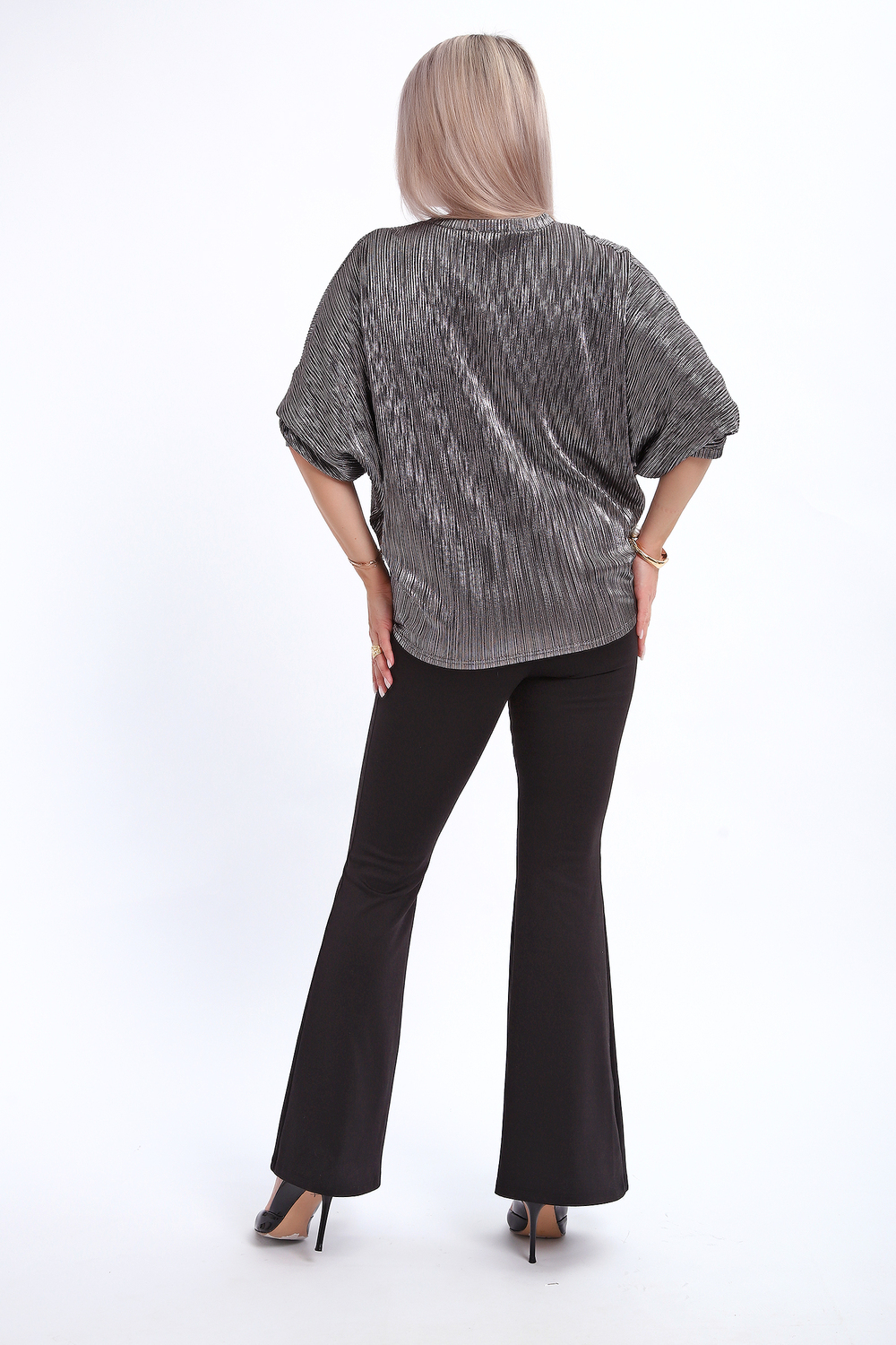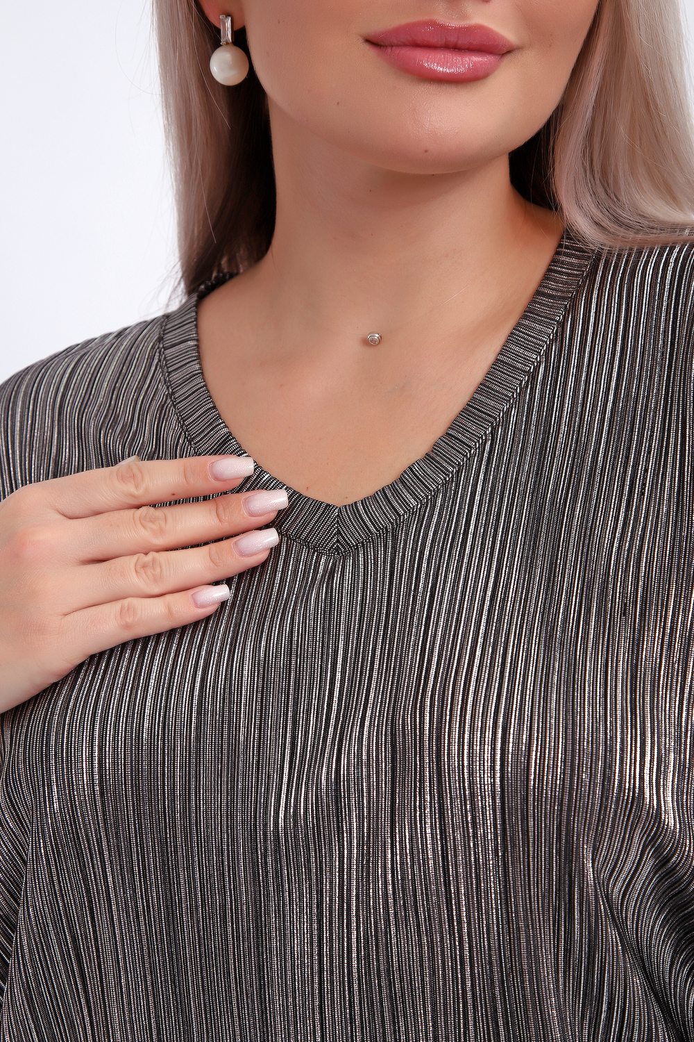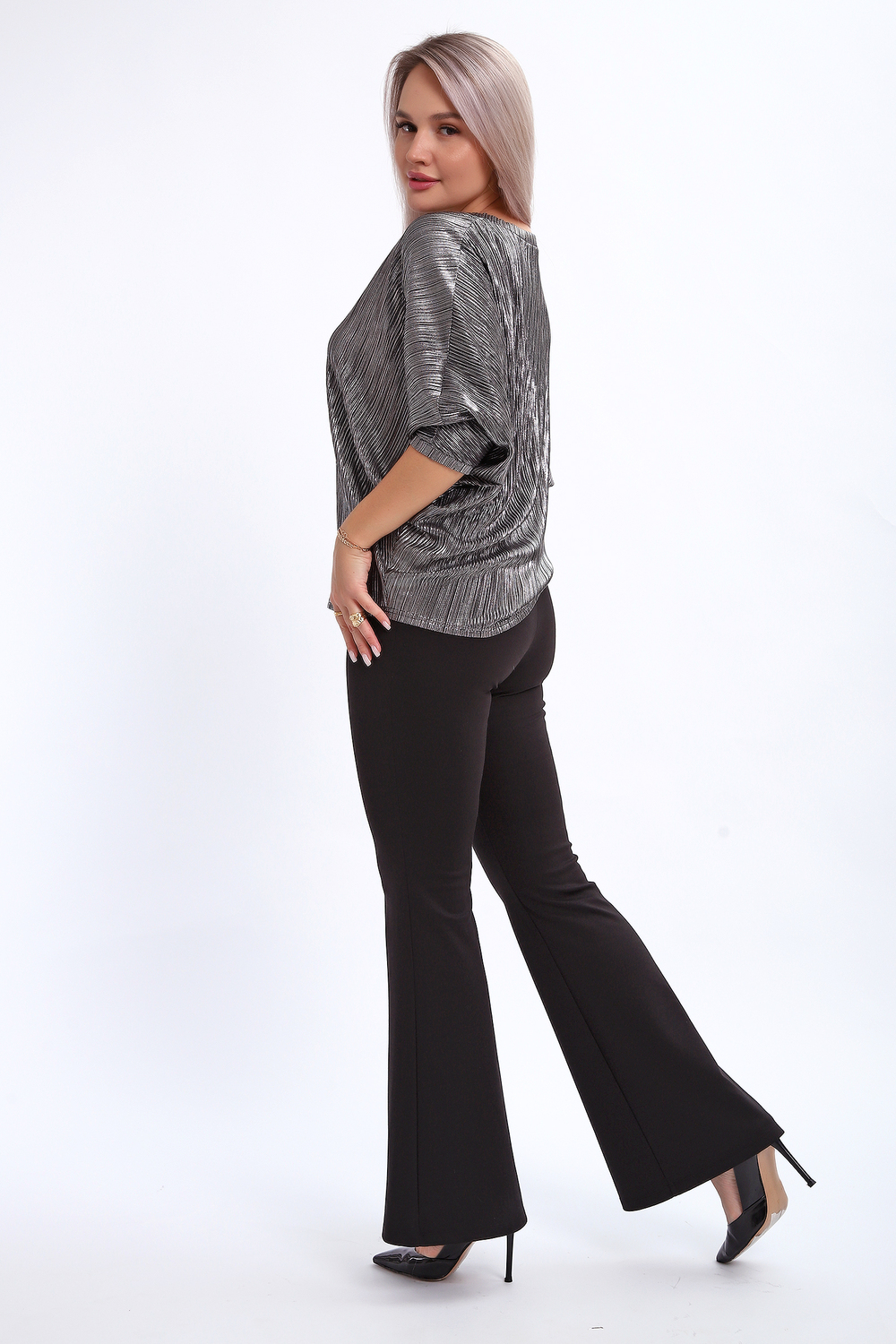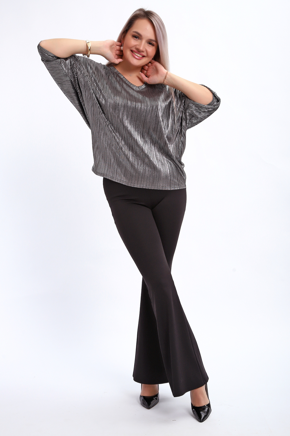 Сделайте акцент на вашем стиле с помощью комфортной и изысканной блузки. Нарядная кофта - это необходимый предмет в любом гардеробе. Благодаря свободному крою, она идеально садится на любую фигуру, скрывая то, что хотелось бы спрятать и подчеркивая достоинства. Блузка выигрышно смотрится за счет ткани атлас гофре со стойким напылением фойл, которое не осыпается в процессе носки и после стирки. Ткань атлас гофре хорошо тянется и драпируется, имеет мягкий благородный блеск и совершенно не мнется. Крой блузки лаконичен, без лишних деталей, рукав летучая мышь не сковывает движений, имеет длину 3/4 и оканчивается небольшим манжетом. V-образный воротник зрительно удлиняет шею, обработан обтачкой, длина блузки до линии бедра. Легкая изящная блузка отлично впишется в вечерний наряд, а также будет блестящим дополнением к деловому и повседневному образу.