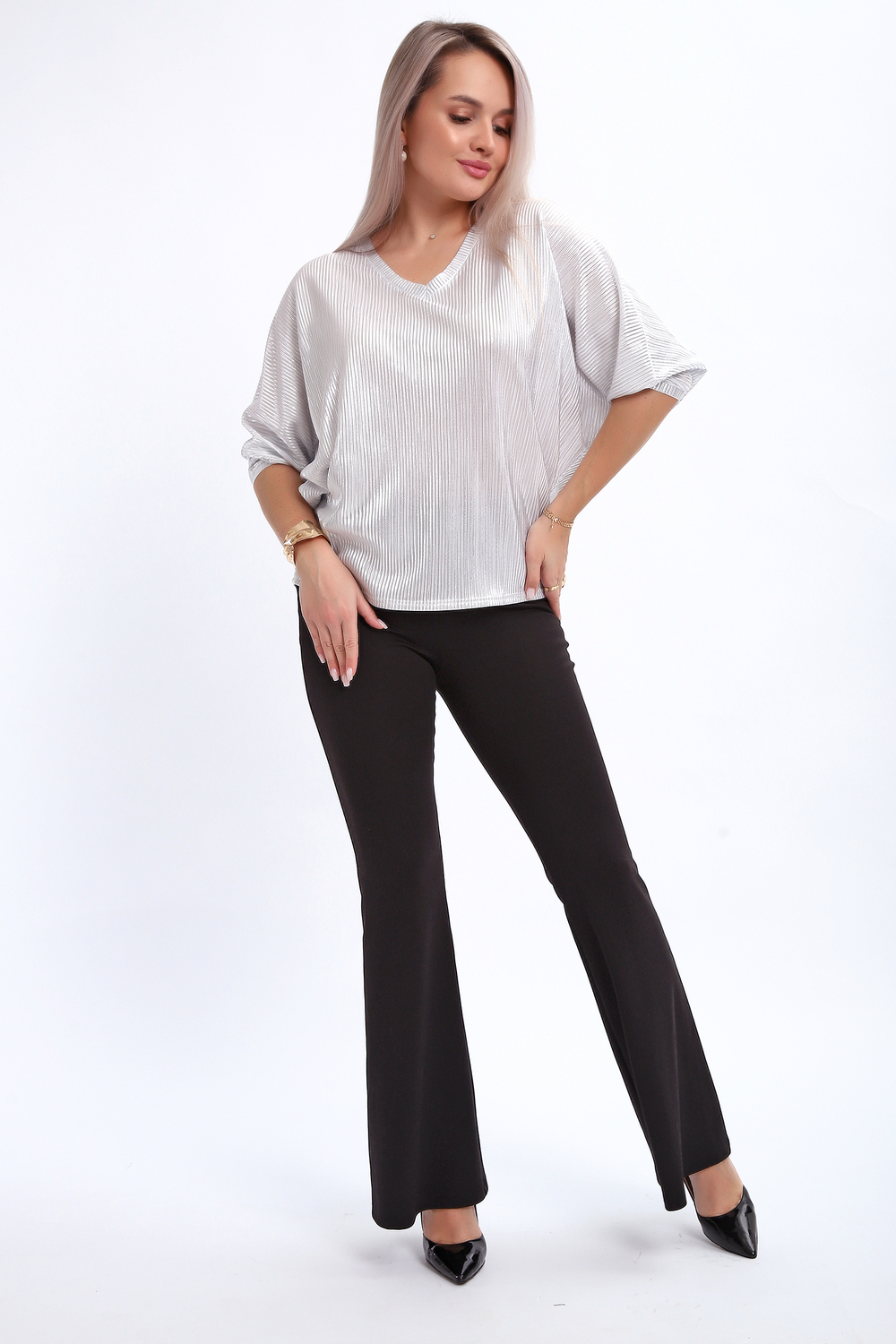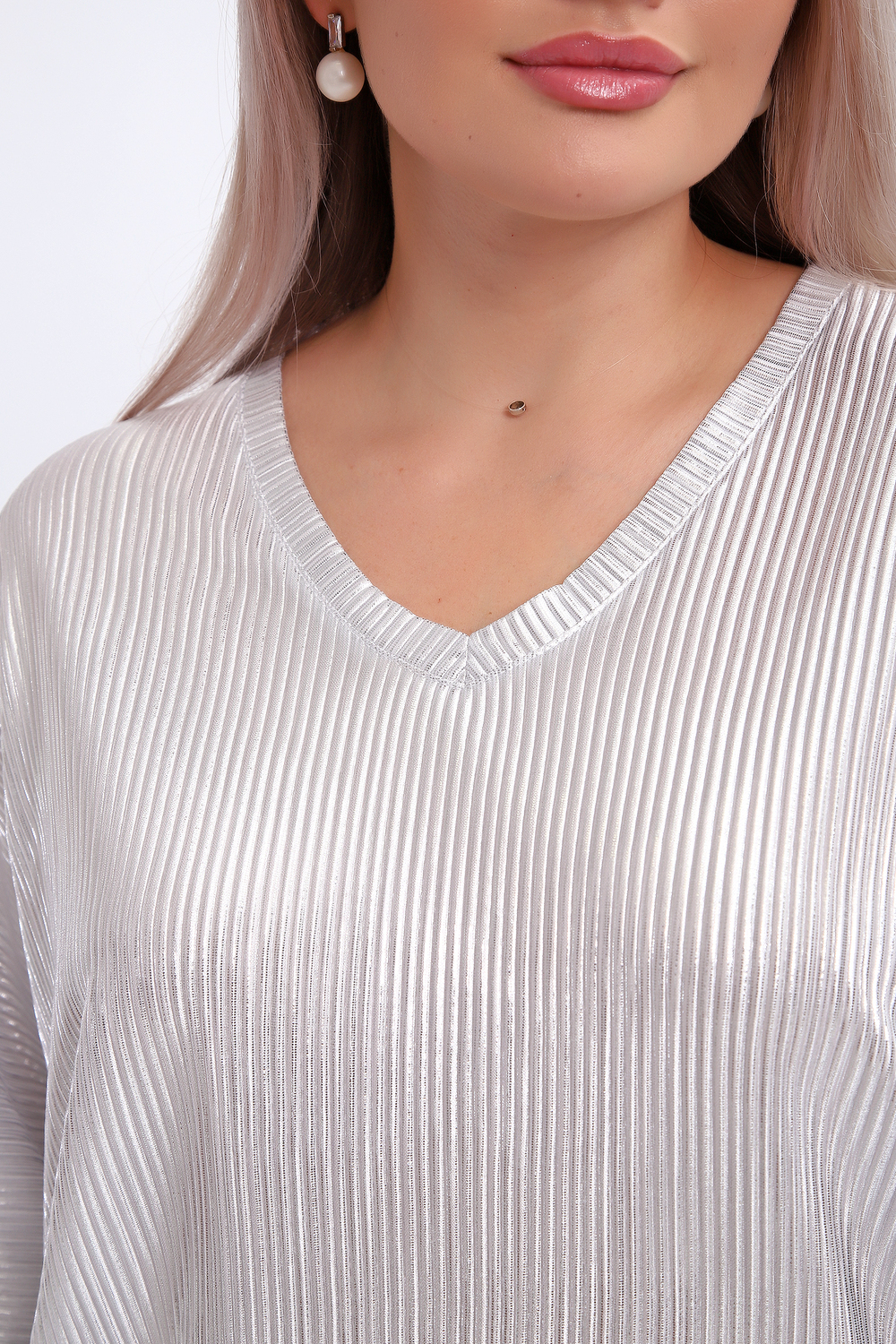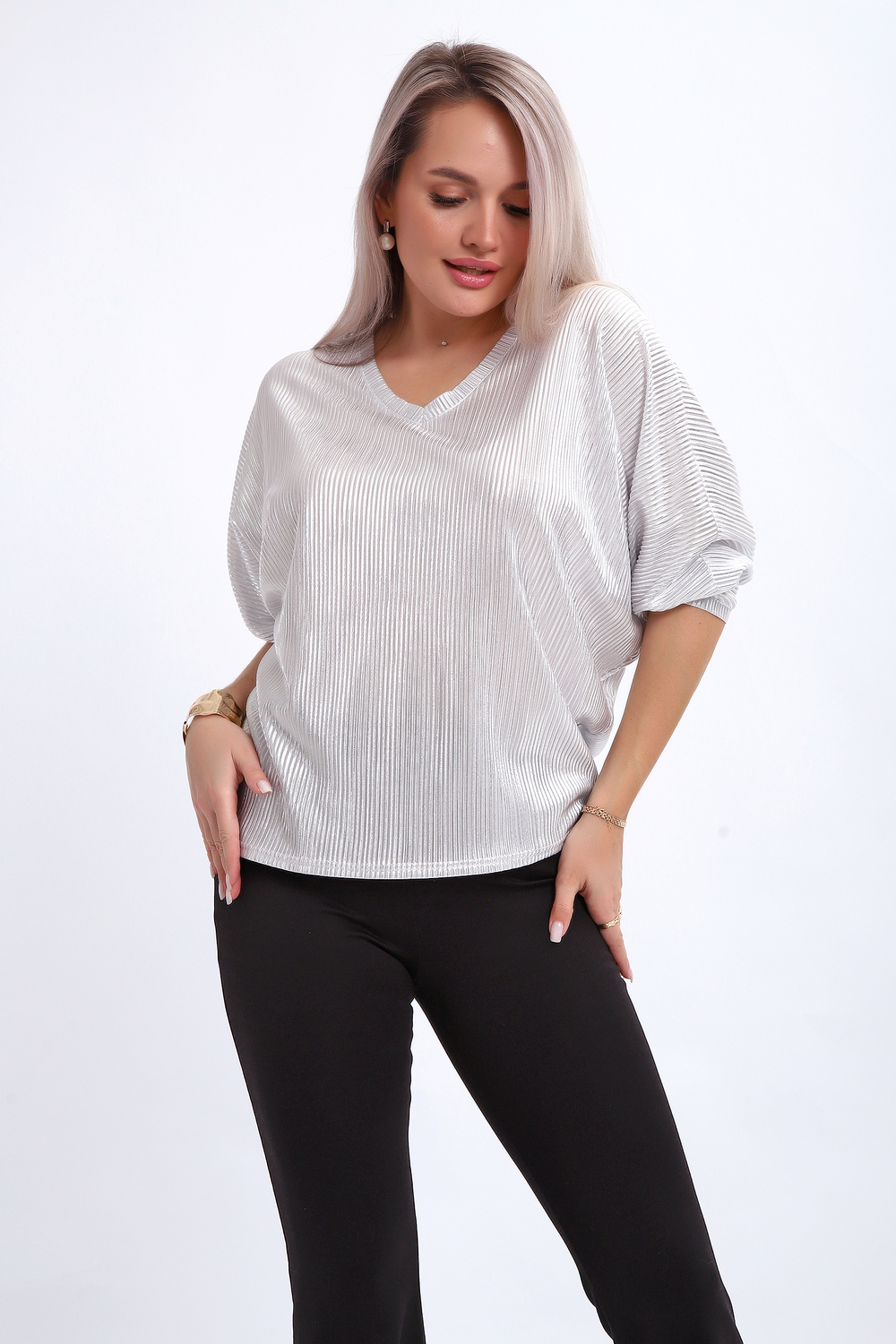 Сделайте акцент на вашем стиле с помощью комфортной и изысканной блузки. Нарядная кофта - это необходимый предмет в любом гардеробе. Благодаря свободному крою, она идеально садится на любую фигуру, скрывая то, что хотелось бы спрятать и подчеркивая достоинства. Блузка выигрышно смотрится за счет ткани атлас гофре со стойким напылением фойл, которое не осыпается в процессе носки и после стирки. Ткань атлас гофре хорошо тянется и драпируется, имеет мягкий благородный блеск и совершенно не мнется. Крой блузки лаконичен, без лишних деталей, рукав летучая мышь не сковывает движений, имеет длину 3/4 и оканчивается небольшим манжетом. V-образный воротник зрительно удлиняет шею, обработан обтачкой, длина блузки до линии бедра. Легкая изящная блузка отлично впишется в вечерний наряд, а также будет блестящим дополнением к деловому и повседневному образу.