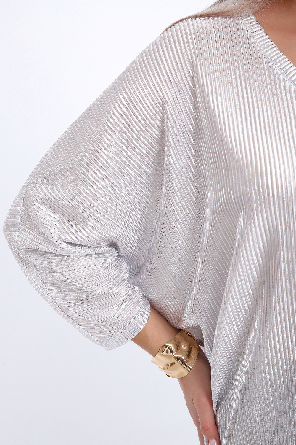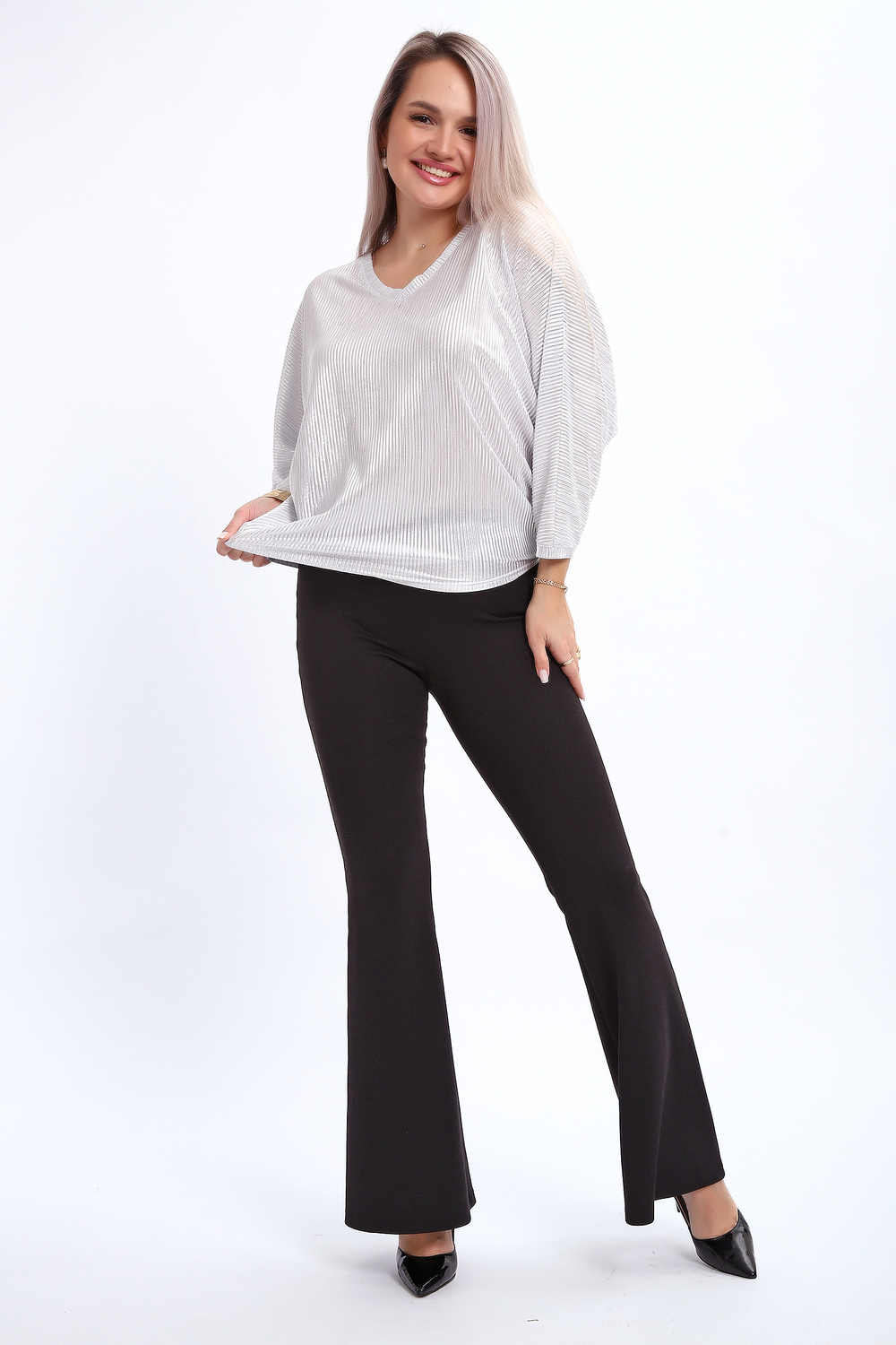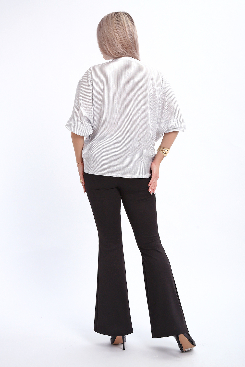 Сделайте акцент на вашем стиле с помощью комфортной и изысканной блузки. Нарядная кофта - это необходимый предмет в любом гардеробе. Благодаря свободному крою, она идеально садится на любую фигуру, скрывая то, что хотелось бы спрятать и подчеркивая достоинства. Блузка выигрышно смотрится за счет ткани атлас гофре со стойким напылением фойл, которое не осыпается в процессе носки и после стирки. Ткань атлас гофре хорошо тянется и драпируется, имеет мягкий благородный блеск и совершенно не мнется. Крой блузки лаконичен, без лишних деталей, рукав летучая мышь не сковывает движений, имеет длину 3/4 и оканчивается небольшим манжетом. V-образный воротник зрительно удлиняет шею, обработан обтачкой, длина блузки до линии бедра. Легкая изящная блузка отлично впишется в вечерний наряд, а также будет блестящим дополнением к деловому и повседневному образу.