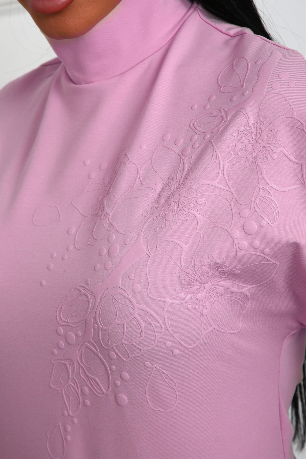 Блуза женская из трикотажного полотна. Силуэт полуприлегающий. Без рукава. Линия плеч спущена. Воротник стойка. Низ изделия прямой. На полочке цветочный принт, пуф.