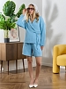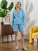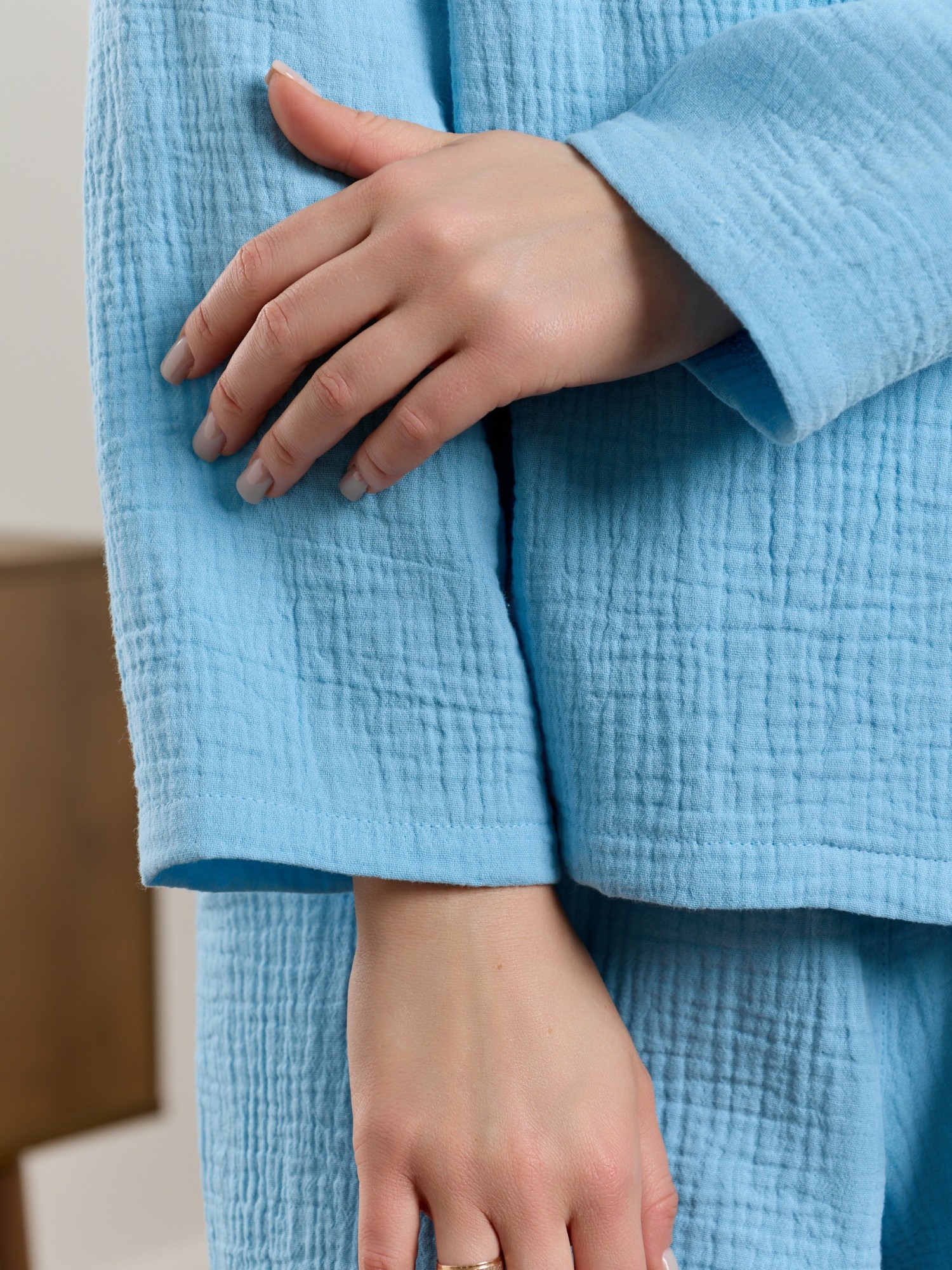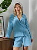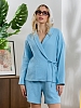 Блуза женская на запахе из фактурного гладкокрашеного полотна, с длинными рукавами, спущенным плечом и воротником "шаль". Низ изделия и рукавов обработаны подгибкой. Для фиксации изделия на фигуре предусмотрены шнуры из ркантовки, вставленные в правый бортовой и левый боковой швы.