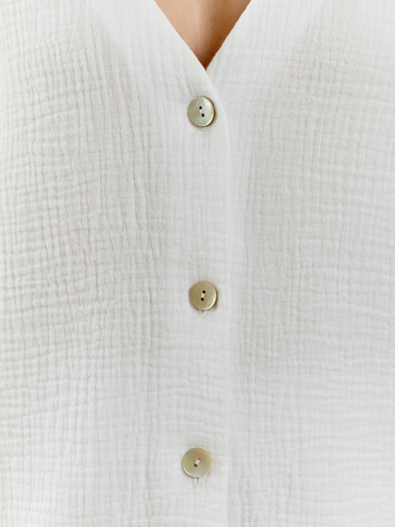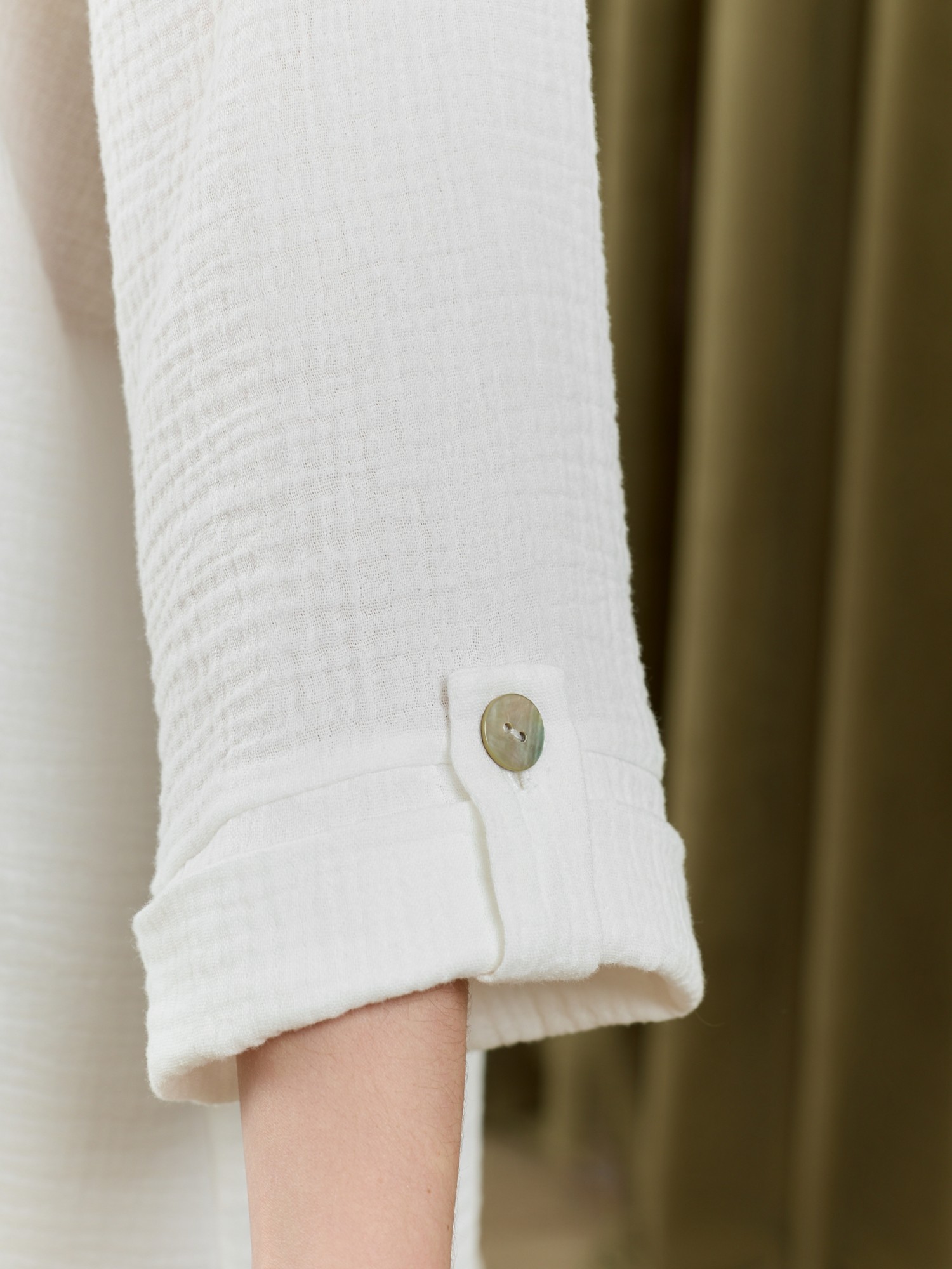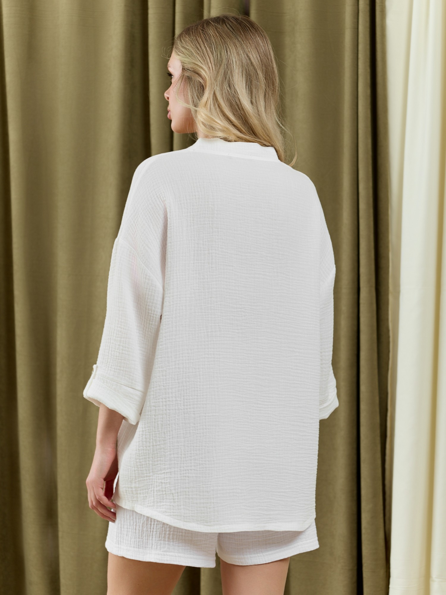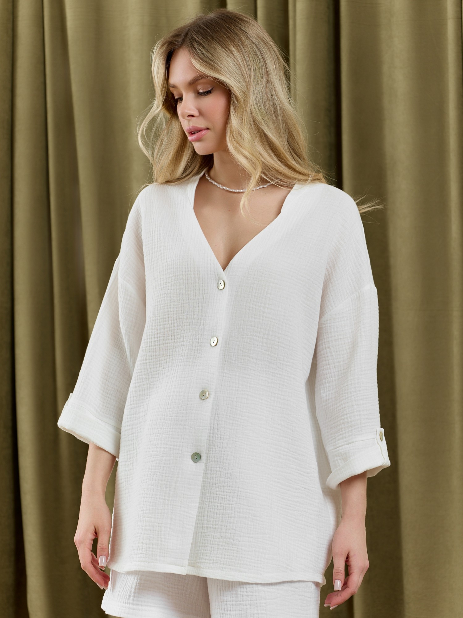Блузка женская из фактурного гладкокрашеного полотна, с втачными рукавами длиной 3/4, с центральной бортовой застежкой на 4 обметанные петли и 4 пуговицы, с горловиной фигурной формы и небольшим отделочным воротником. Нижние срезы рукавов и низ изделия обработаны подгибкой. Рукава - с хлястиками, с петлей и пуговицей, позволяющими регулировать длину рукавов на фигуре и создающими красивую драпировку.