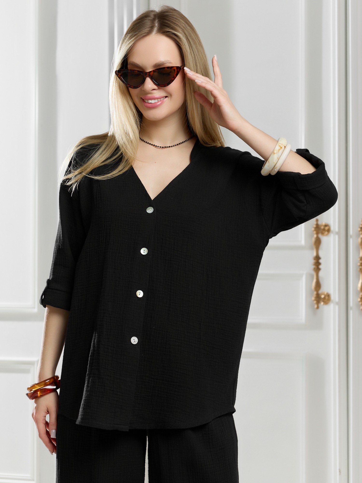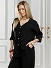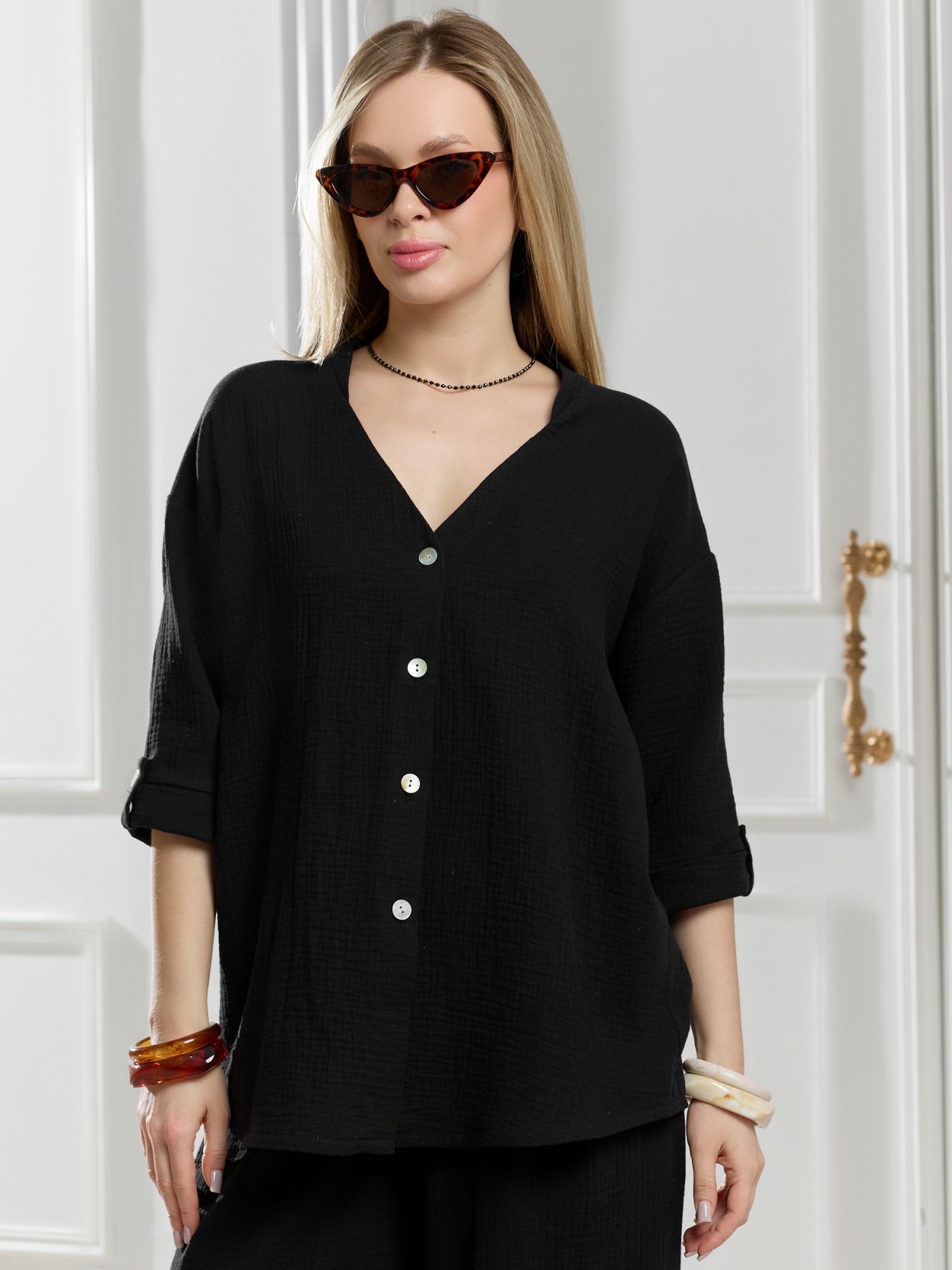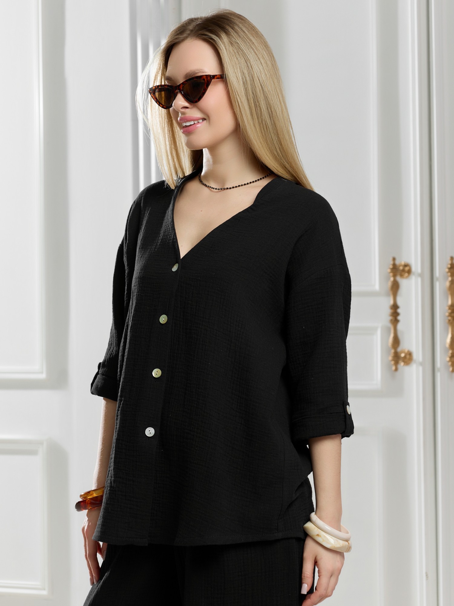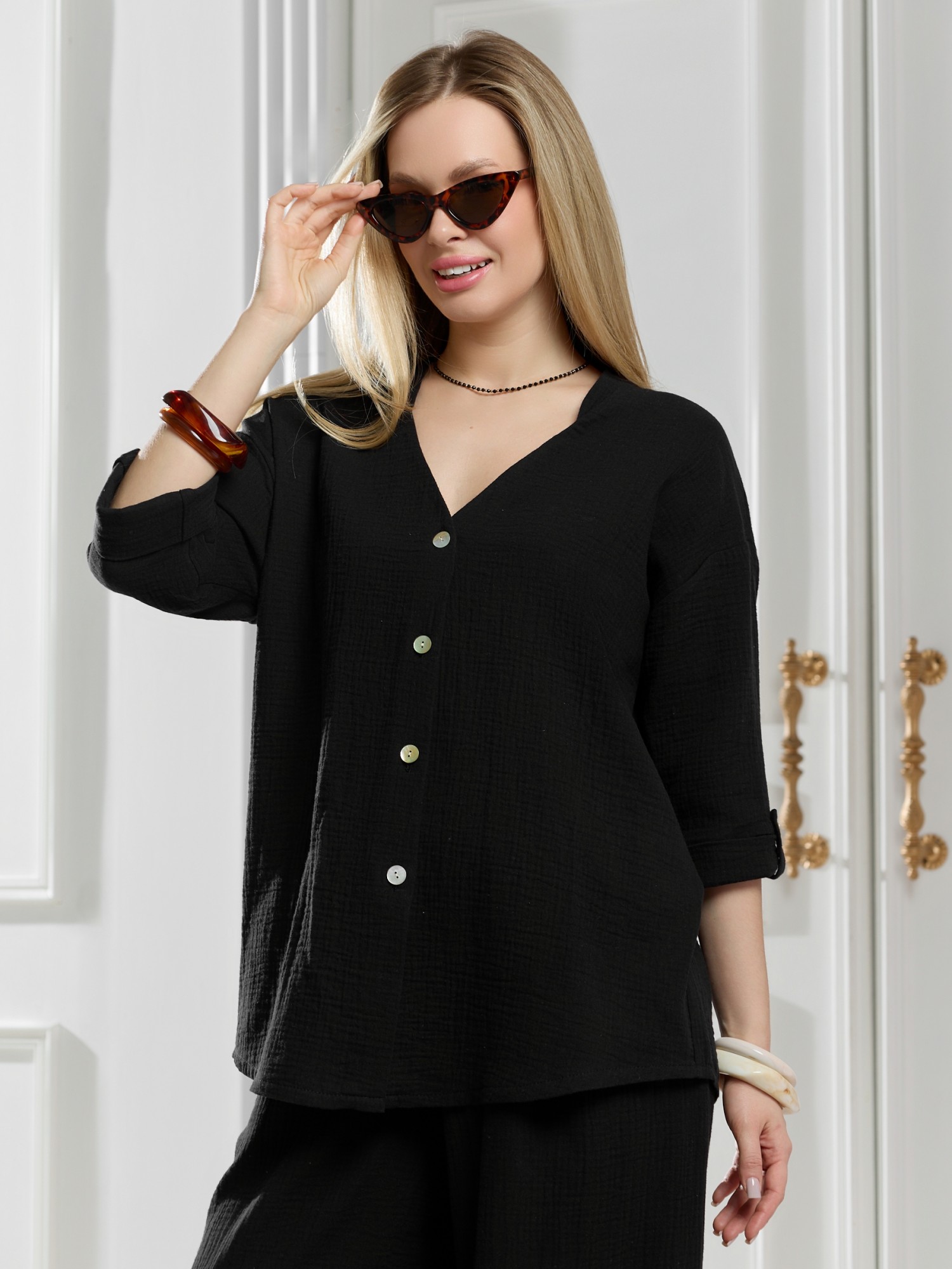 Блузка женская из фактурного гладкокрашеного полотна, с втачными рукавами длиной 3/4, с центральной бортовой застежкой на 4 обметанные петли и 4 пуговицы, с горловиной фигурной формы и небольшим отделочным воротником. Нижние срезы рукавов и низ изделия обработаны подгибкой. Рукава - с хлястиками, с петлей и пуговицей, позволяющими регулировать длину рукавов на фигуре и создающими красивую драпировку.