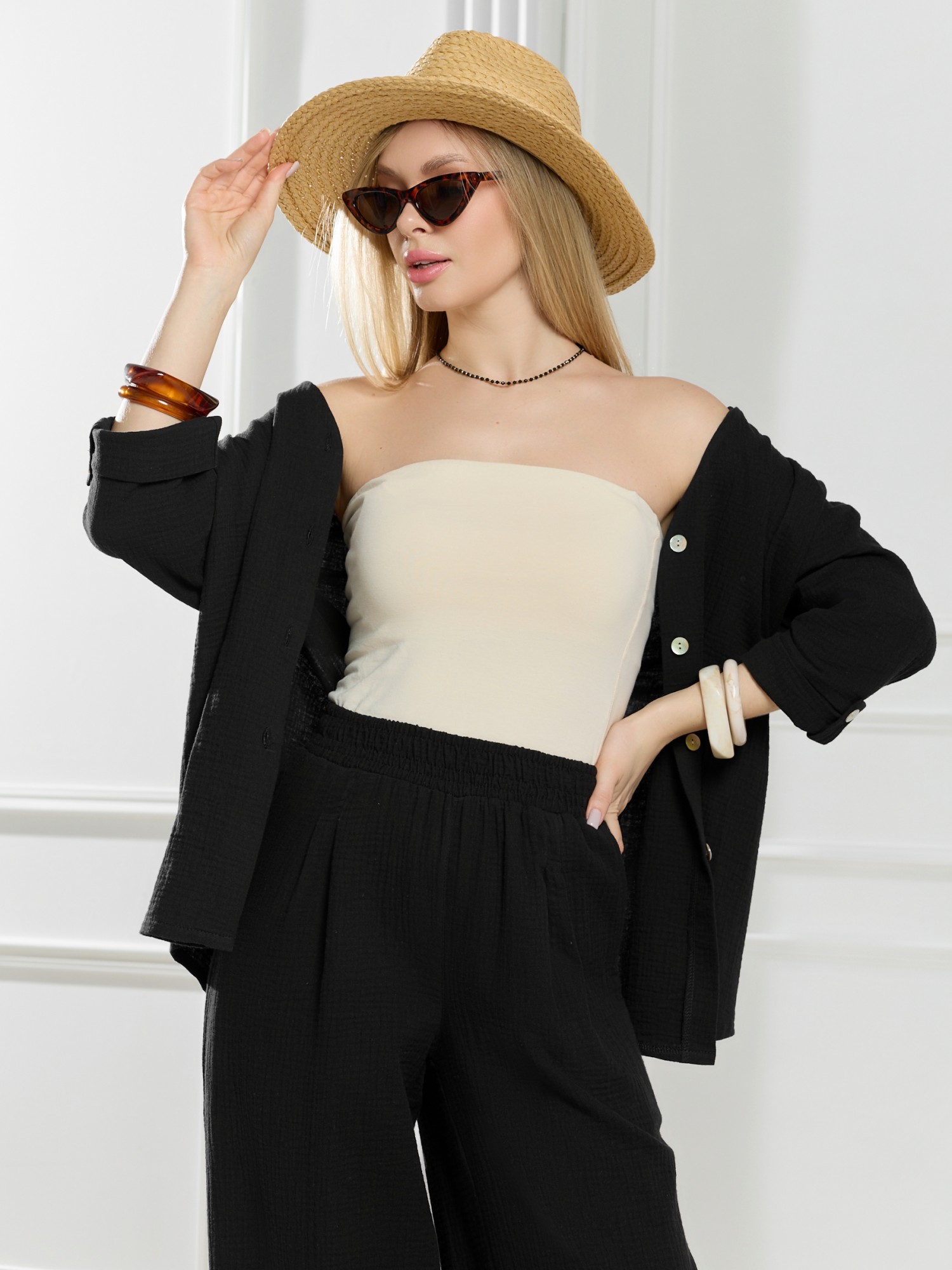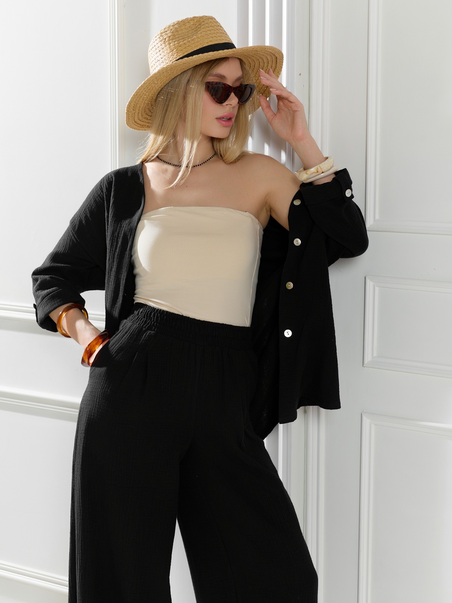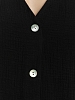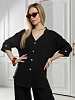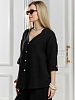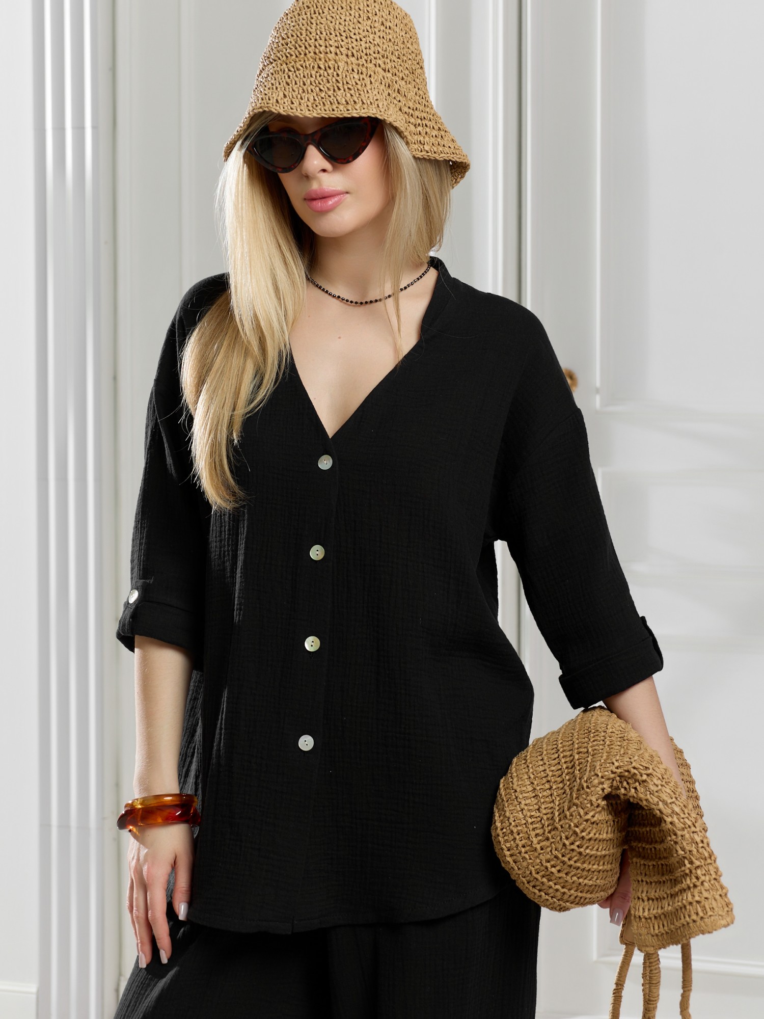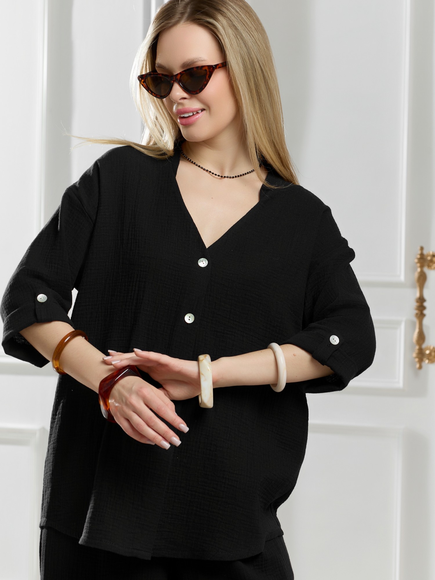 Блузка женская из фактурного гладкокрашеного полотна, с втачными рукавами длиной 3/4, с центральной бортовой застежкой на 4 обметанные петли и 4 пуговицы, с горловиной фигурной формы и небольшим отделочным воротником. Нижние срезы рукавов и низ изделия обработаны подгибкой. Рукава - с хлястиками, с петлей и пуговицей, позволяющими регулировать длину рукавов на фигуре и создающими красивую драпировку.