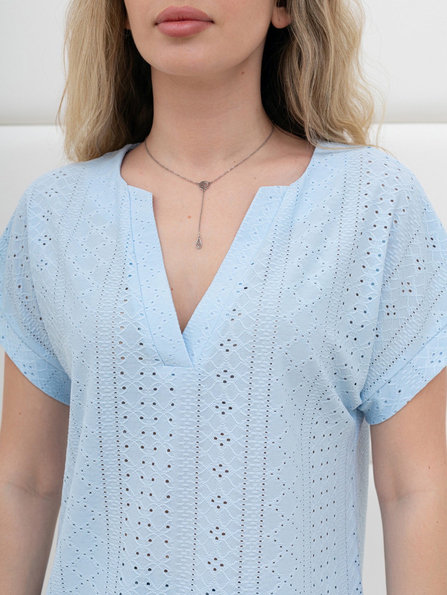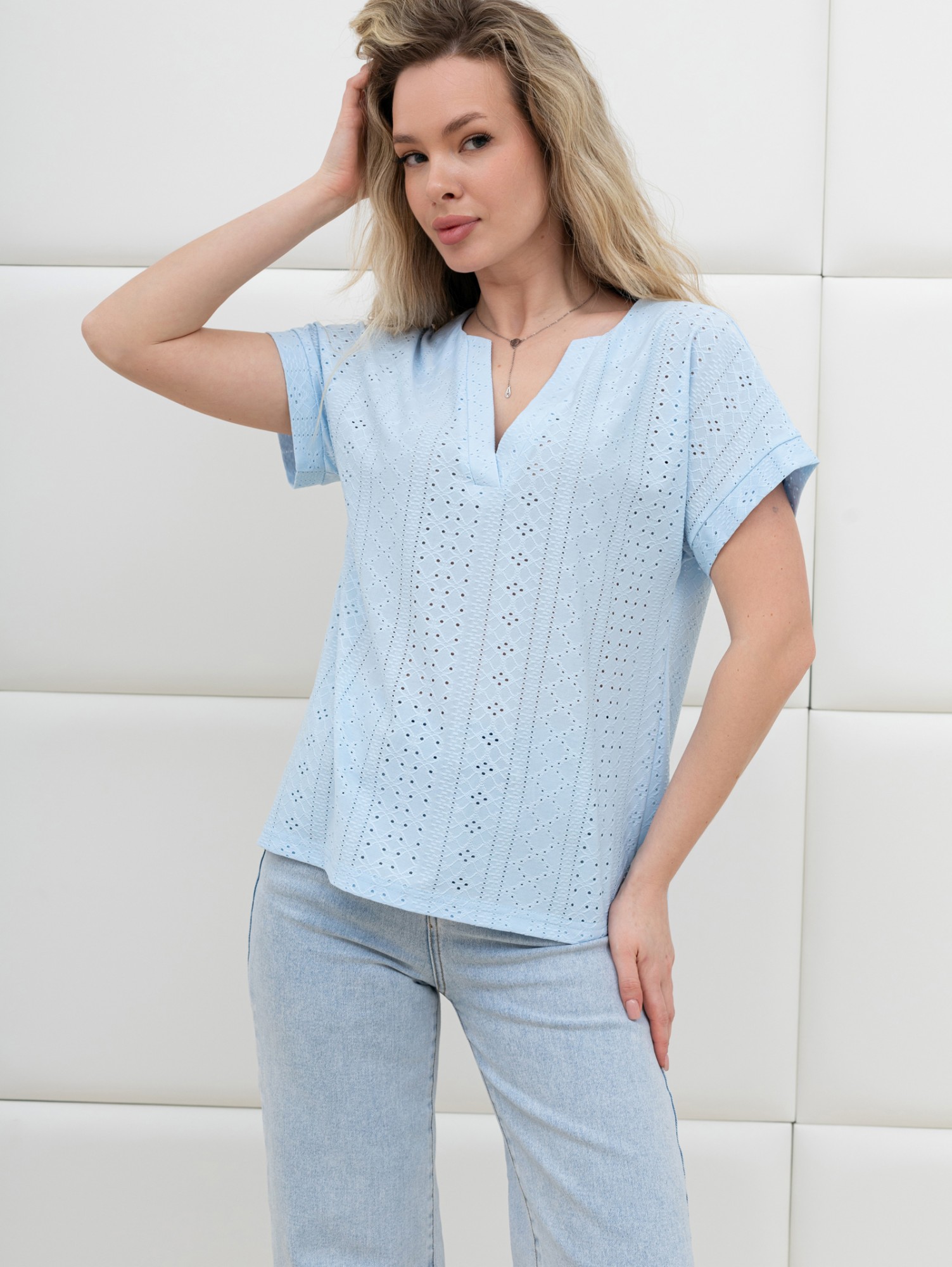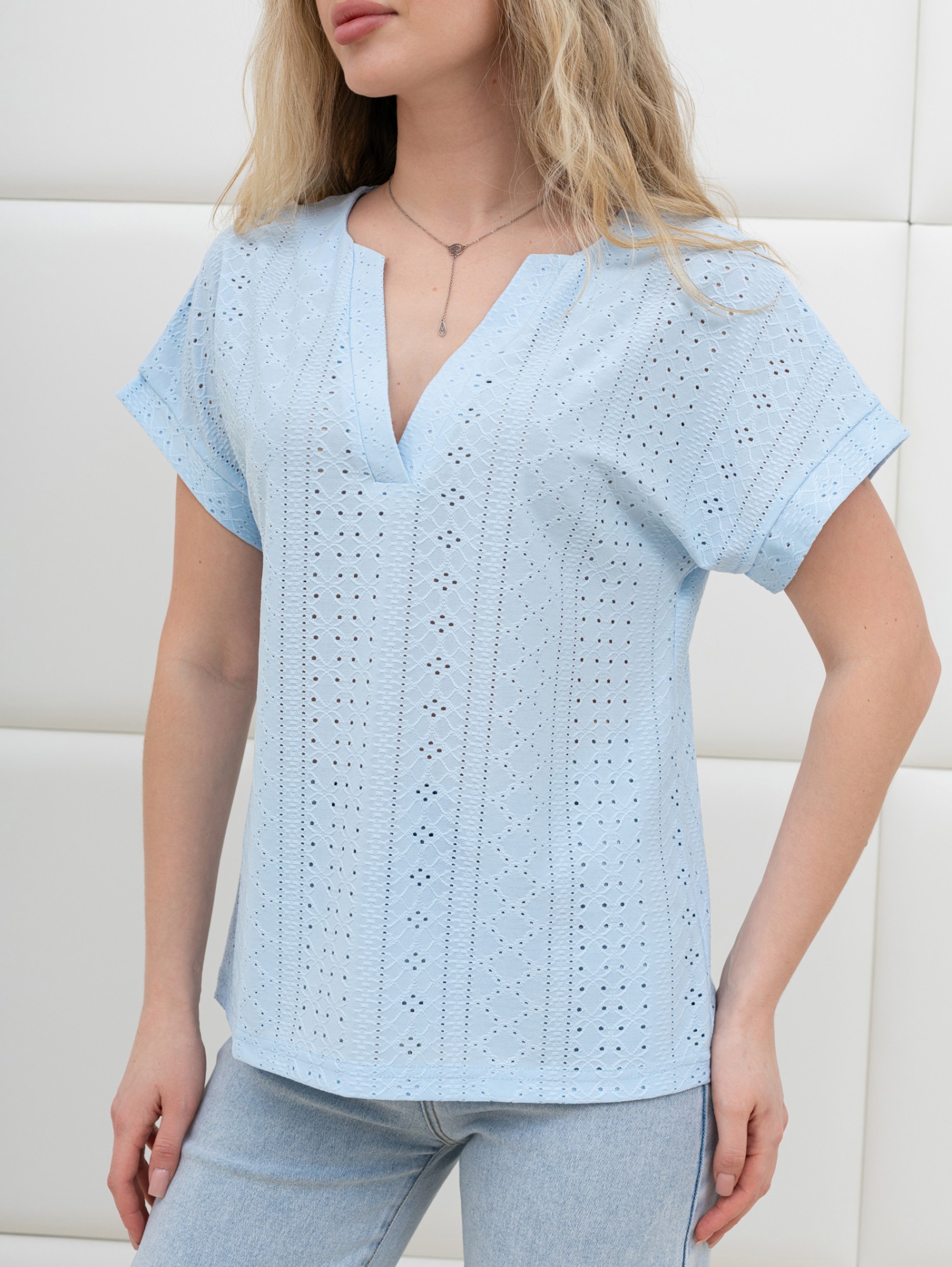 Блуза женская из гладкокрашеного трикотажного полотна «шитье», полуприталенного силуэта, с глубоким V-образным вырезом горловины, обработанным косыми планками, короткими цельнокроеными рукавами. Нижние срезы рукавов с притачными манжетами.