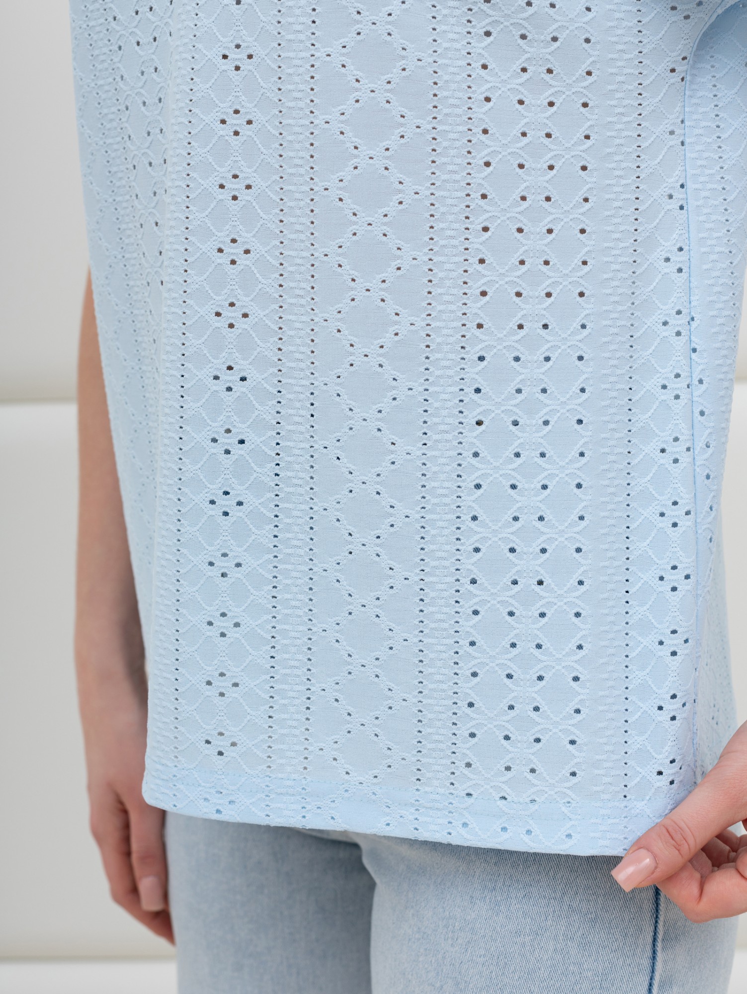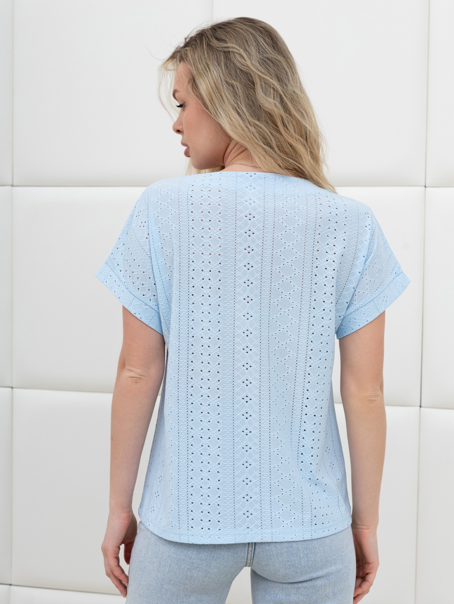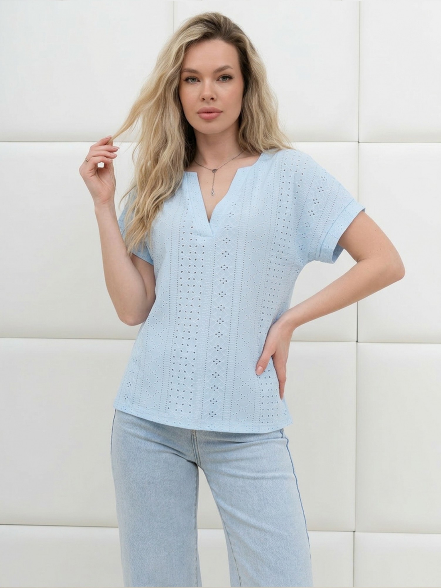 Блуза женская из гладкокрашеного трикотажного полотна «шитье», полуприталенного силуэта, с глубоким V-образным вырезом горловины, обработанным косыми планками, короткими цельнокроеными рукавами. Нижние срезы рукавов с притачными манжетами.