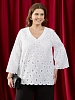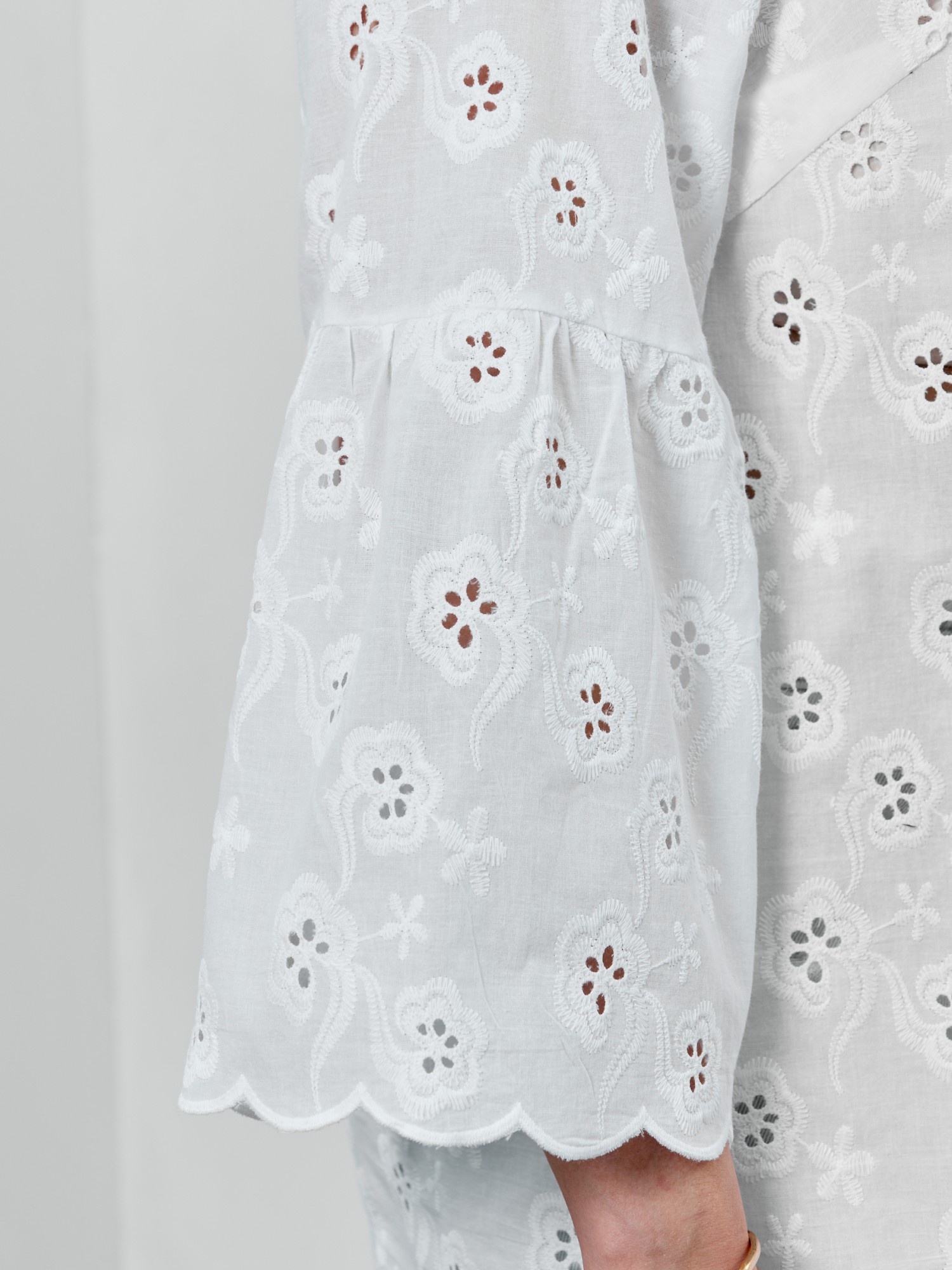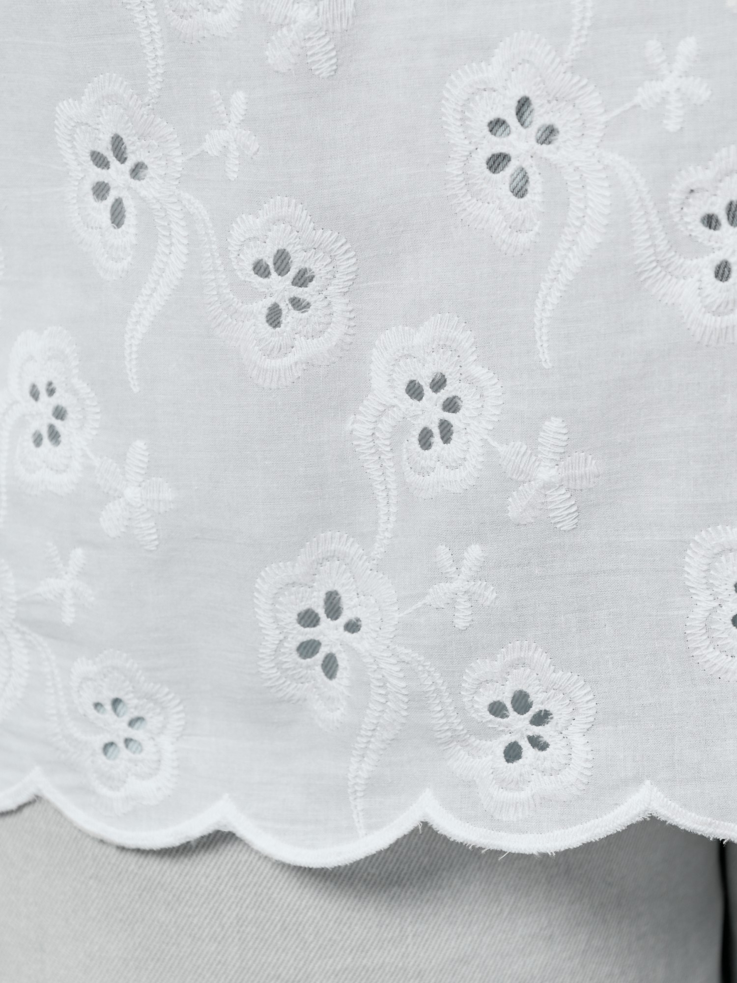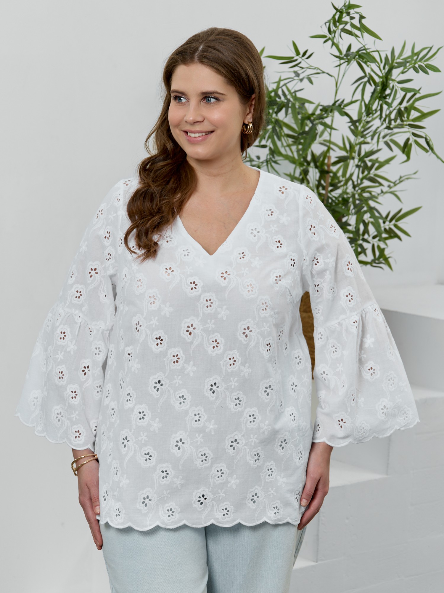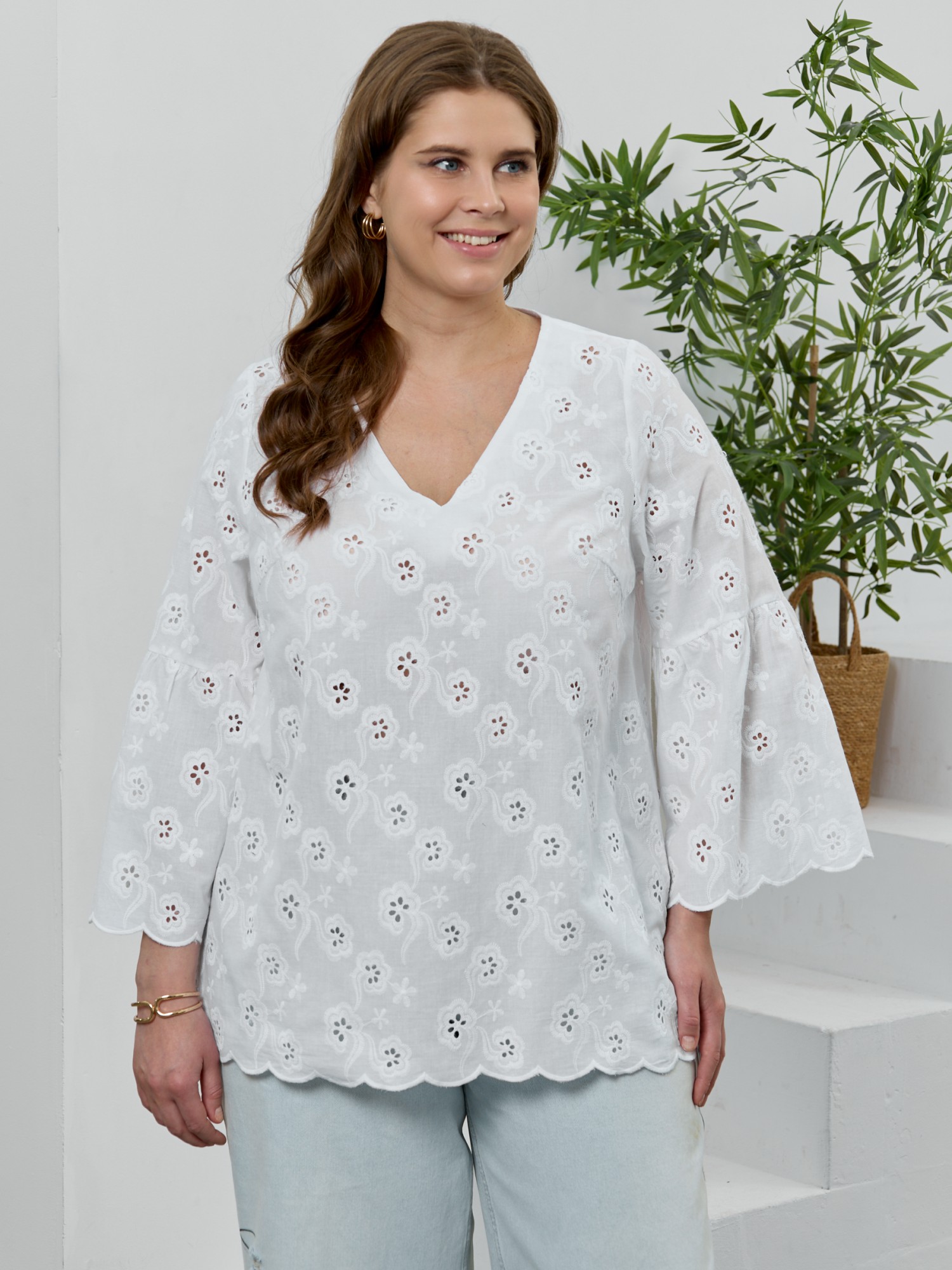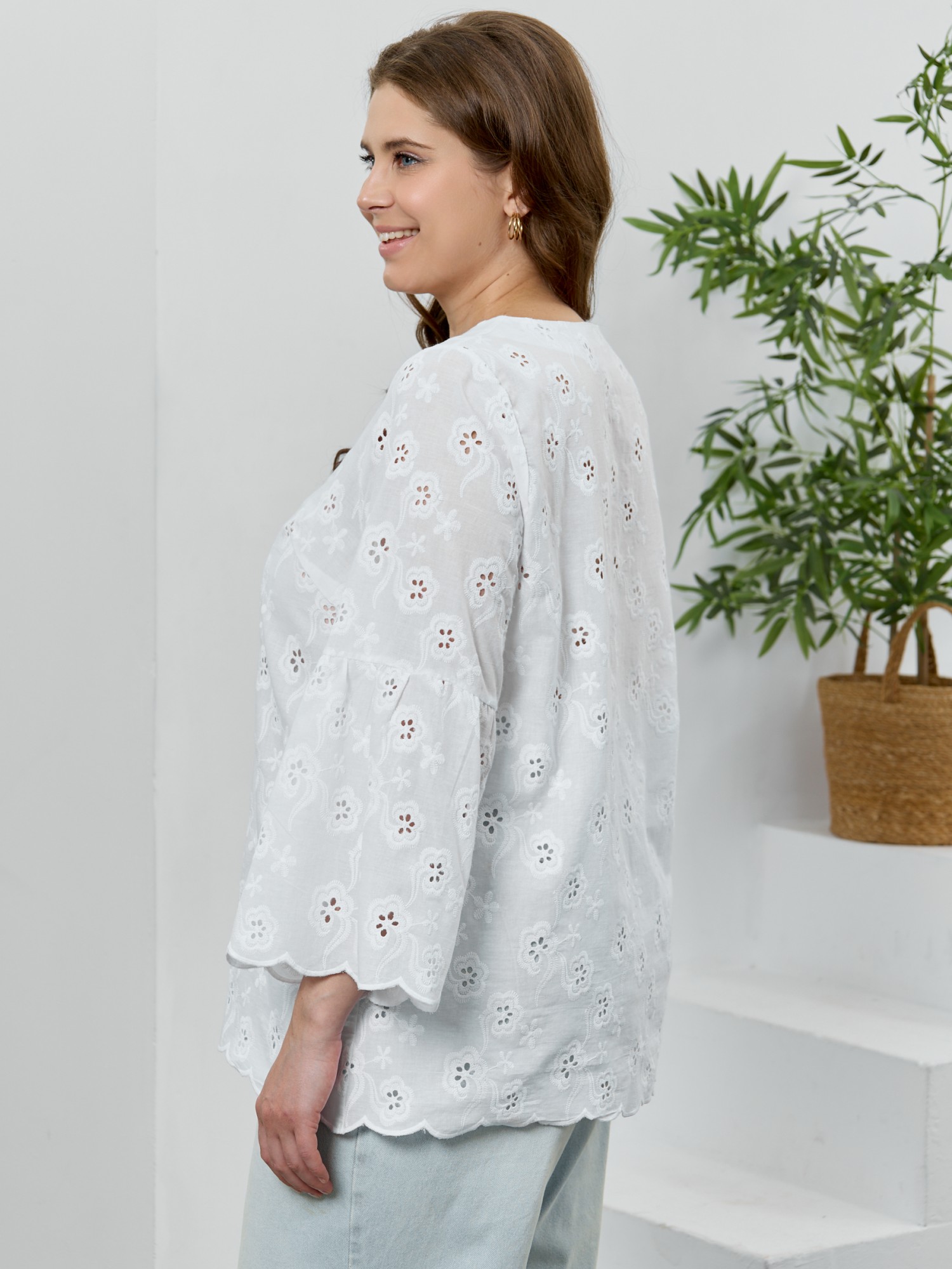 Блузка женская из тканого гладкокрашеного полотна «шитье» прямого силуэта, с V- образной горловиной, внутренней обтачкой, длинными втачными рукавами, слегка расширенными книзу, присборенными на уровне локтевого сгиба. Нижние срезы рукавов и изделия с «фестонным» краем.