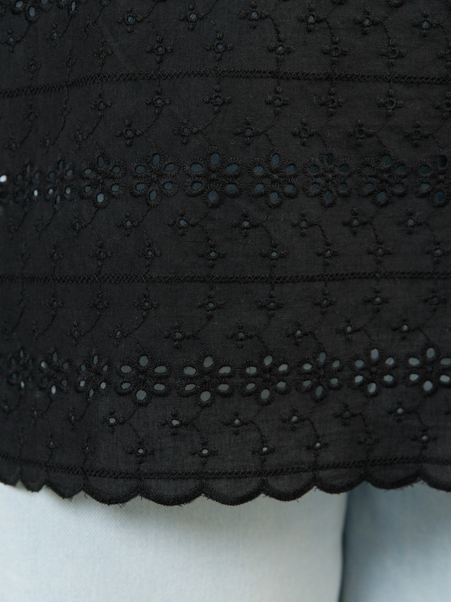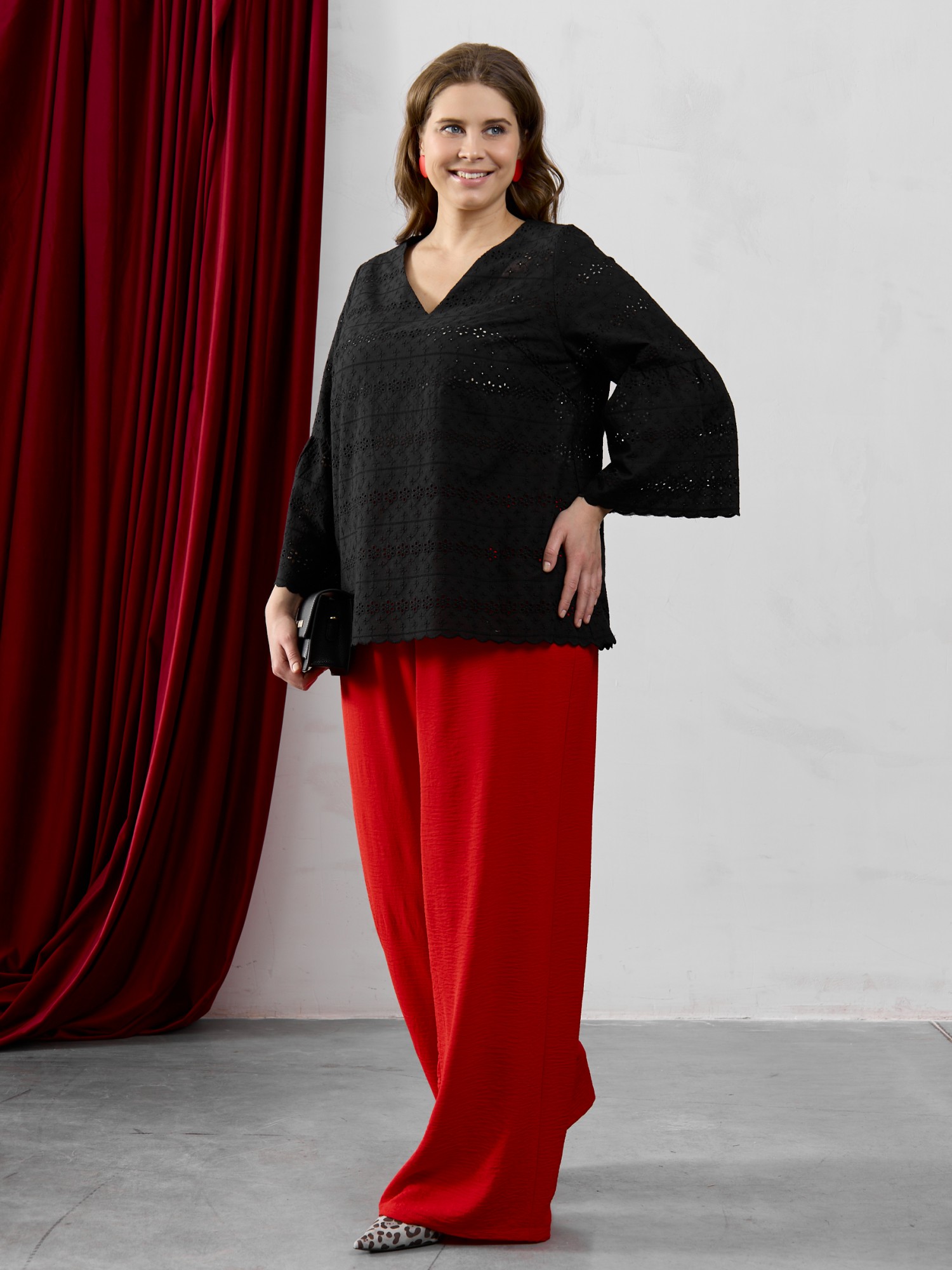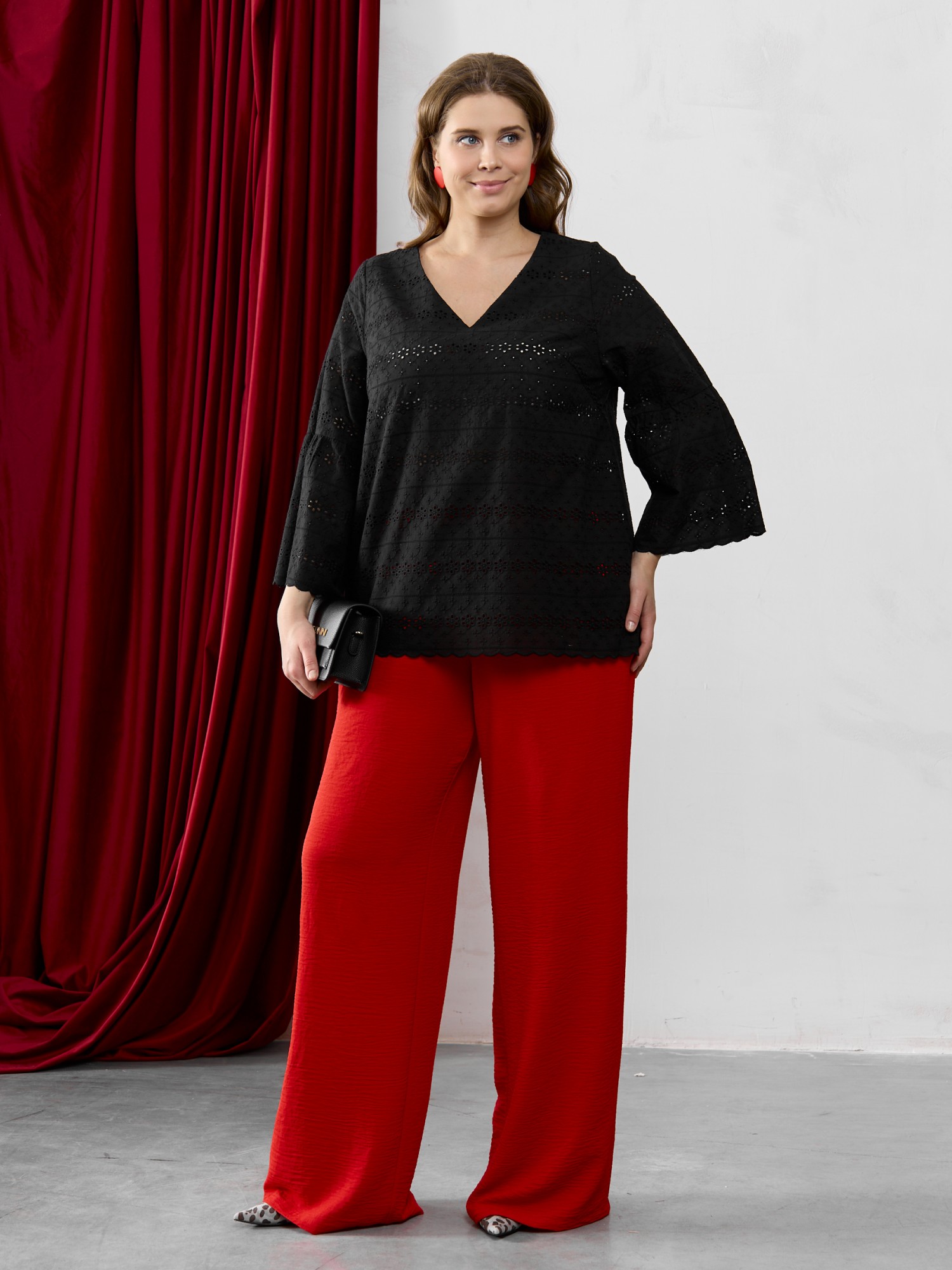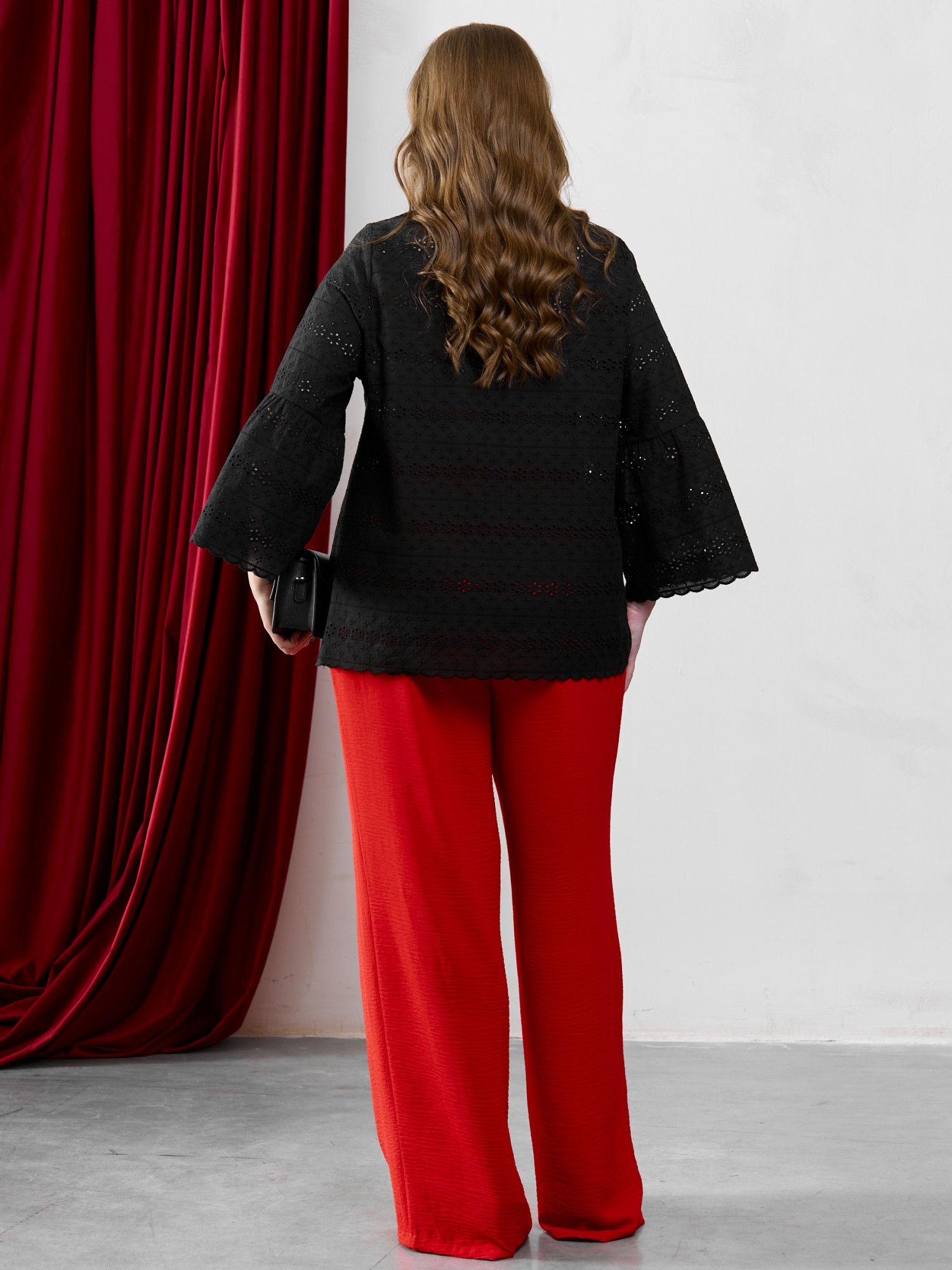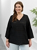 Блузка женская из тканого гладкокрашеного полотна «шитье» прямого силуэта, с V- образной горловиной, внутренней обтачкой, длинными втачными рукавами, слегка расширенными книзу, присборенными на уровне локтевого сгиба. Нижние срезы рукавов и изделия с «фестонным» краем.