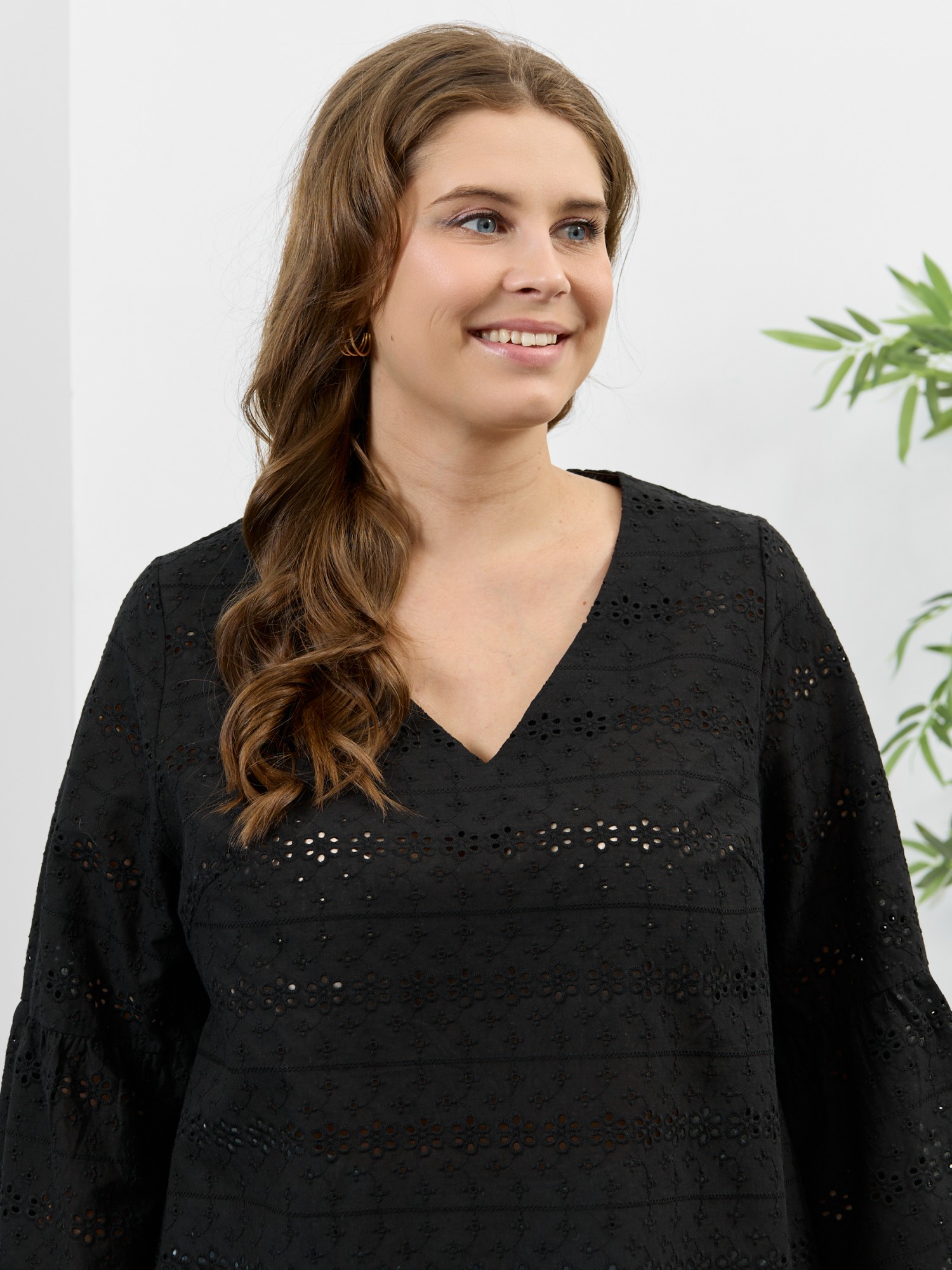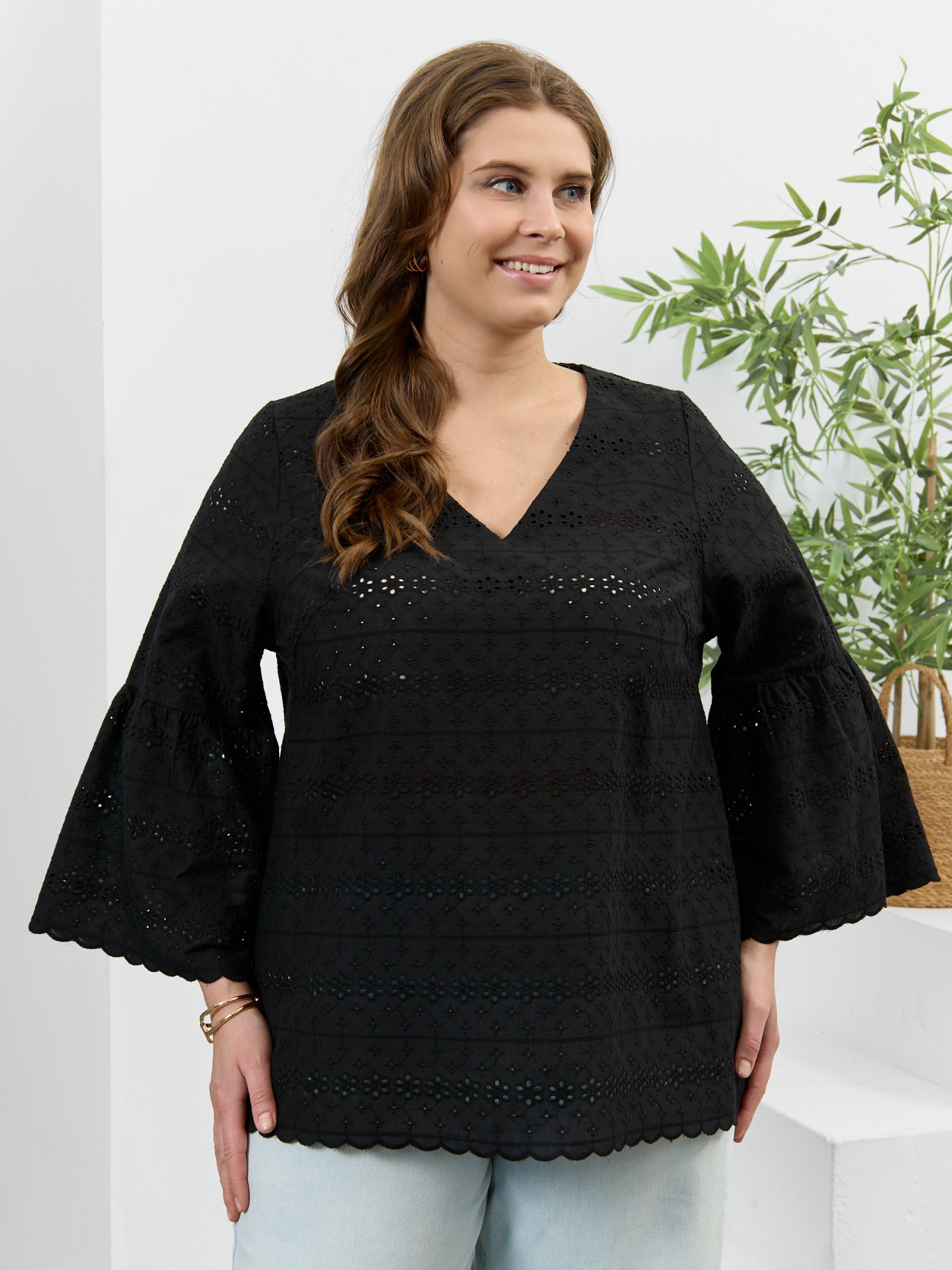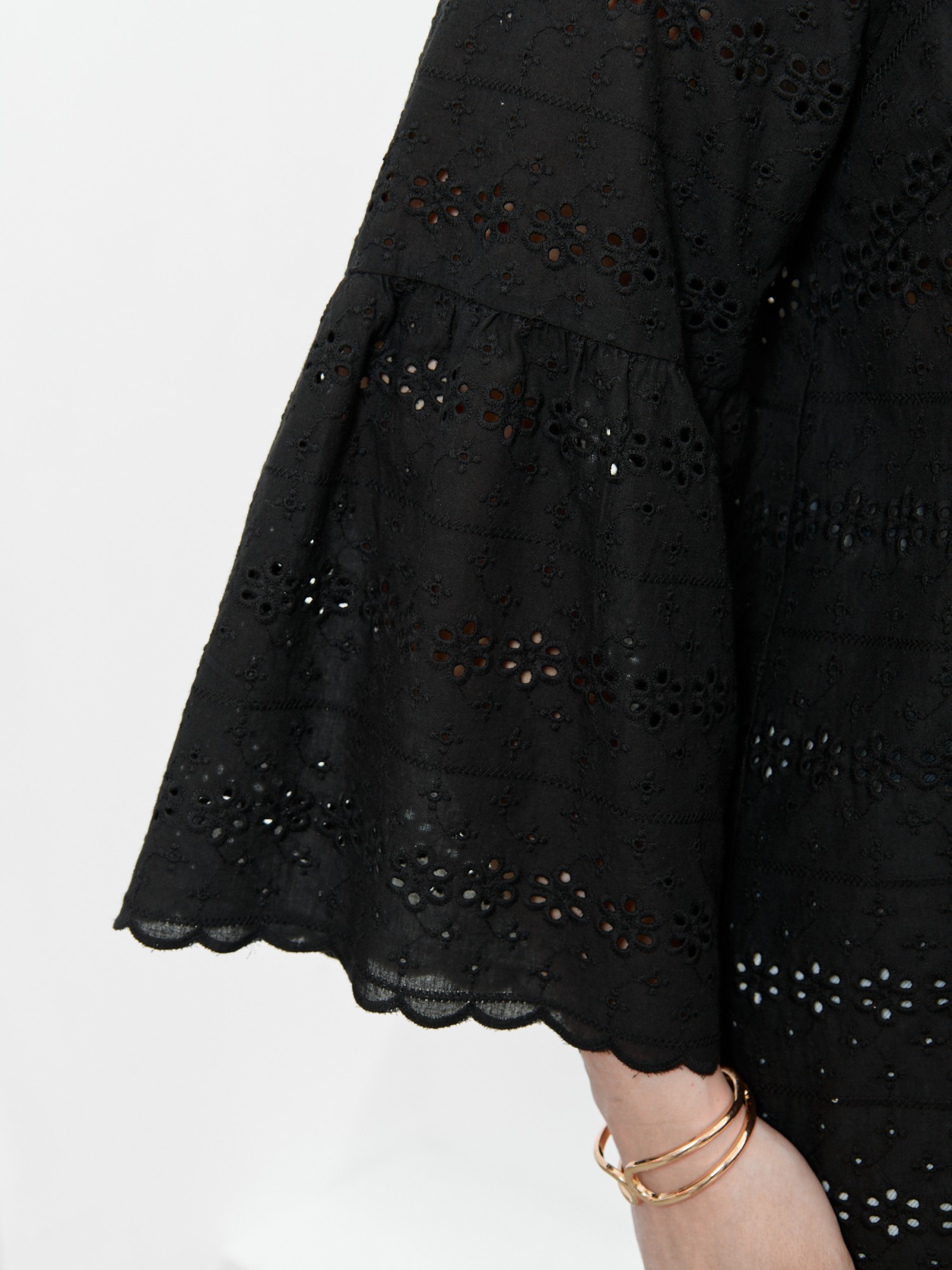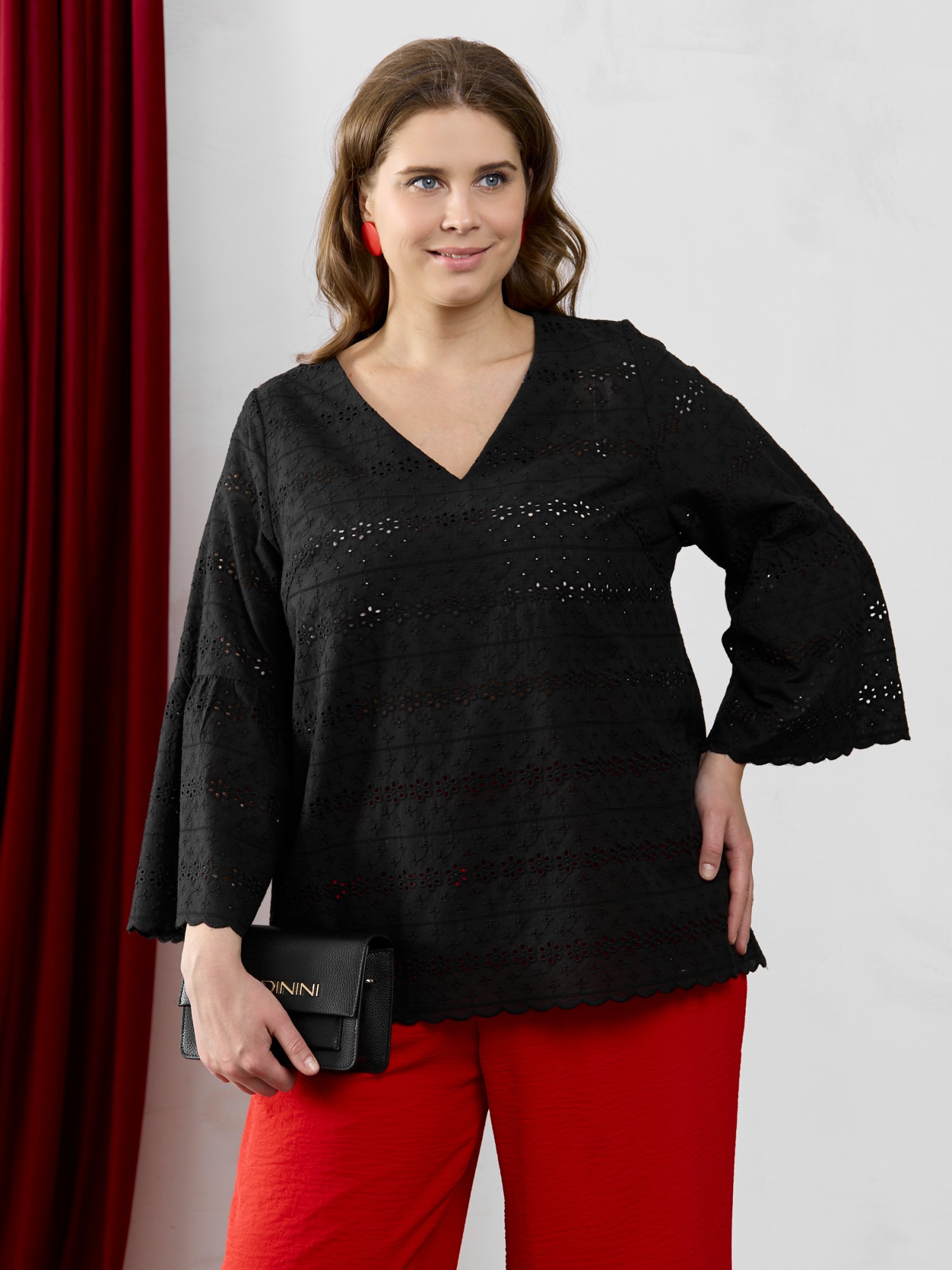 Блузка женская из тканого гладкокрашеного полотна «шитье» прямого силуэта, с V- образной горловиной, внутренней обтачкой, длинными втачными рукавами, слегка расширенными книзу, присборенными на уровне локтевого сгиба. Нижние срезы рукавов и изделия с «фестонным» краем.
