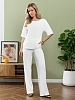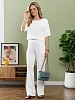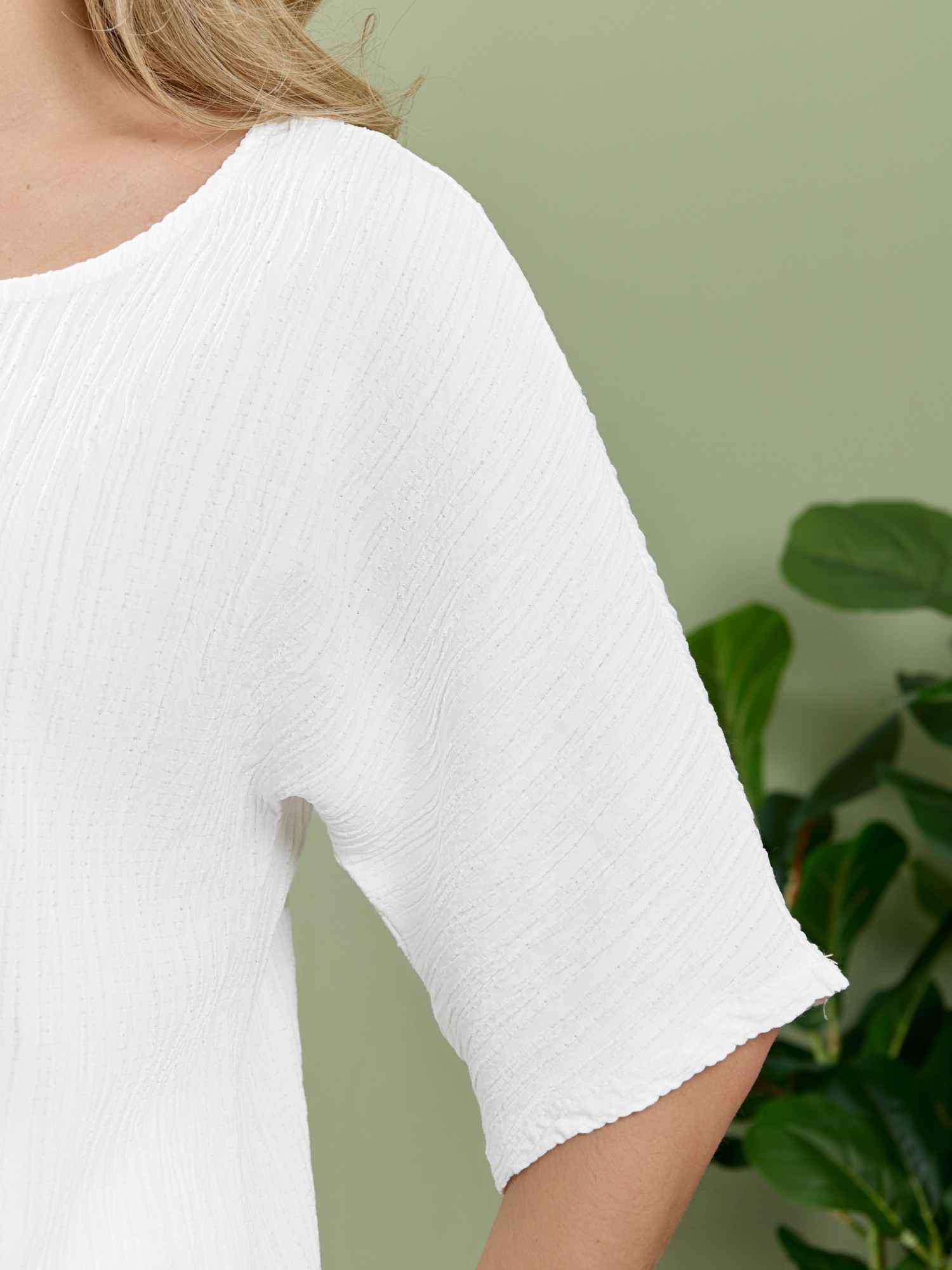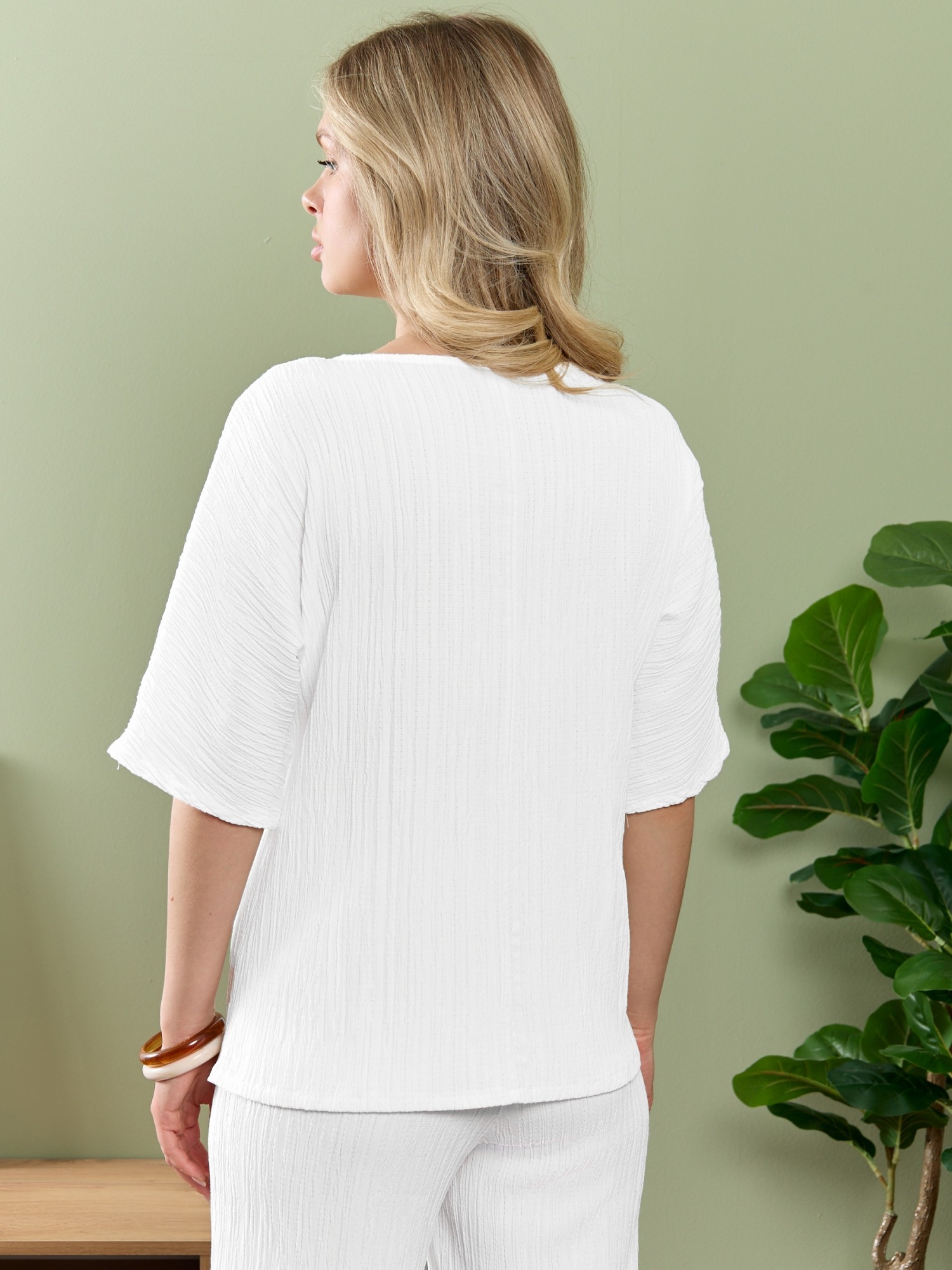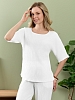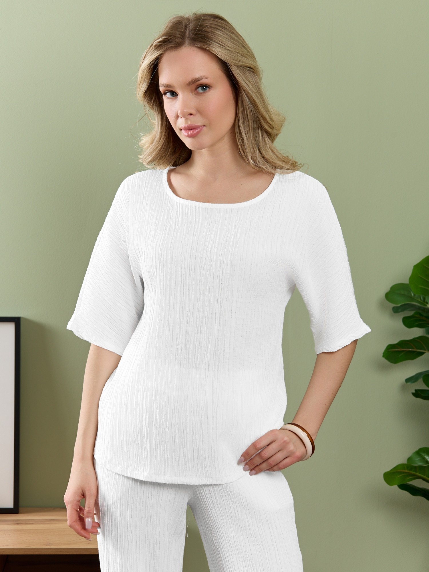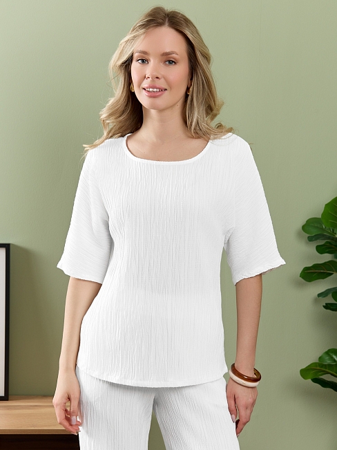 Блуза женская из гладкокрашеного тканого полотна, прямого силуэта, с горловиной овальной формы и цельнокроеными рукавами длиной до локтя. Горловина окантована основным материалом.