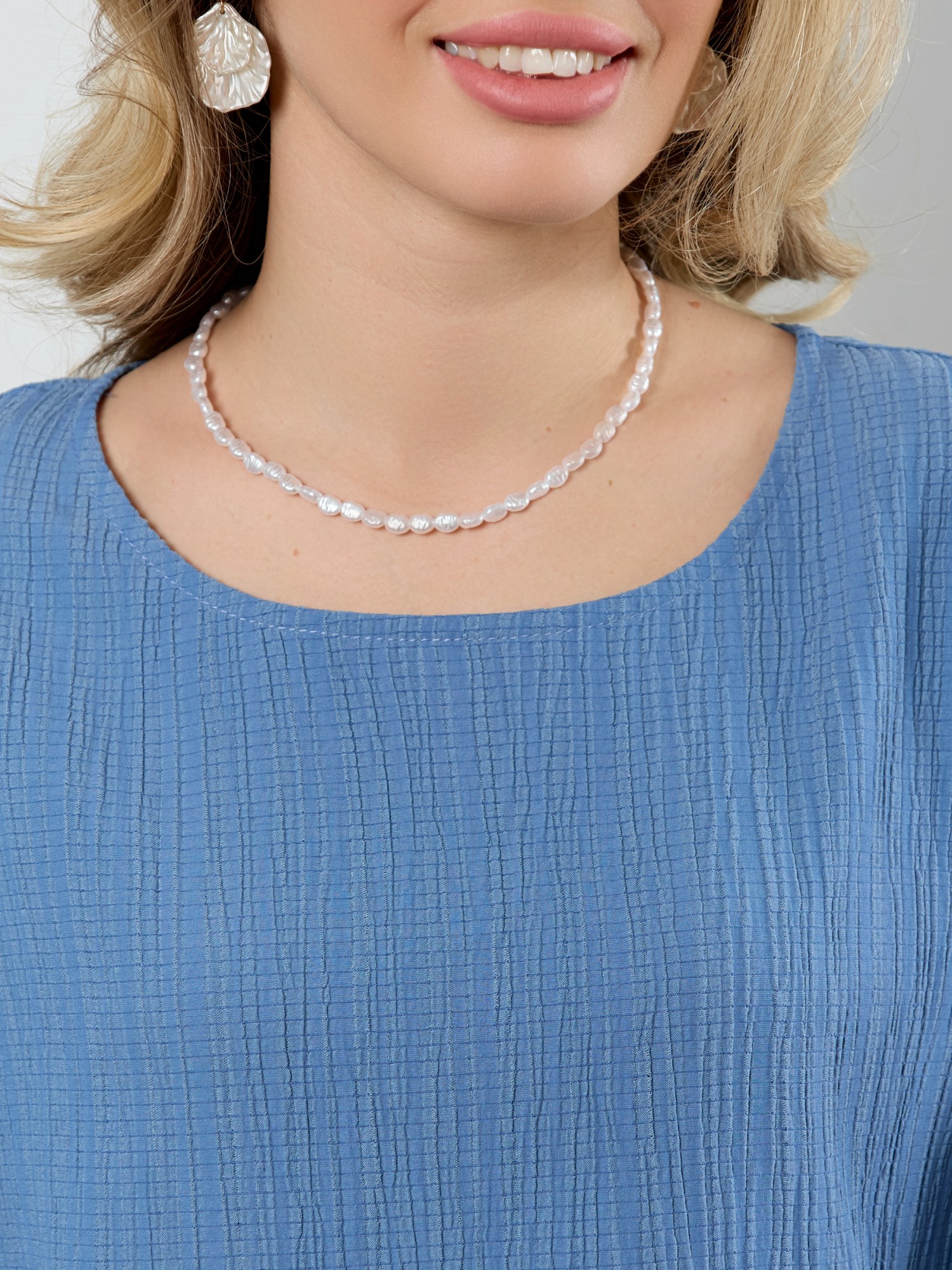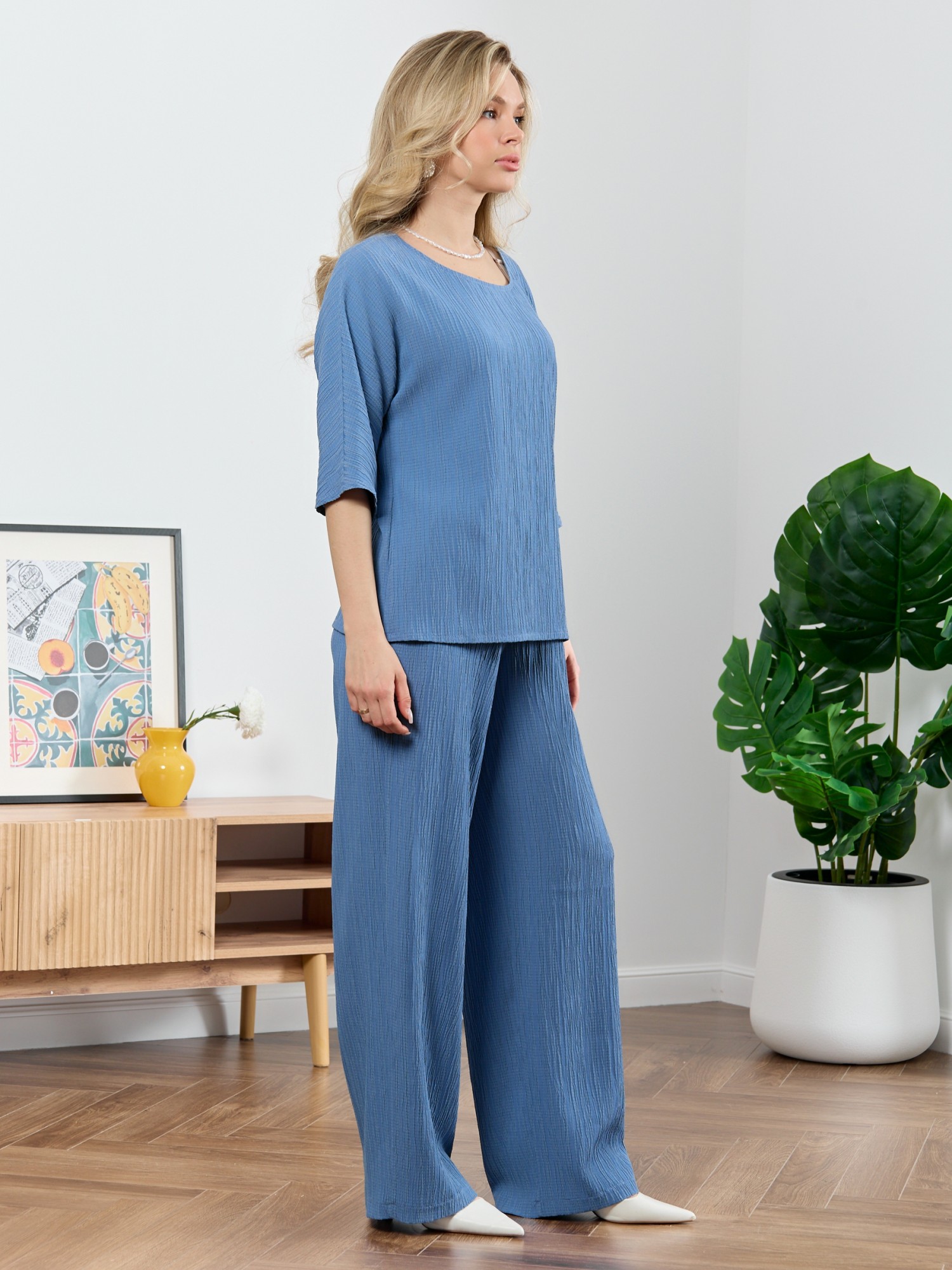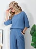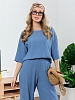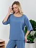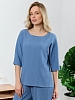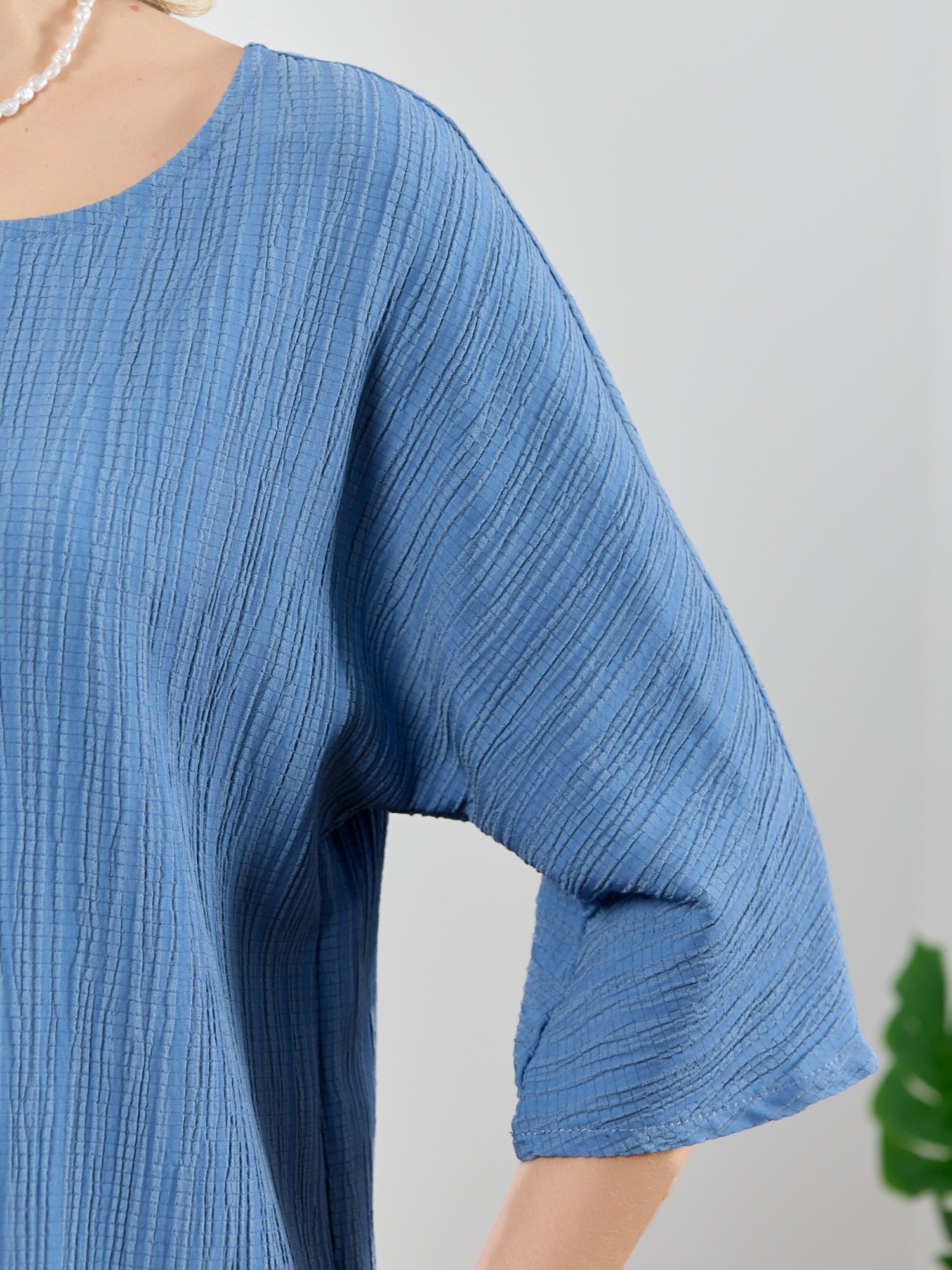 Блуза женская из гладкокрашеного тканого полотна, прямого силуэта, с горловиной овальной формы и цельнокроеными рукавами длиной до локтя. Горловина окантована основным материалом.