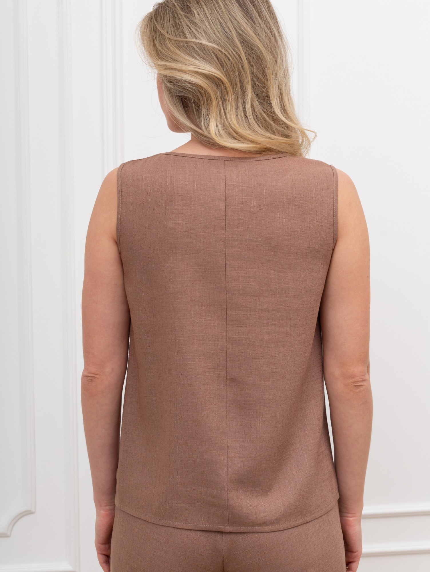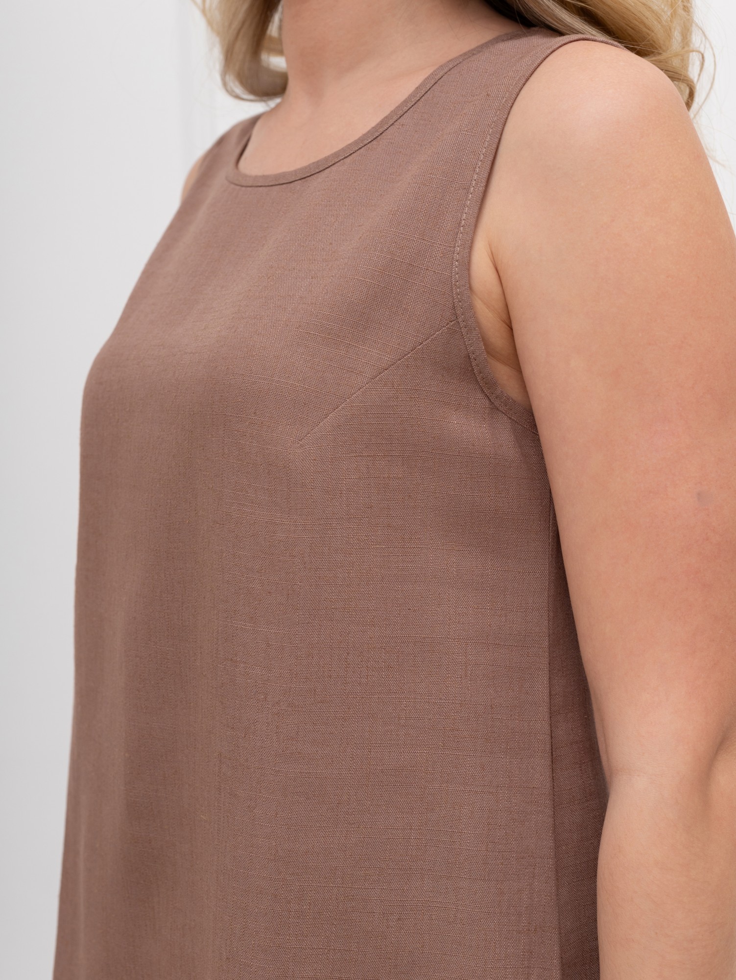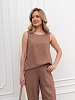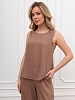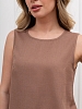Блузка-топ женская из гладкокрашеного тканого полотна, полуприталенного силуэта, без рукавов, с горловиной овальной формы. Горловина и проймы окантованы основным материалом.
