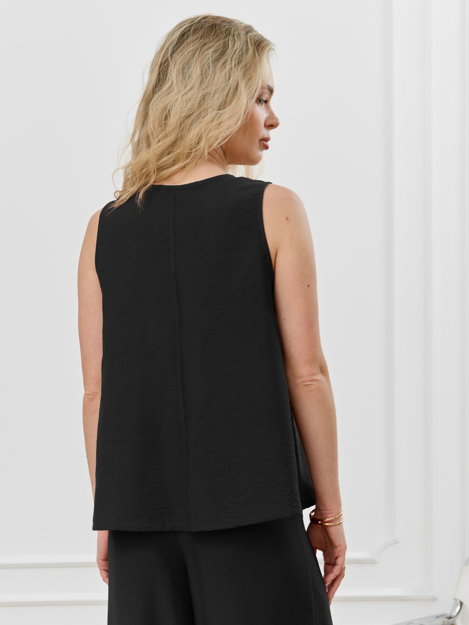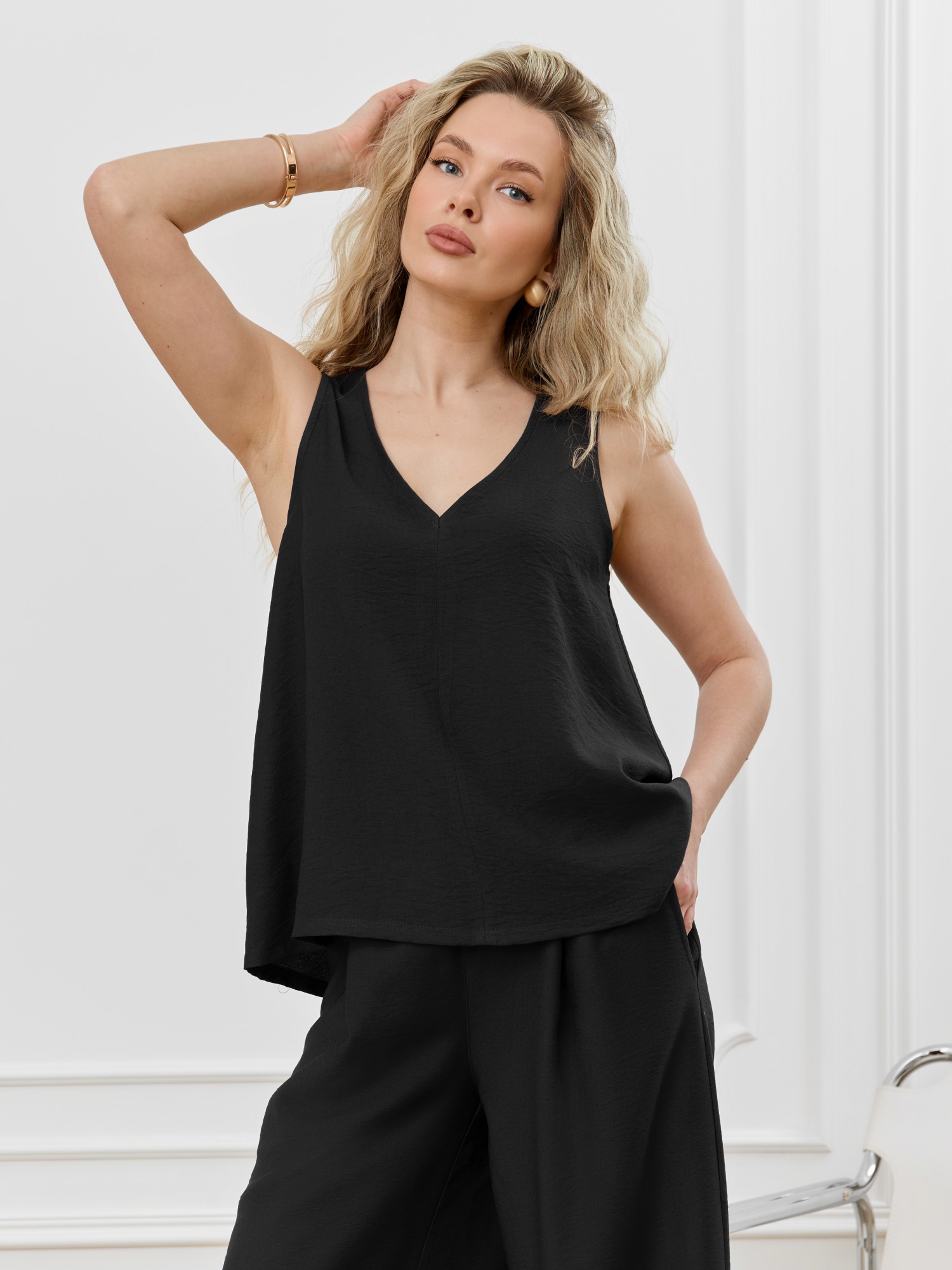 Блуза - топ из гладкокрашеного фактурного полотна средней длины, расширенный книзу, с горловиной v-образной формы. Полочка и спинка - со средними швами. Горловина и проймы окантованы основным материалом, низ изделия обработан подгибкой.