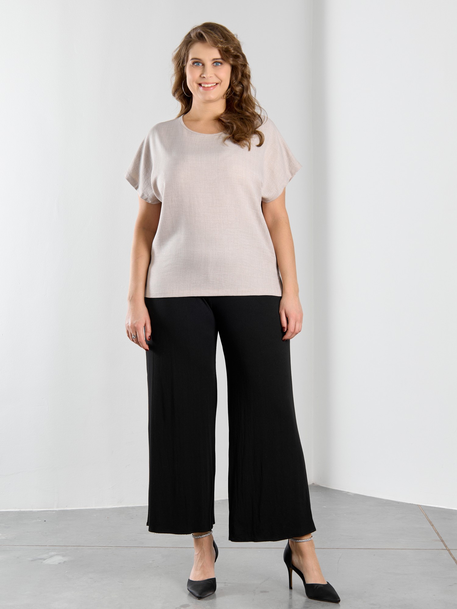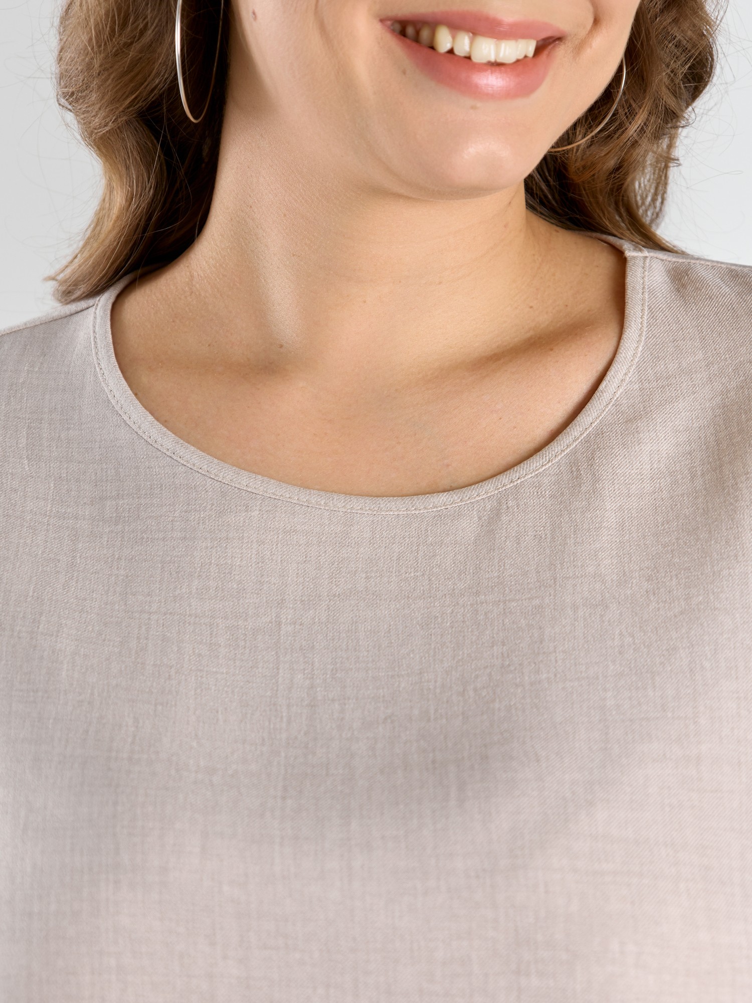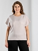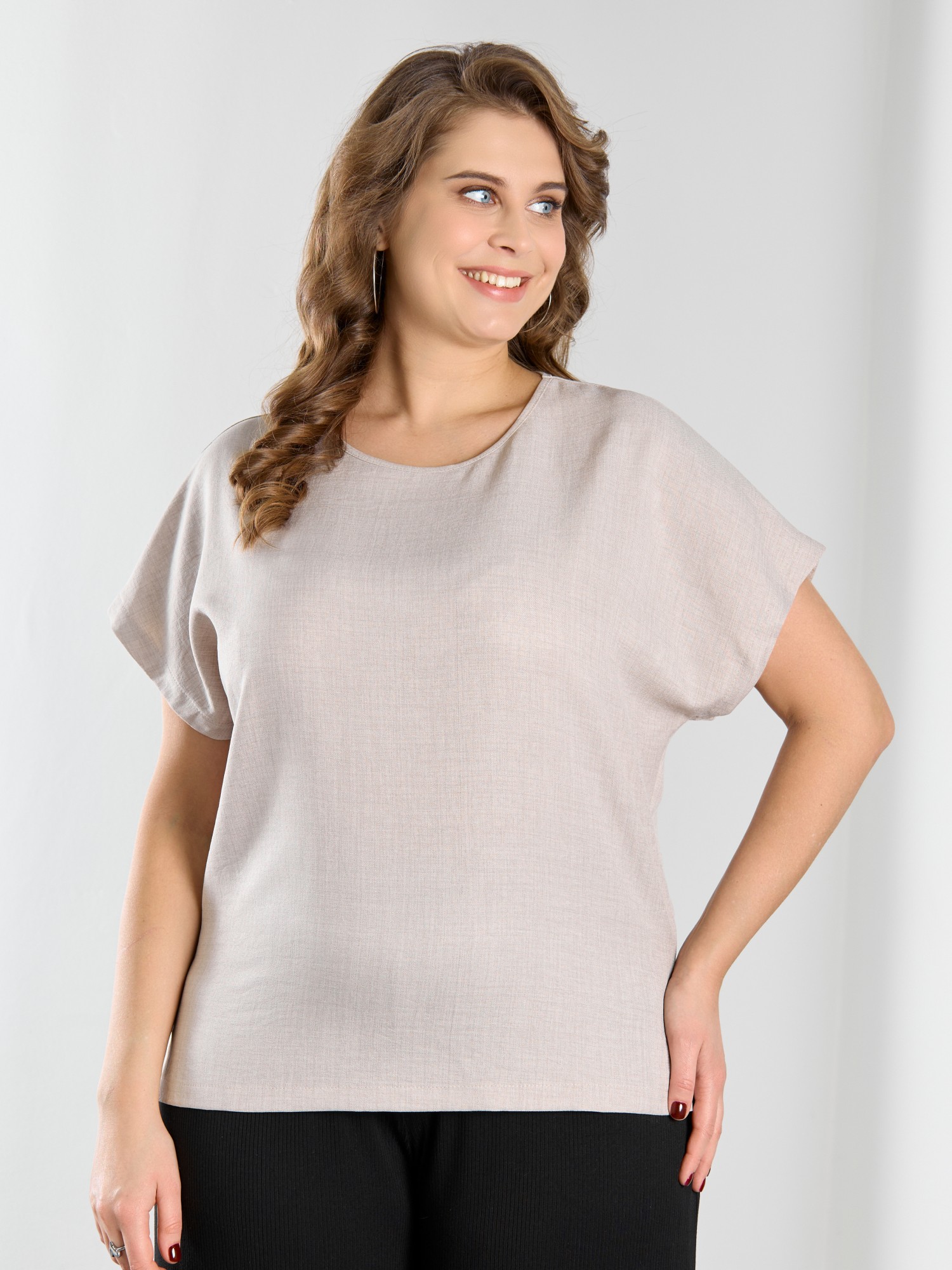 Блуза женская из гладкокрашеного тканого полотна, прямого силуэта, с горловиной овальной формы и цельнокроеными рукавами. Горловина окантована основным материалом, в боковых швах небольшие разрезы.