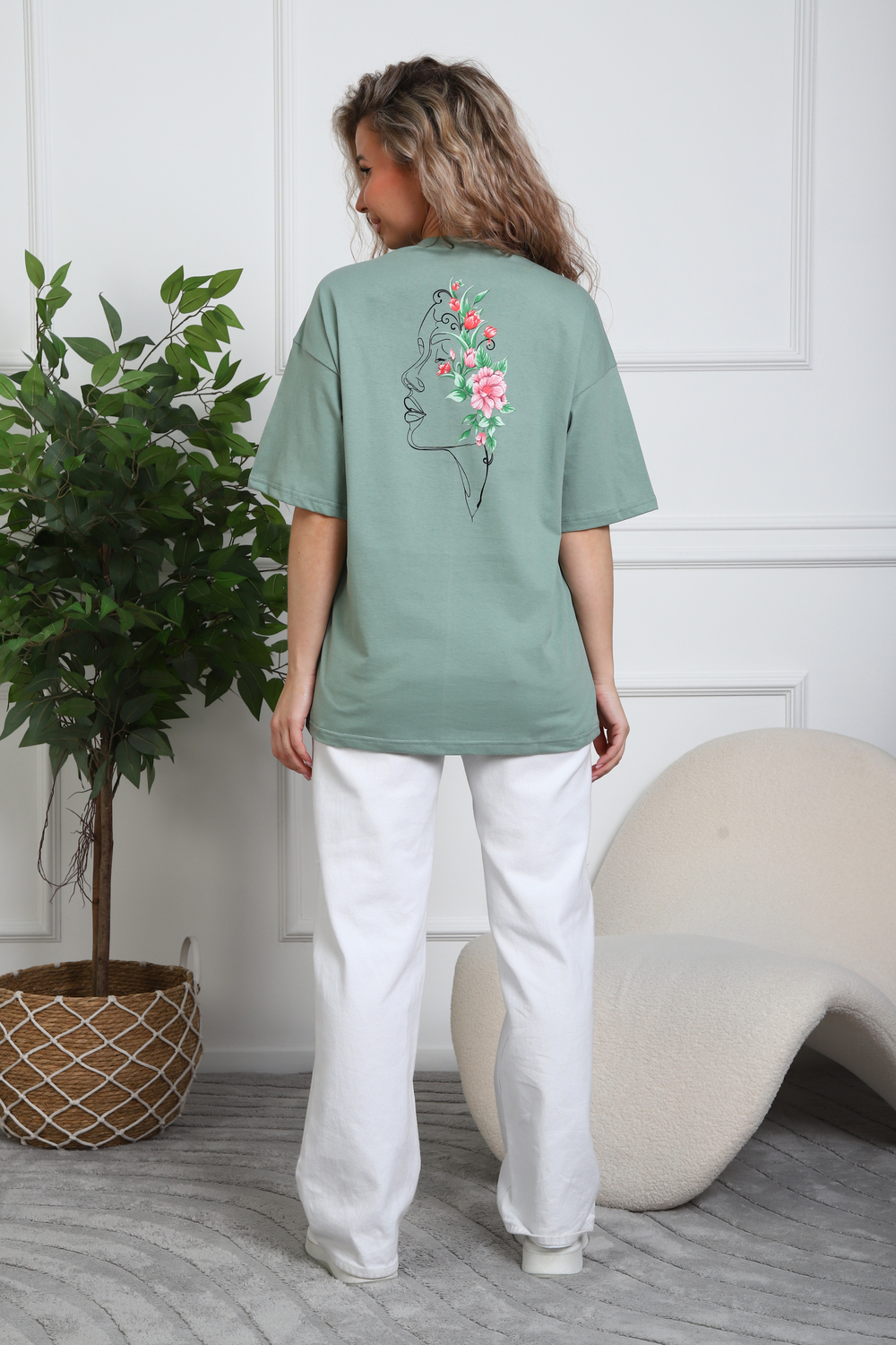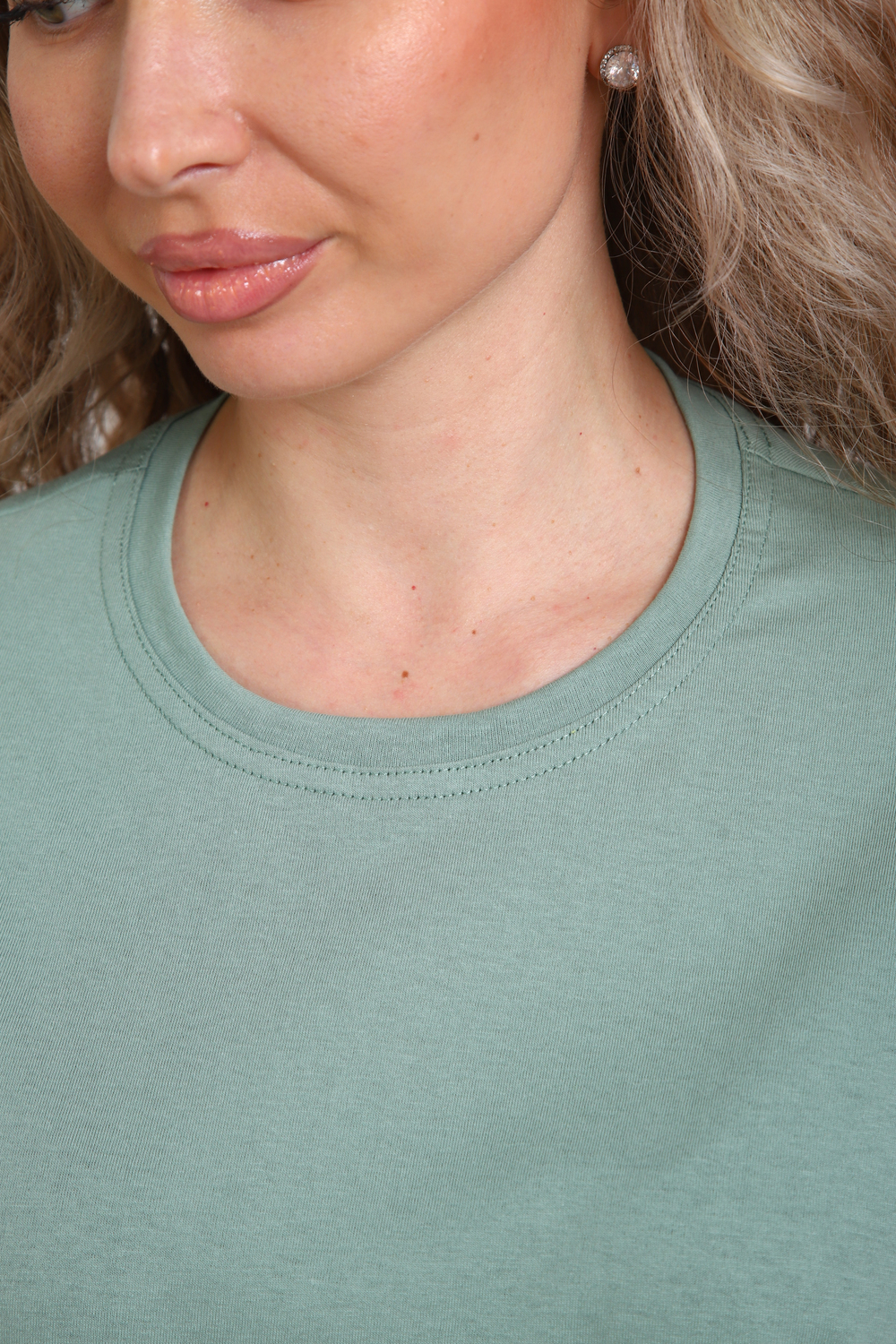 Футболка женская прямого силуэта, с коротким рукавом. Горловина приточная, круглой формы, с отделочной строчкой. Принт на задней полочке изделия.