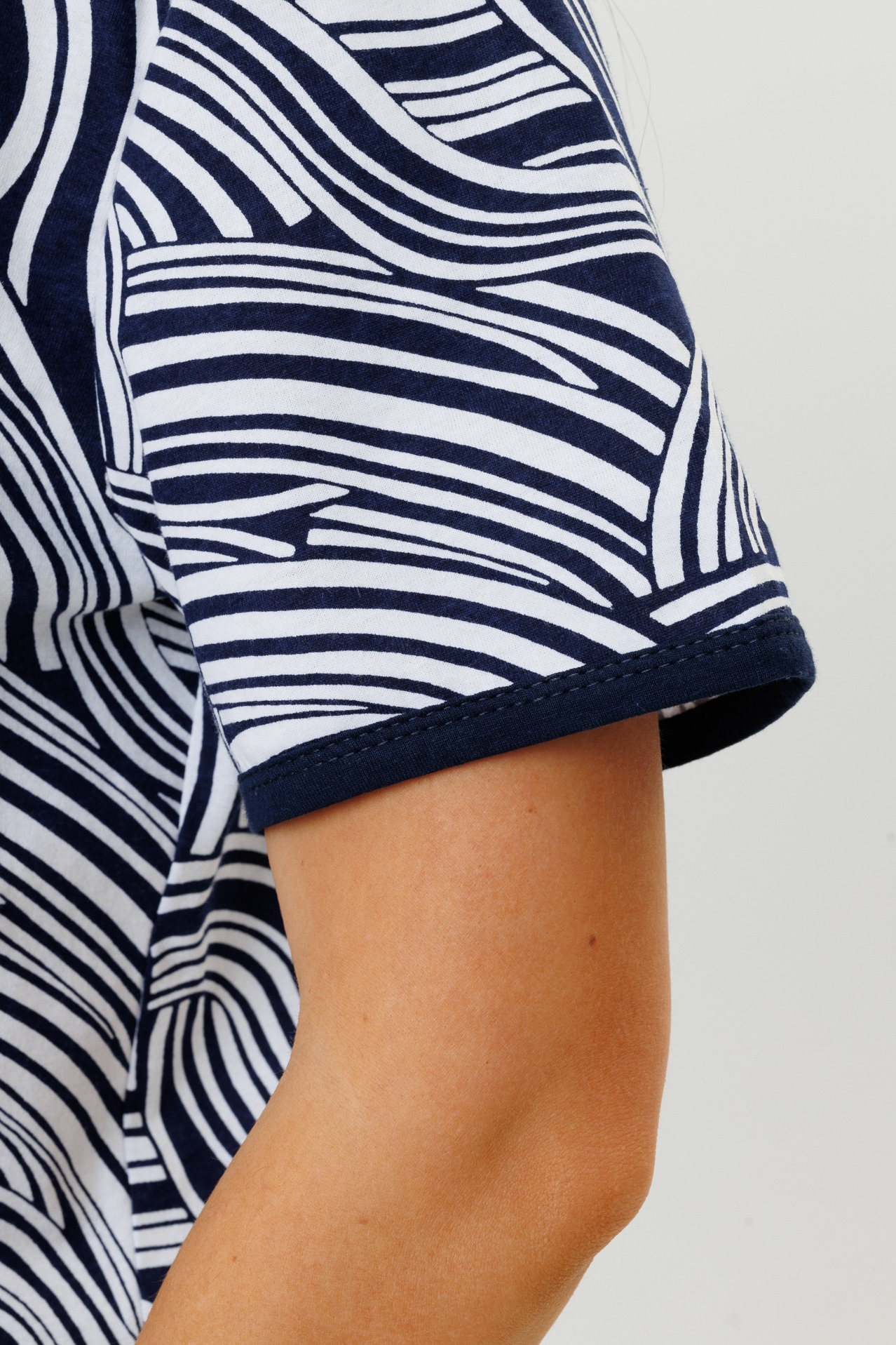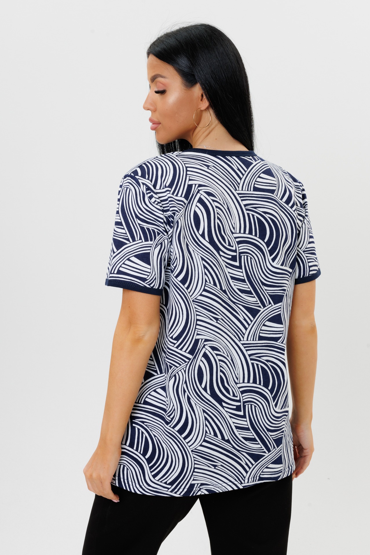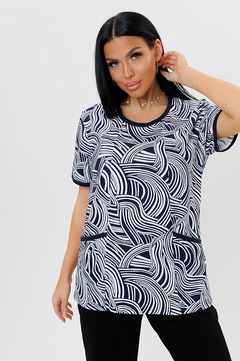 Женская футболка 2198 / Темно-синий с короткими рукавами, отшивается из трикотажного полотна - кулирки (100% хлопок). Футболка с карманами имеет широкий размерный ряд и всегда актуальный принт в горошек.