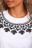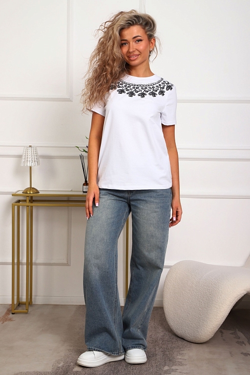 Футболка женская прямого силуэта. Низ изделия прямой. Длинна до середины бедра, плечо на естественном месте, рукав короткий. Горловина круглой формы, обработана планкой . Принт (шелкография пуф) в виде кружевного воротника.