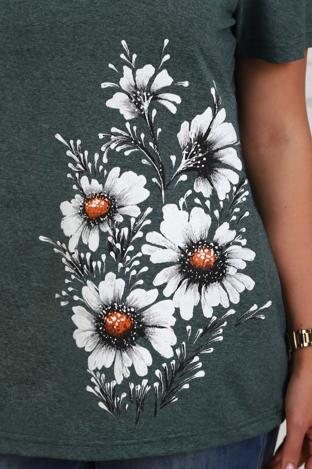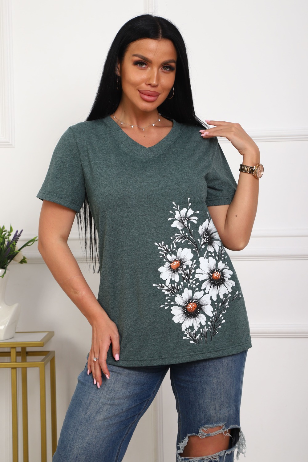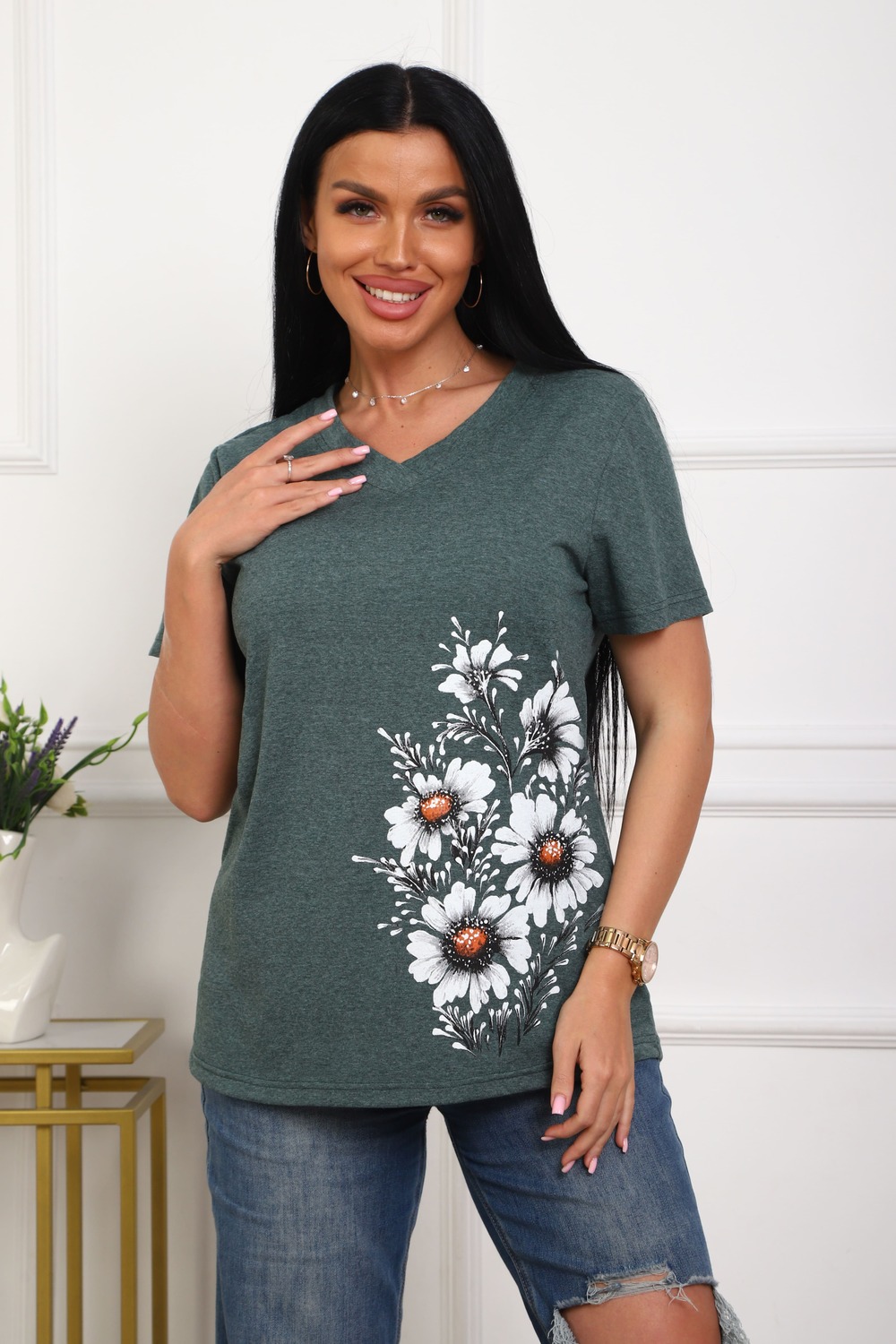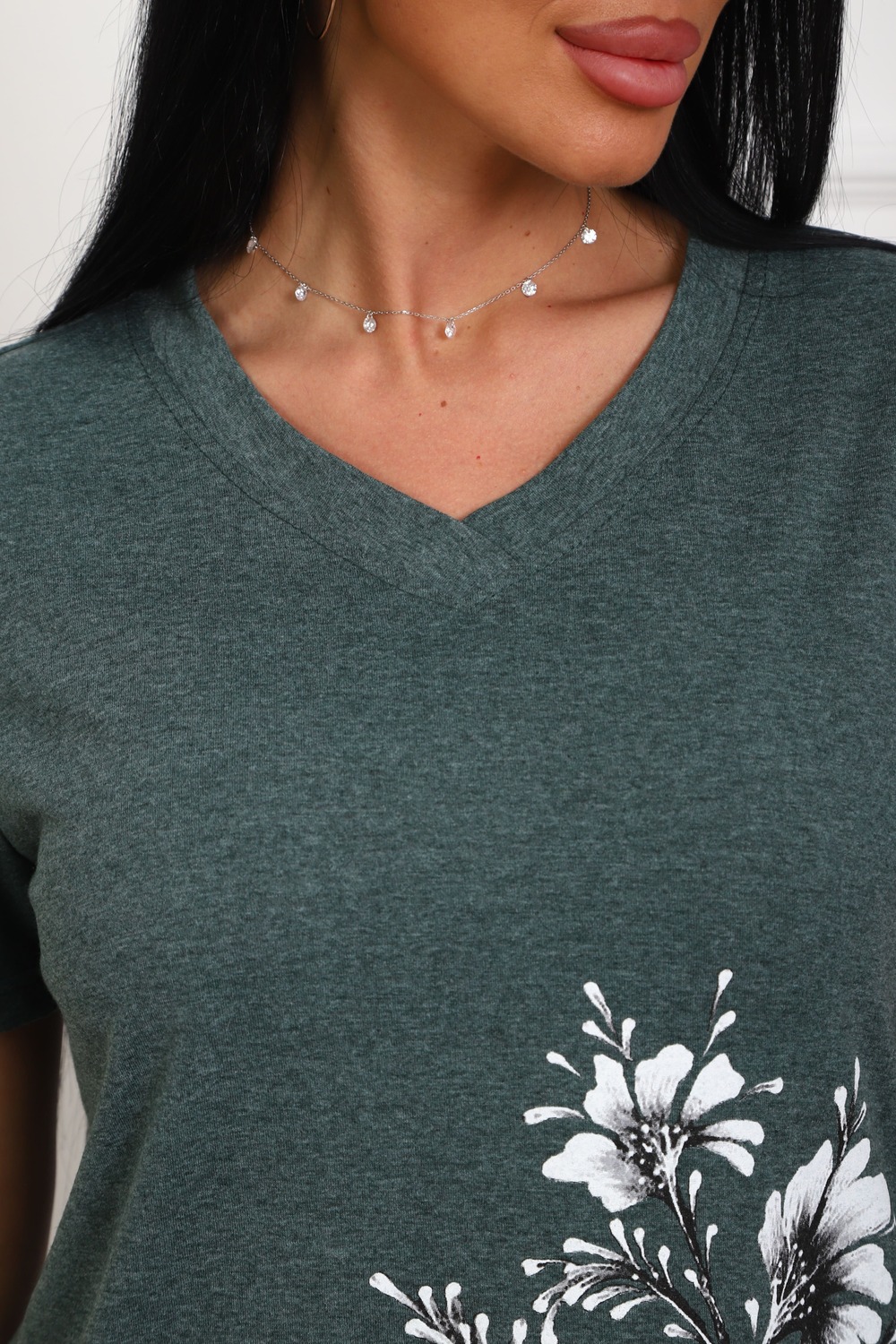 Футболка женская полуприлегающего силуэта из меланжированного трикотажа. Низ изделия прямой. Длинна до середины бедра, плечо на естественном месте, рукав короткий. Горловина V-образной формы, обработана планкой . Принт (шелкография ) на полочке с левой стороны.