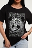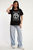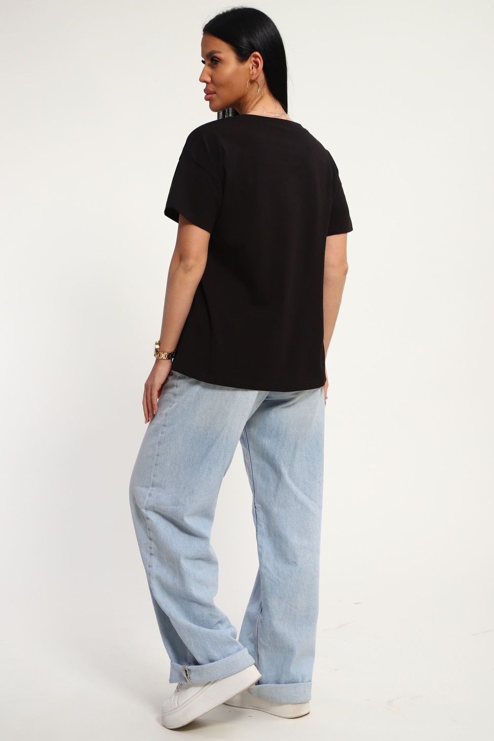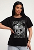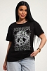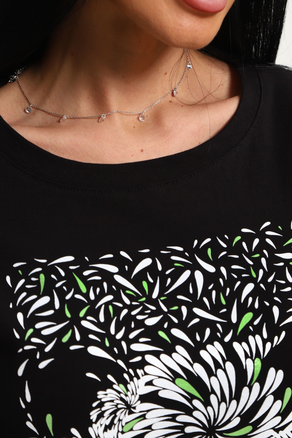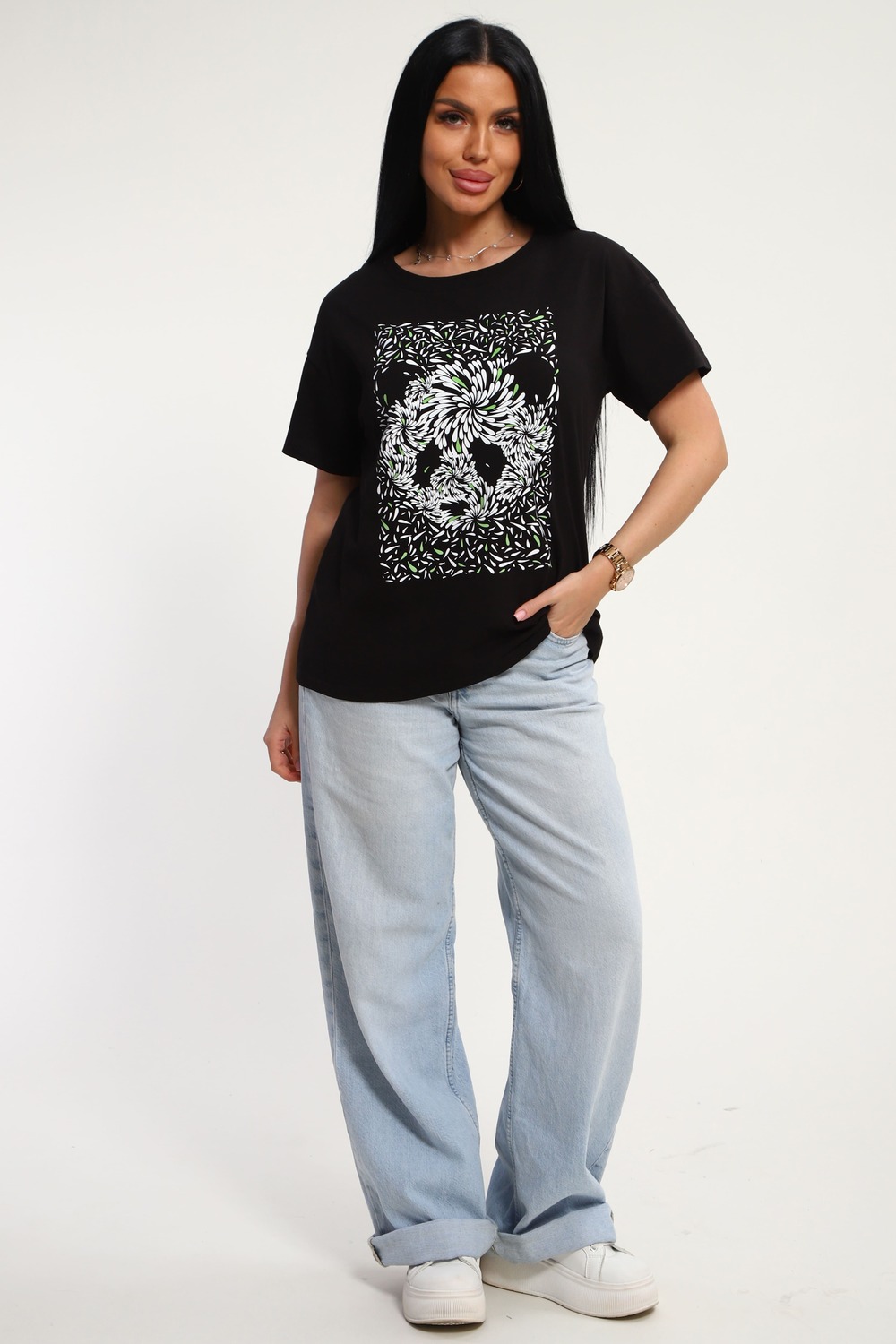 Футболка женская из гладкокрашеного трикотажа, хлопок 100%. Прямого силуэта, свободного облегания. горловина круглой формы. Рукав короткий. Низ изделия прямой. На полочке принт, шелкография.