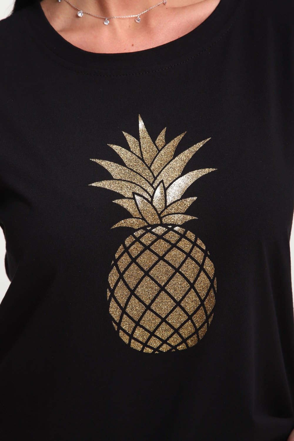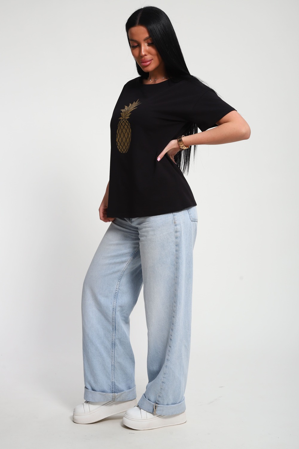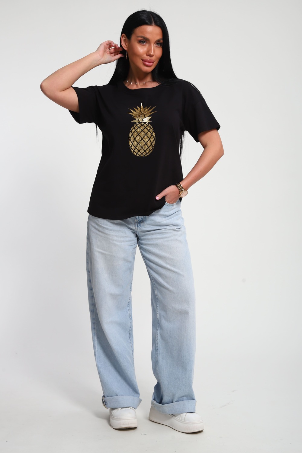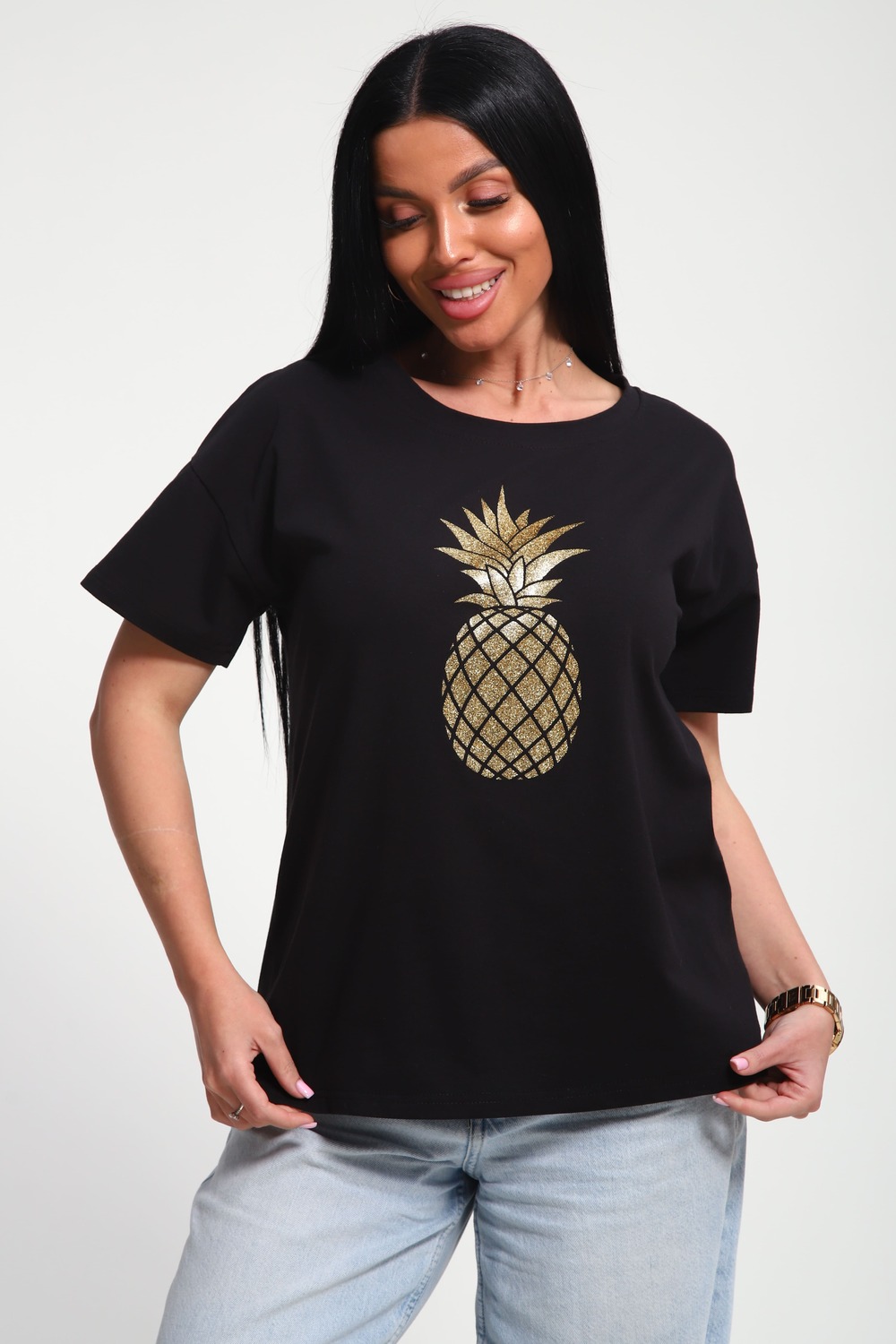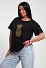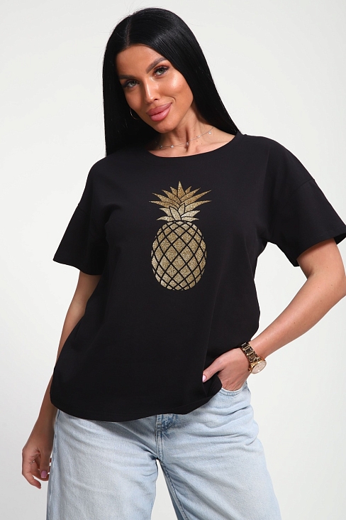 Футболка женская из гладкокрашеного трикотажа, хлопок 100%. Прямого силуэта, свободного облегания. горловина круглой формы. Рукав короткий. Низ изделия прямой. На полочке блестящий принт, шелкография.
